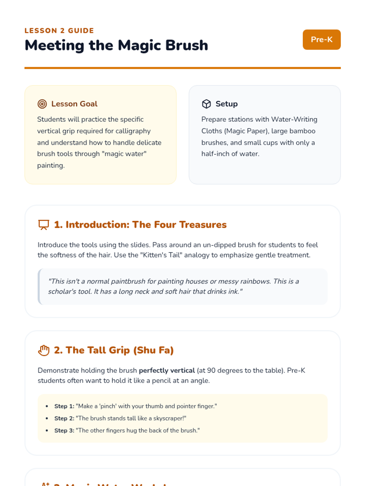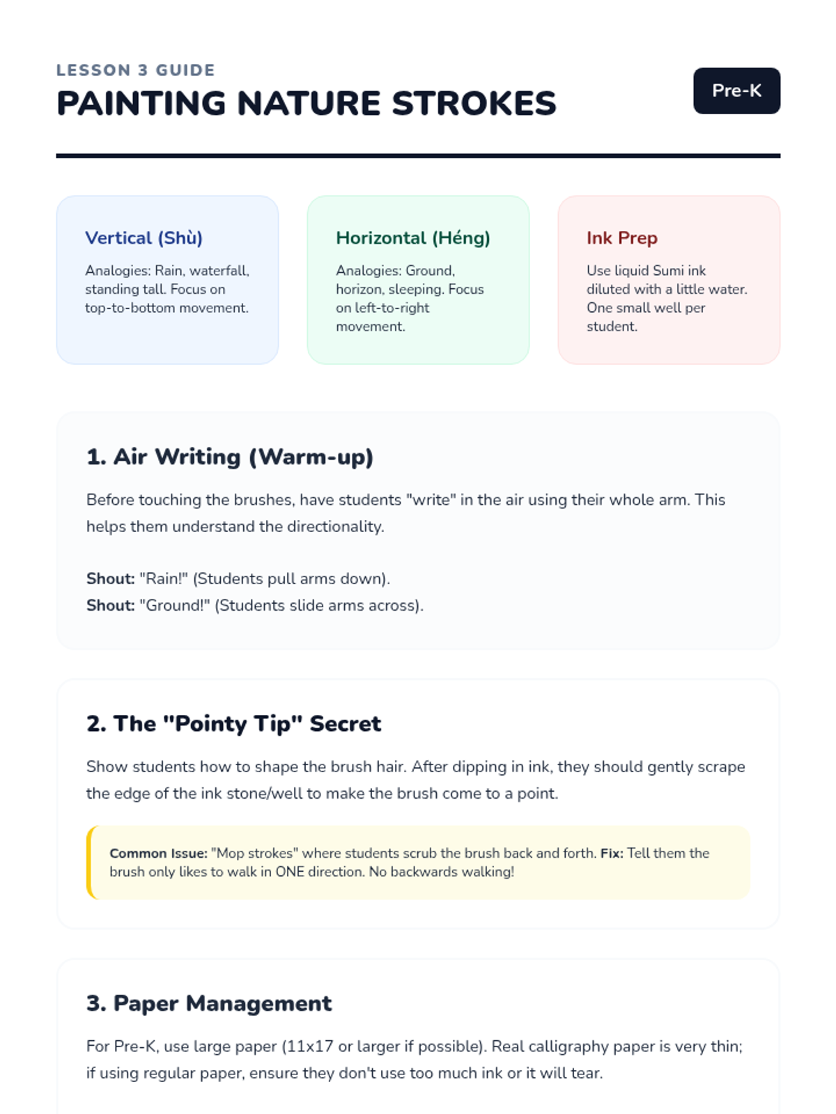A 5-lesson sequence for Pre-K students exploring the connection between nature, pictographs, and the art of Chinese calligraphy through hands-on brush painting and sensory play.