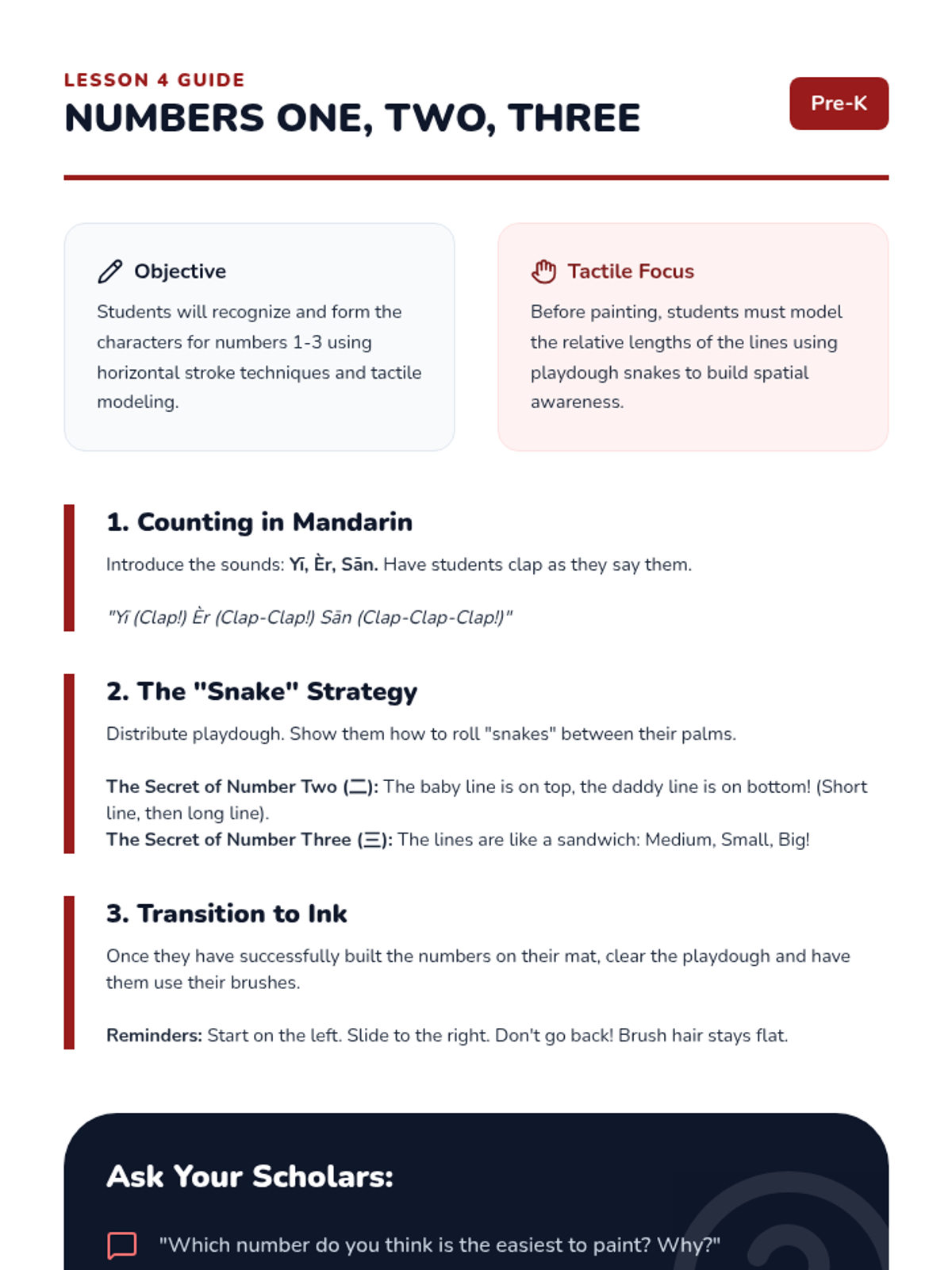 A foundational sequence for Pre-K learners to explore the four tones of Mandarin Chinese through auditory play, physical movement, and vocal exploration. Students learn to associate pitch changes with meaning using relatable sounds like questioning 'Huh?' or firm 'No!' gestures.