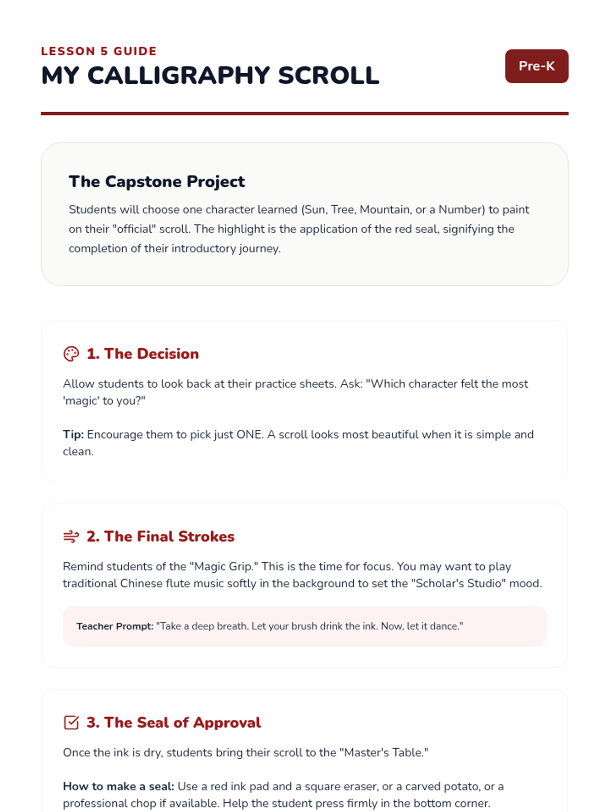 An immersive sequence for Pre-K students exploring Chinese cultural traditions through sensory-rich activities, stories, and hands-on crafts. Students learn about the Lunar New Year, artistic brushwork, polite social customs, and the collaborative dragon dance.