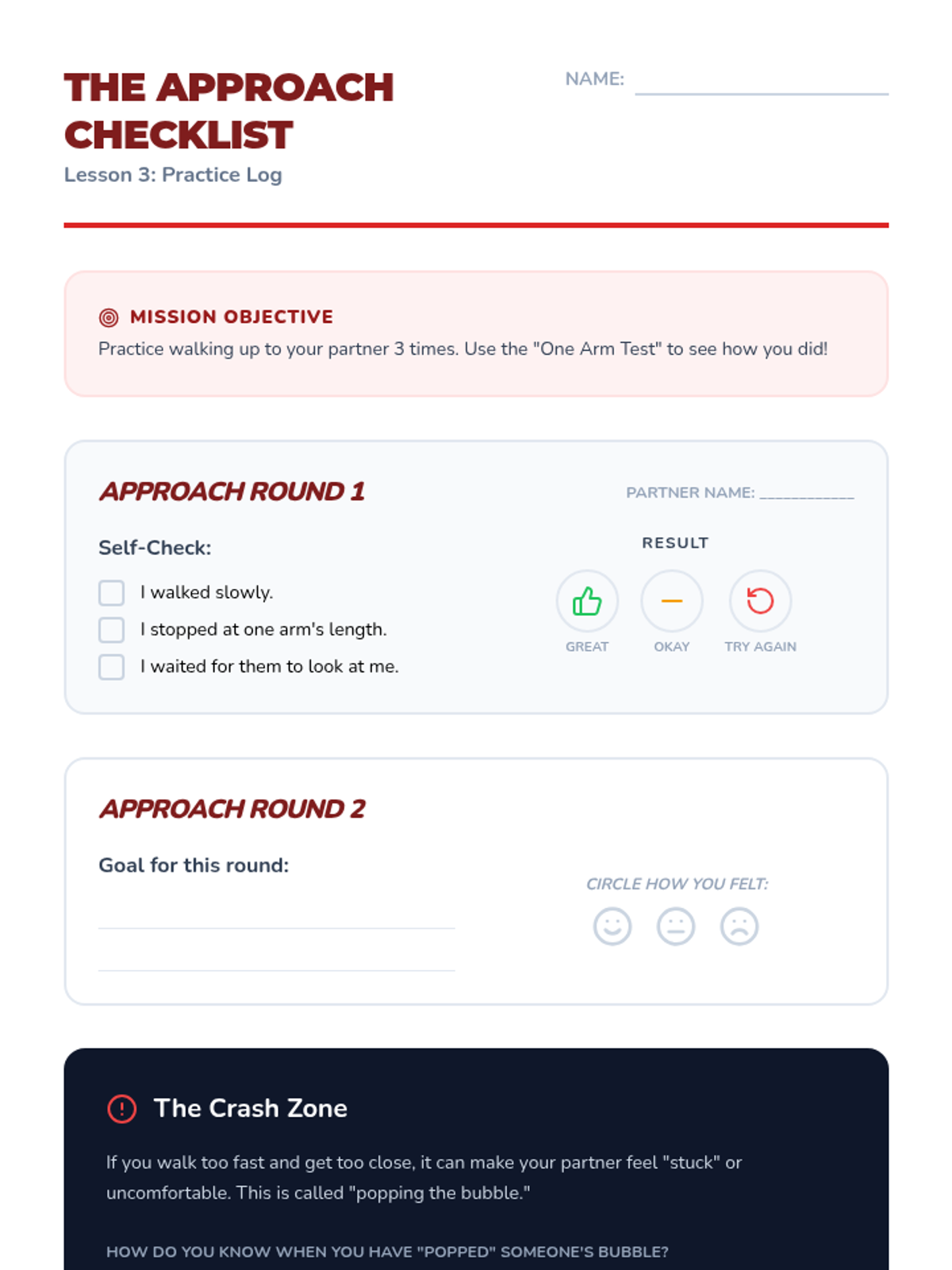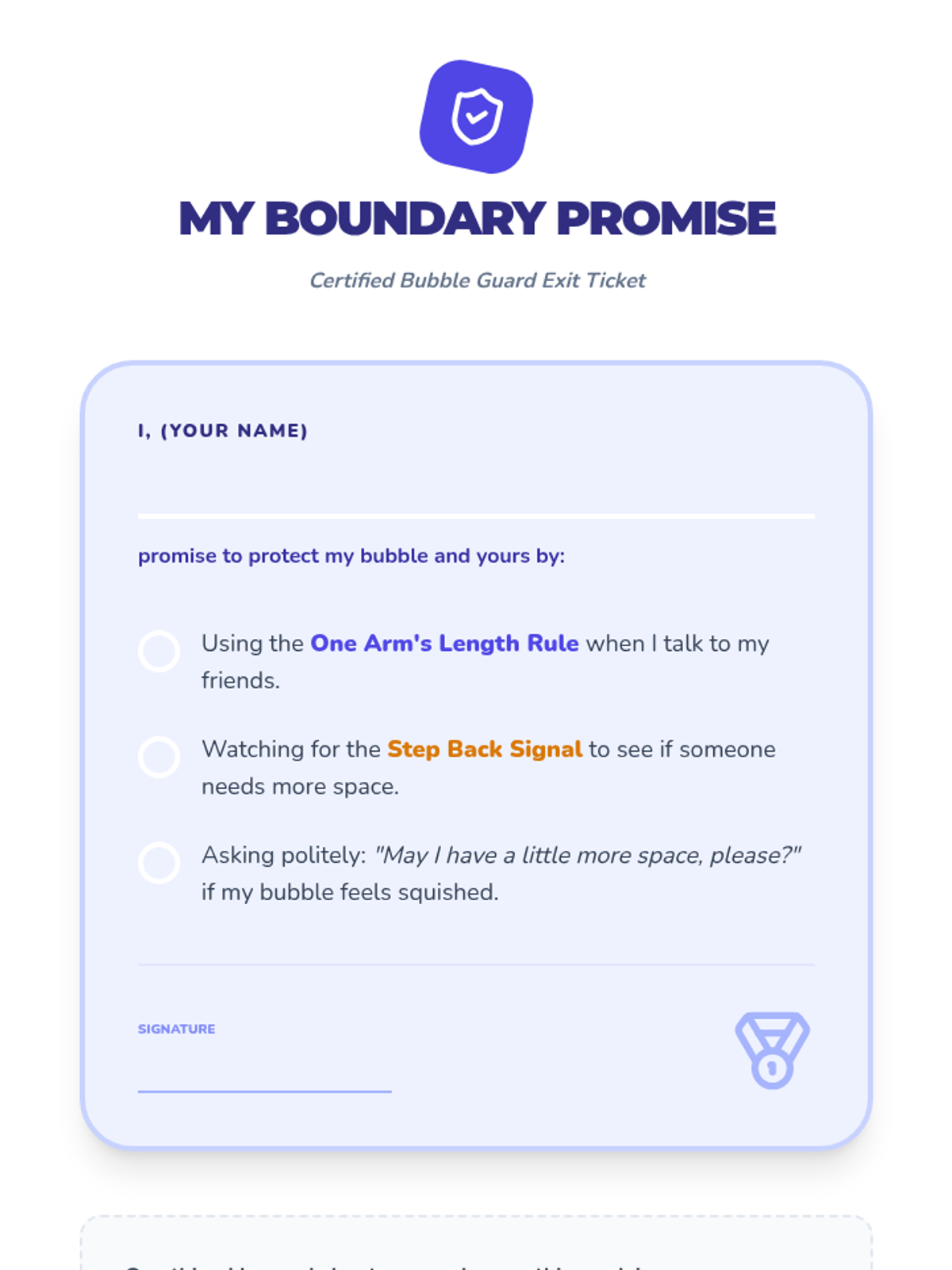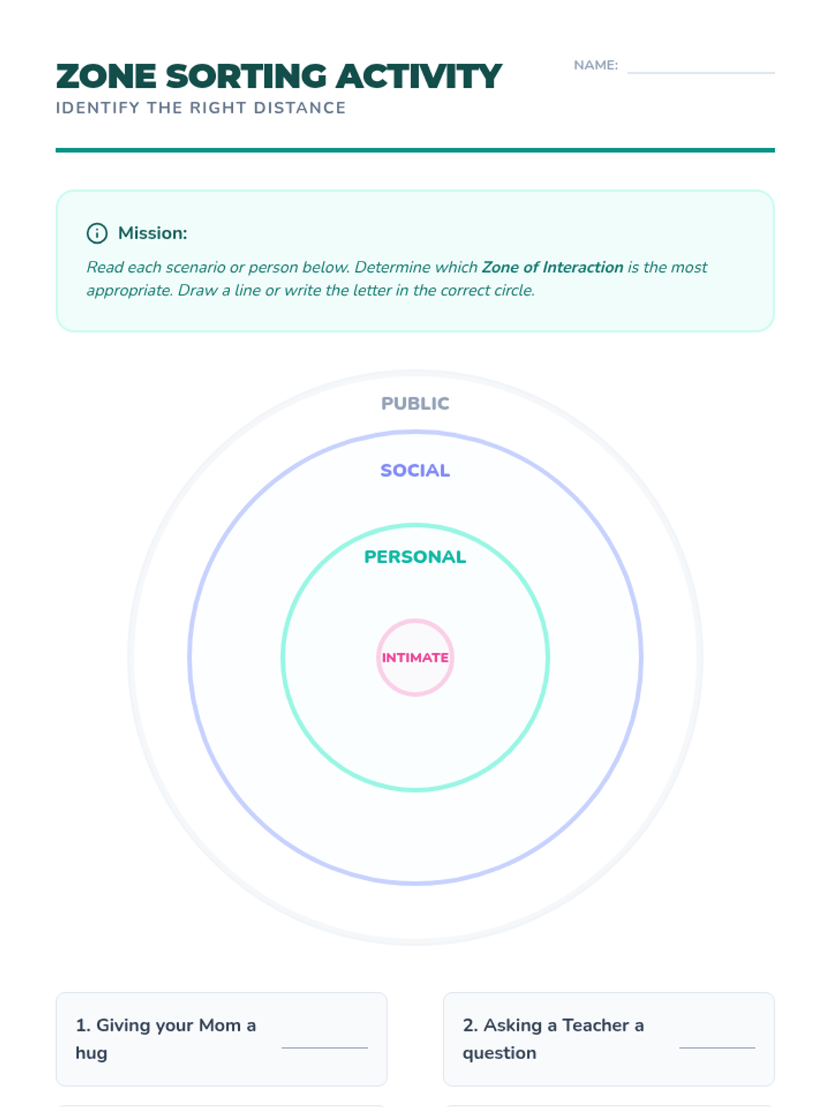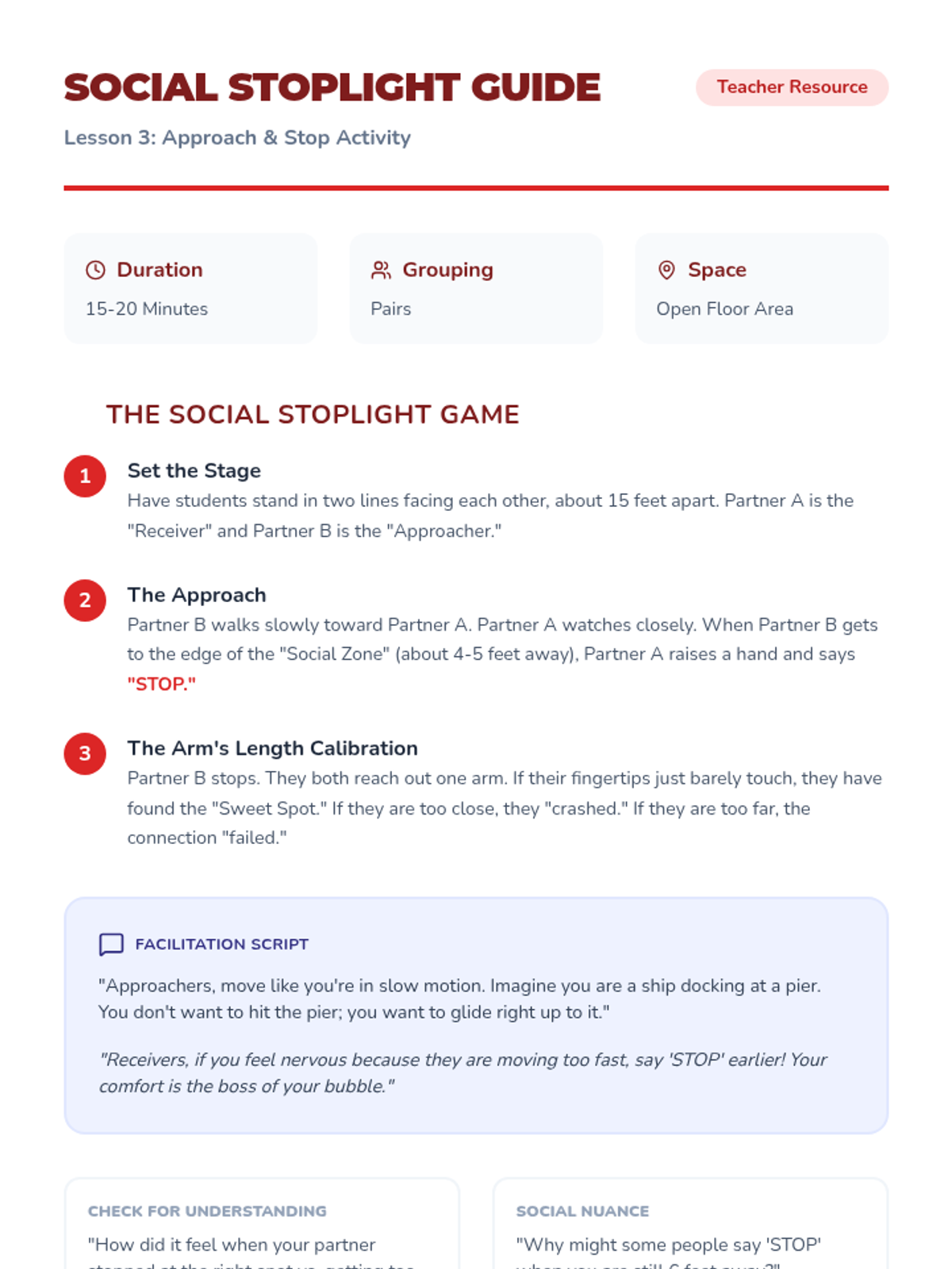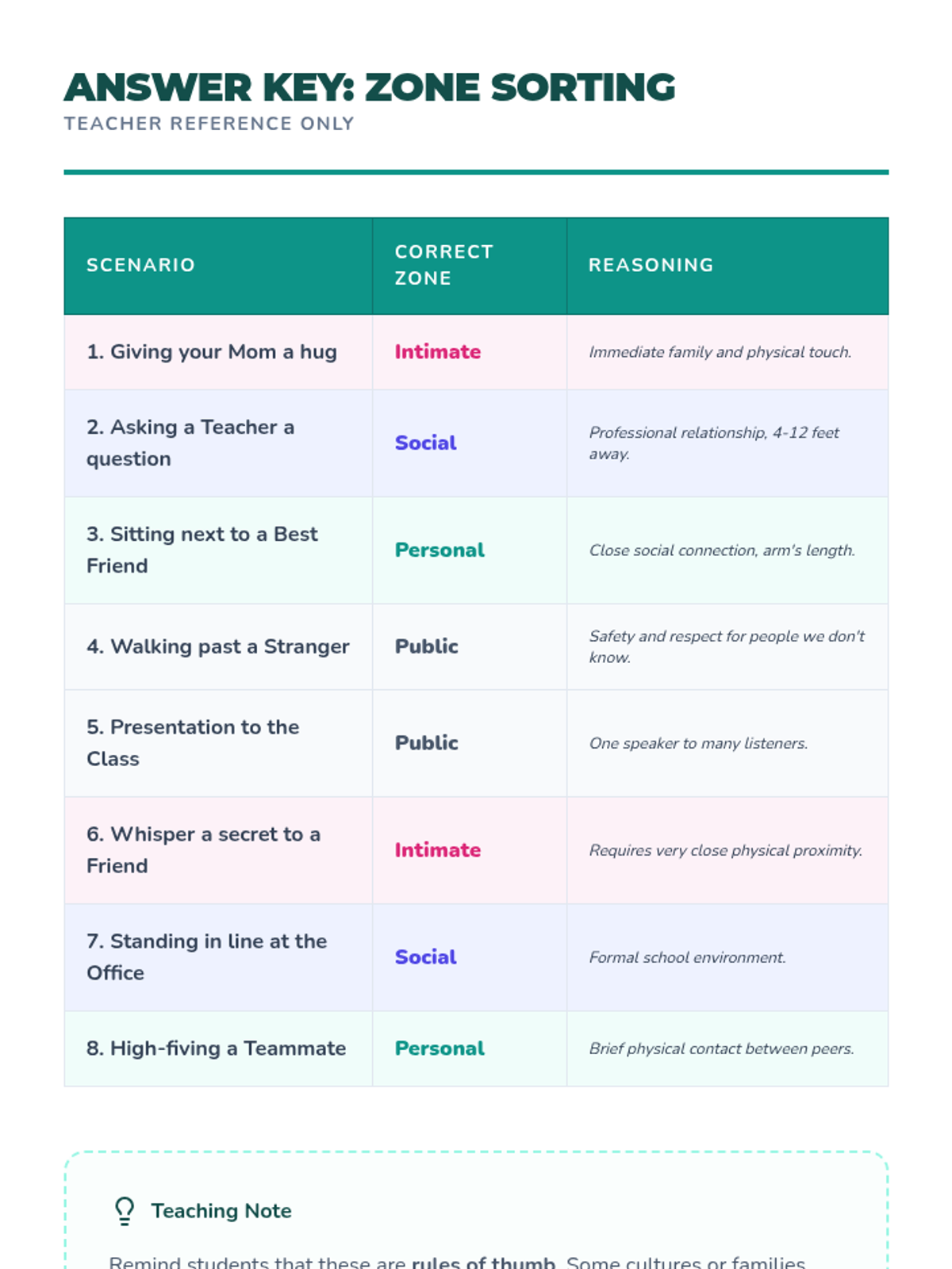 A 5-lesson sequence for 6th-grade students in Special Education focused on social communication, specifically defining and respecting personal space boundaries using the 'bubble' concept. Students progress from static measurements to dynamic movement and reading non-verbal cues.