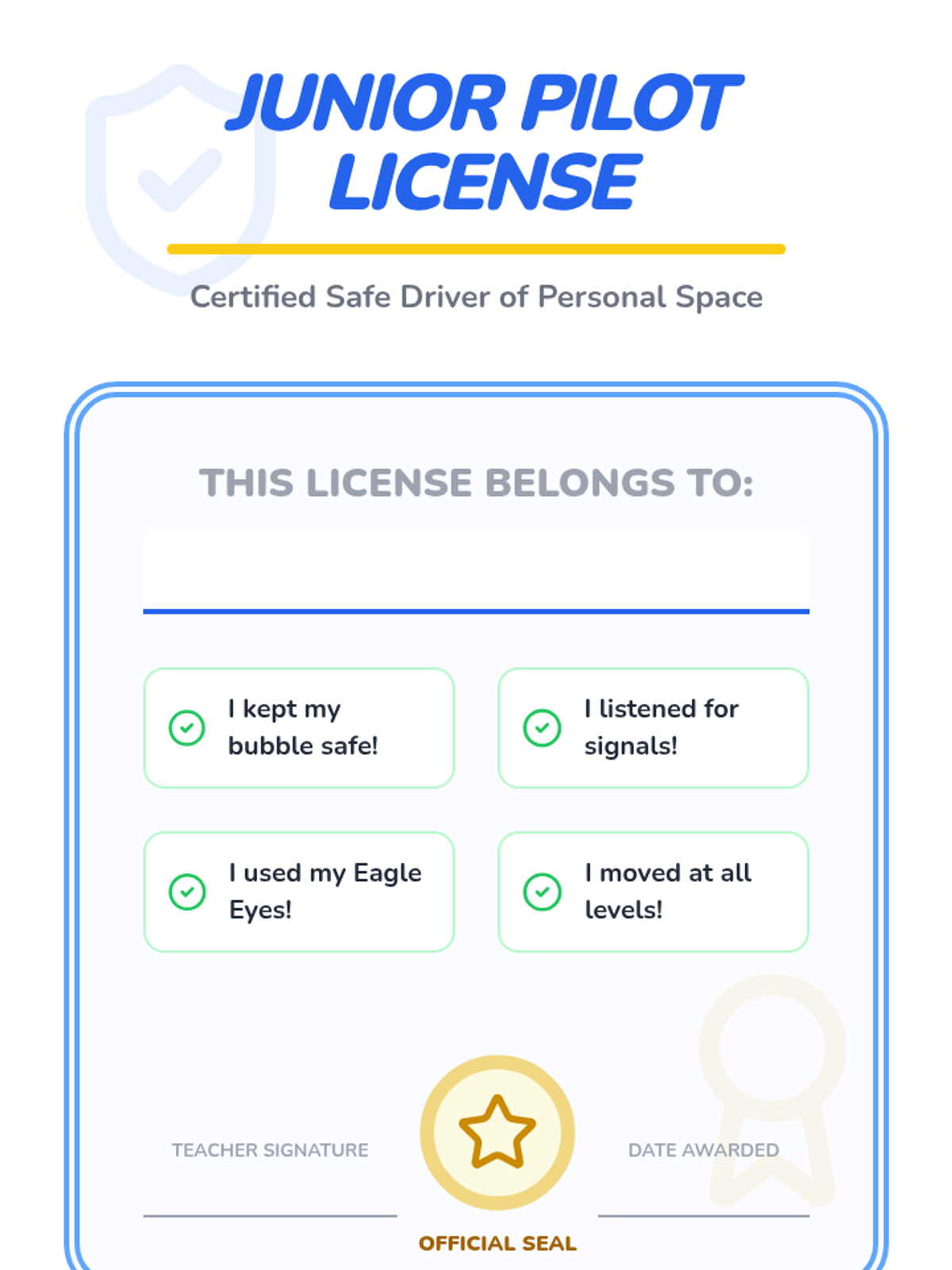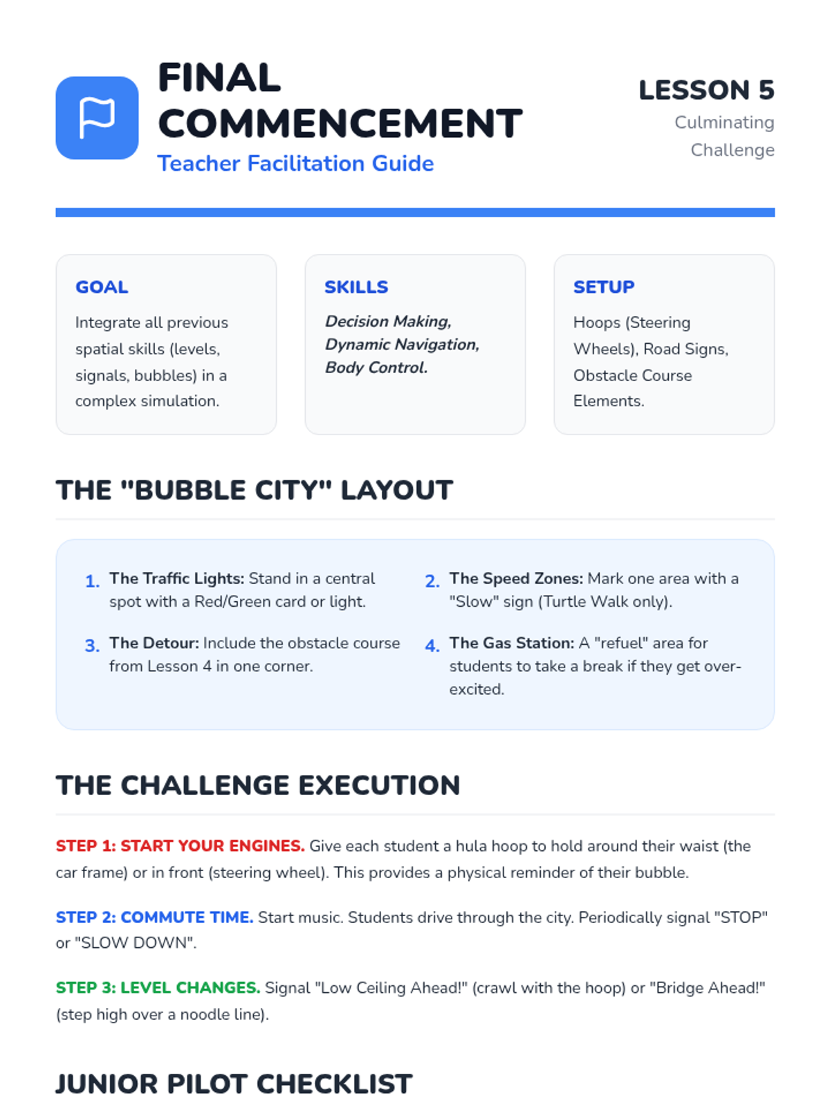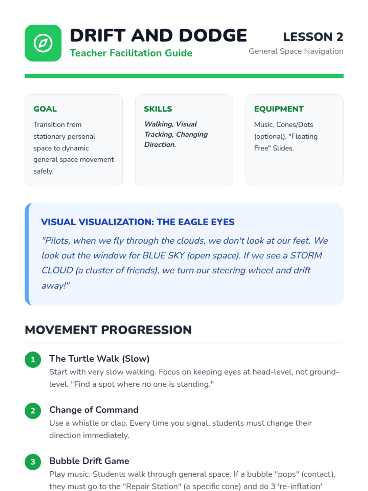 A fun, movement-based sequence for Pre-K students to learn the difference between personal and general space. Students use 'invisible bubbles' to navigate safely, respond to cues, and explore different levels while moving their bodies.