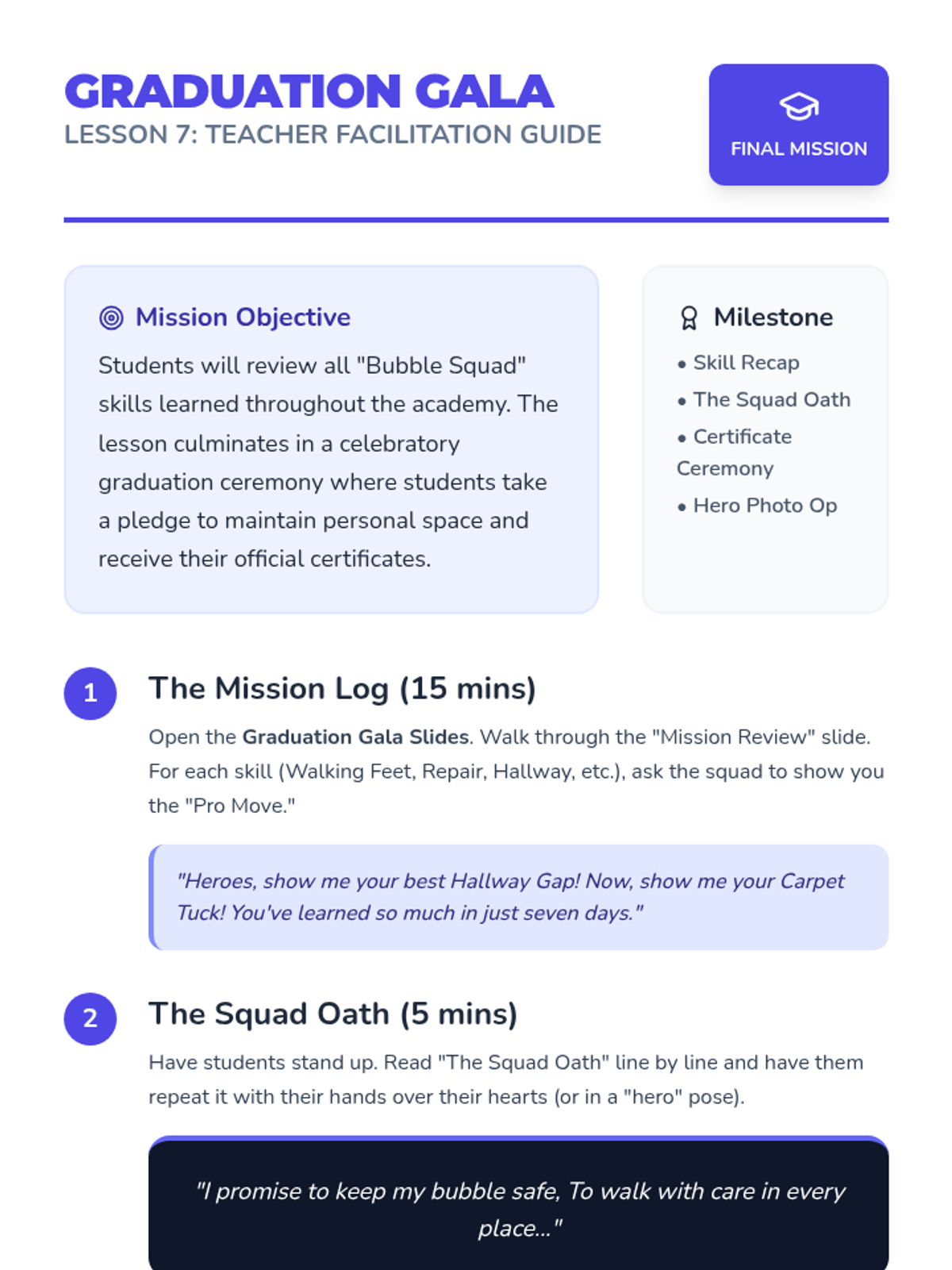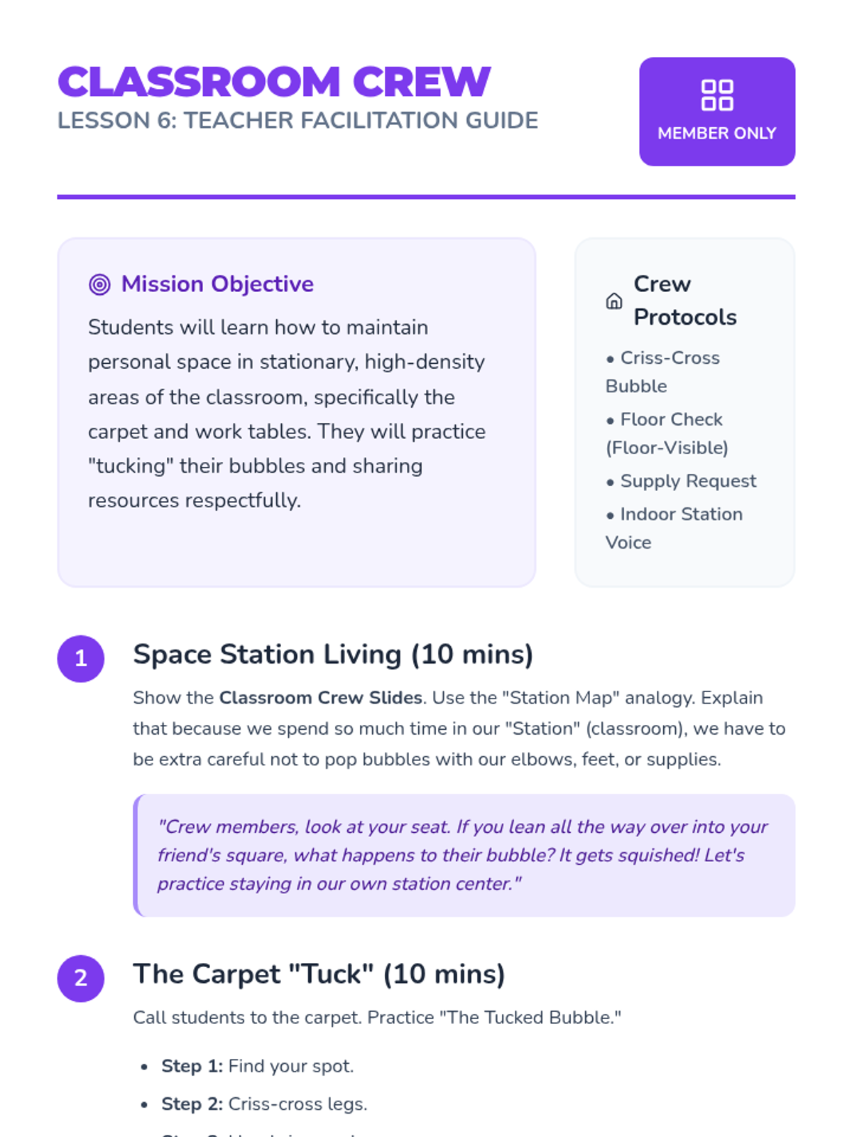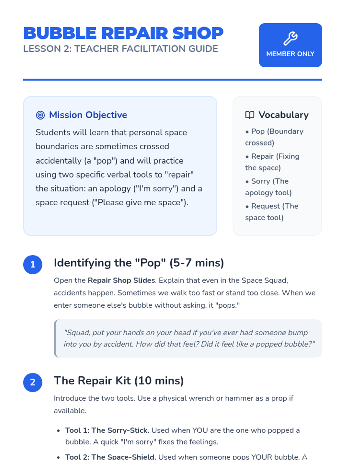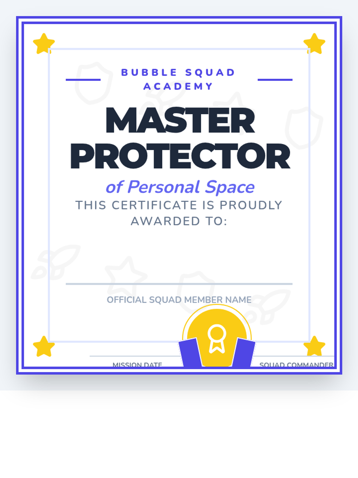 A 7-day social-emotional learning series that uses a 'Bubble Squad' space-themed metaphor to teach kindergarteners about personal space, boundary maintenance, safe transitions, playground play, classroom collaboration, and respectful social interaction.