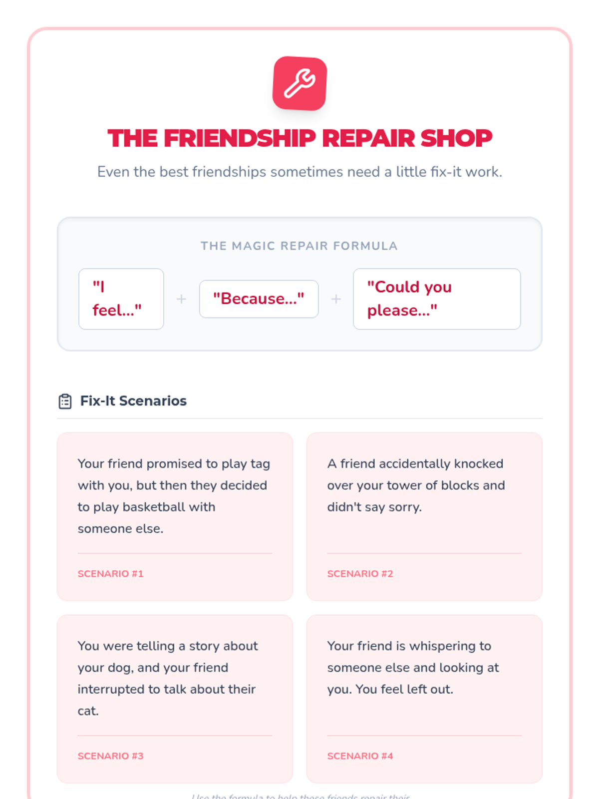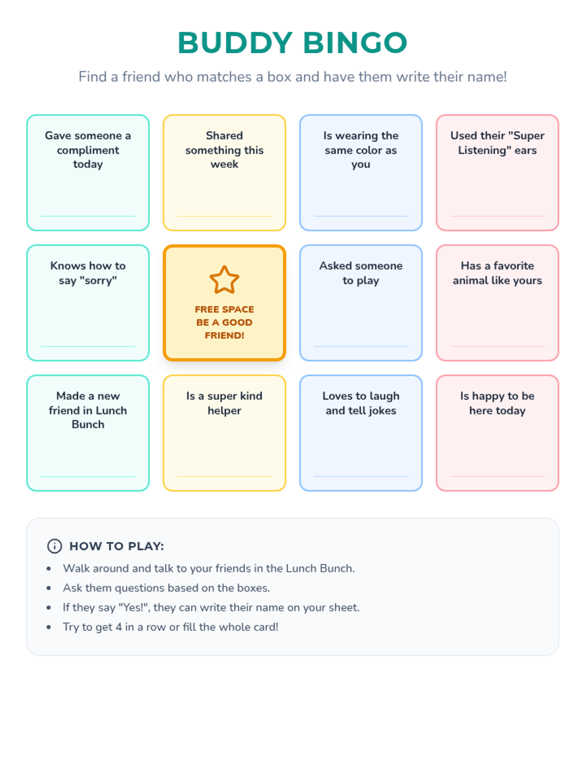 An 8-week lunch bunch curriculum for 2nd graders focused on building friendship skills through 15-minute interactive sessions. Includes a comprehensive facilitator guide and student-facing activity materials for each week.
