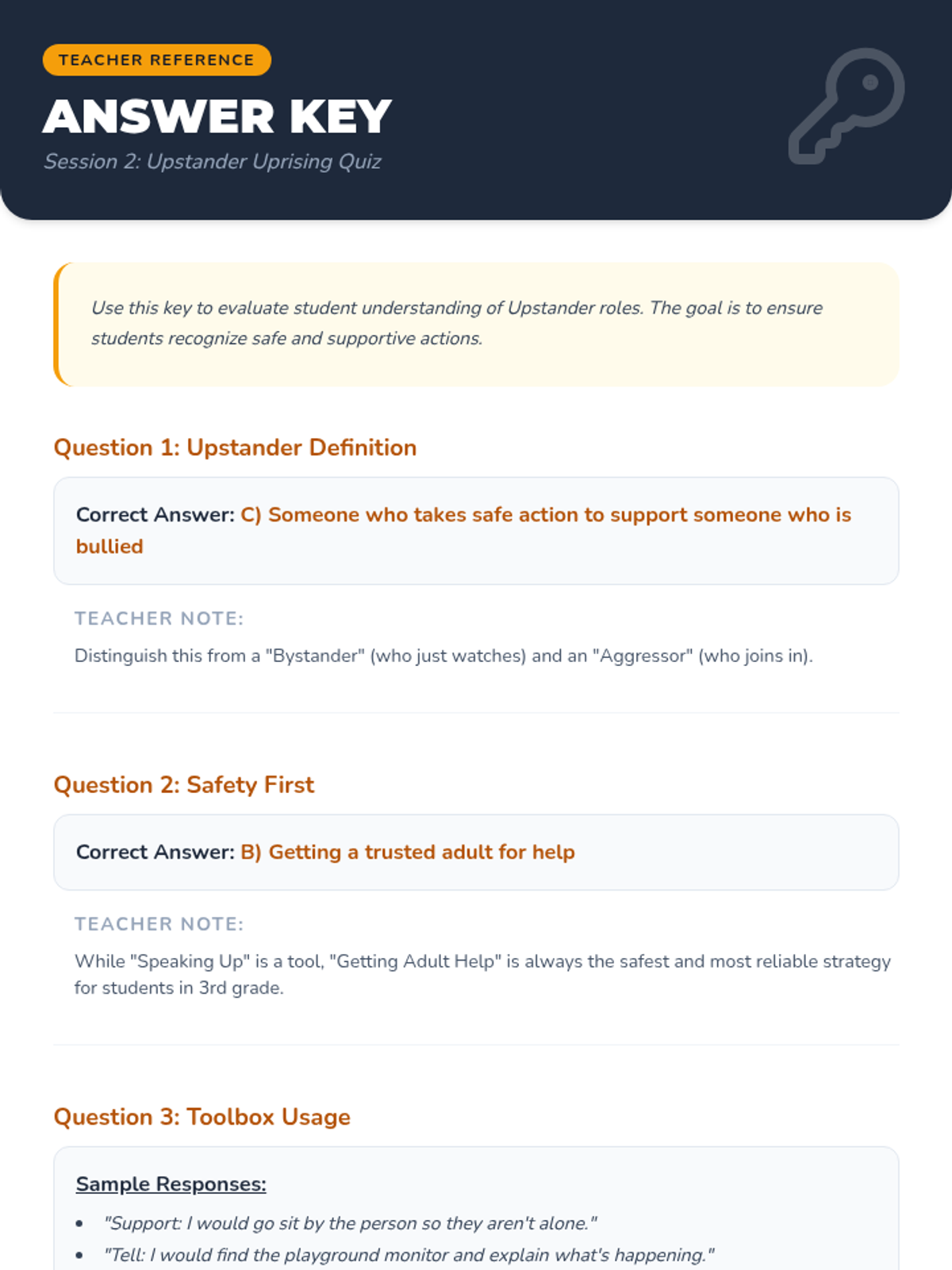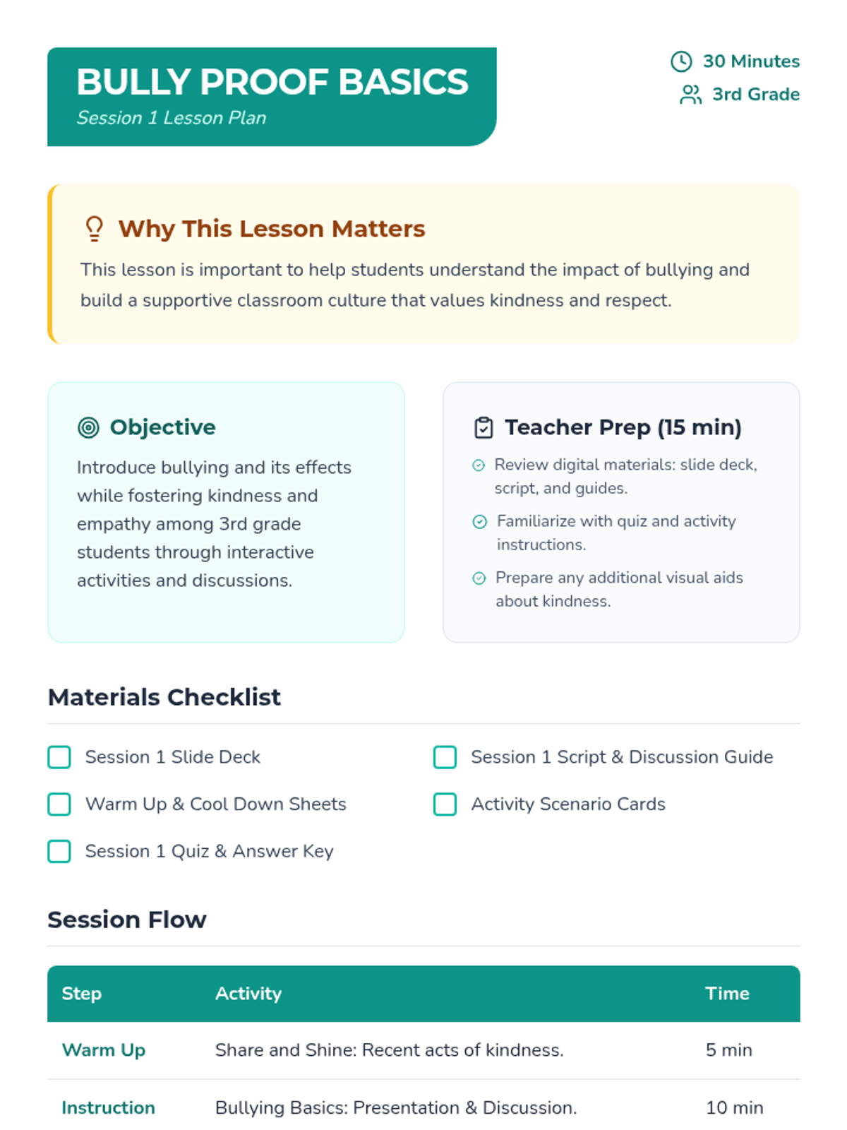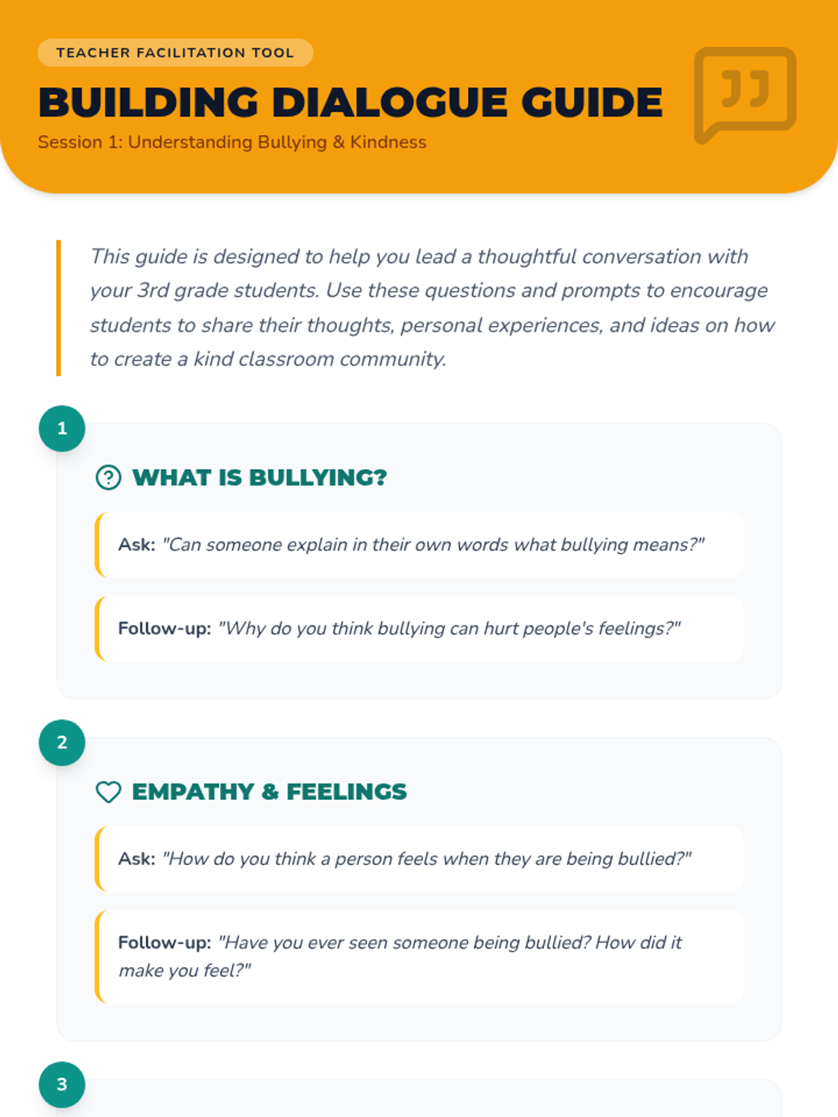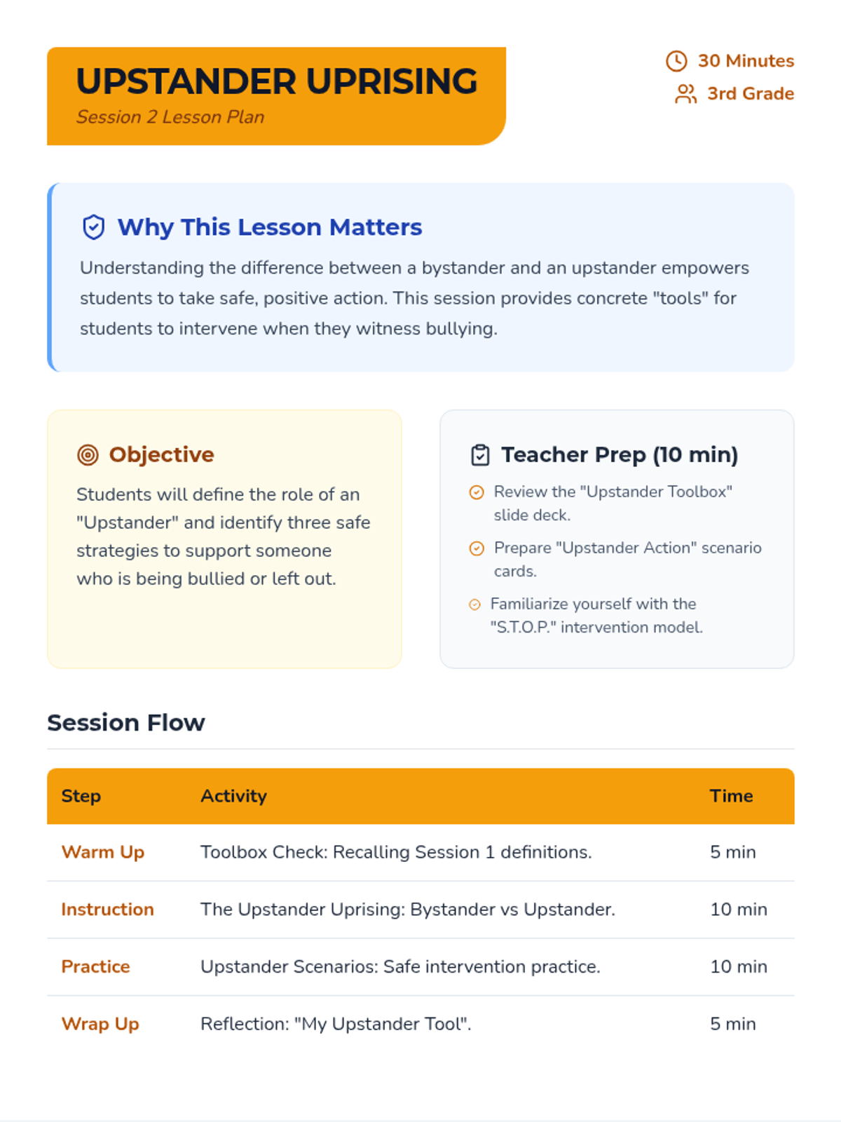 A comprehensive 3-session series for 3rd graders focused on defining bullying, empowering upstanders, and establishing a lasting culture of kindness in the classroom.