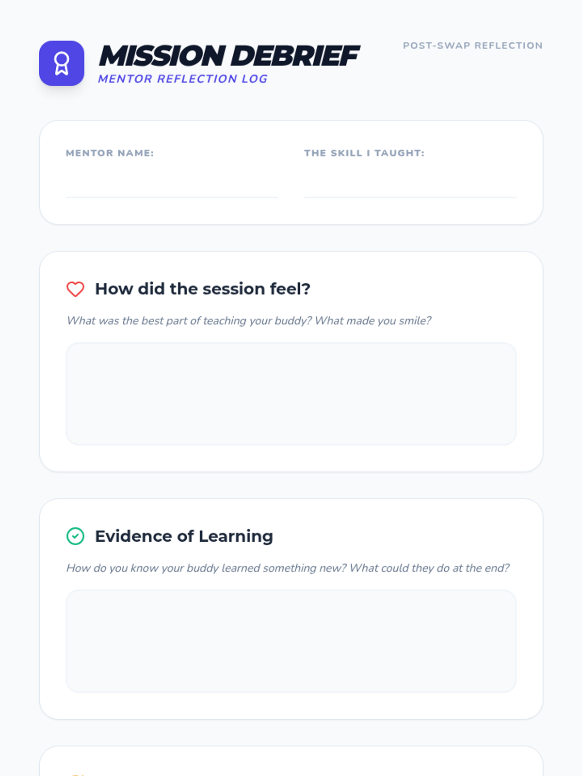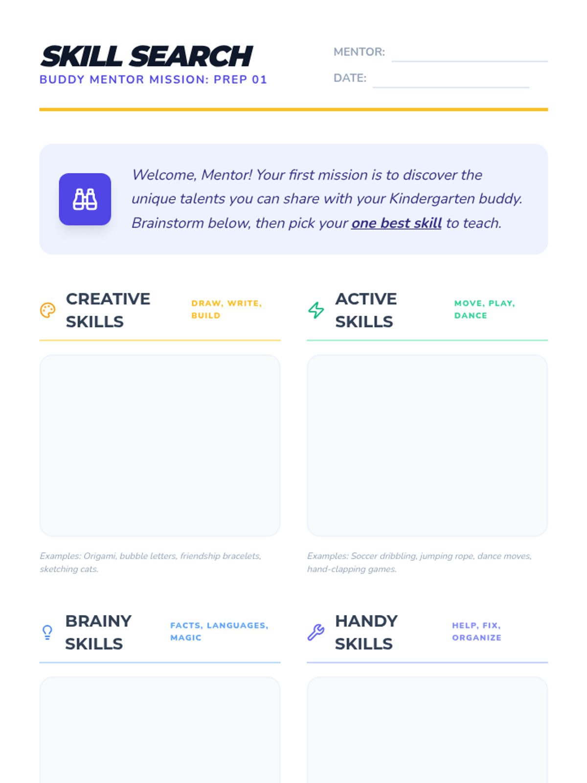 A three-part sequence where Grade 5 students prepare for and then execute a peer-mentoring session with their Kindergarten buddies, focusing on teaching a personal skill or talent.