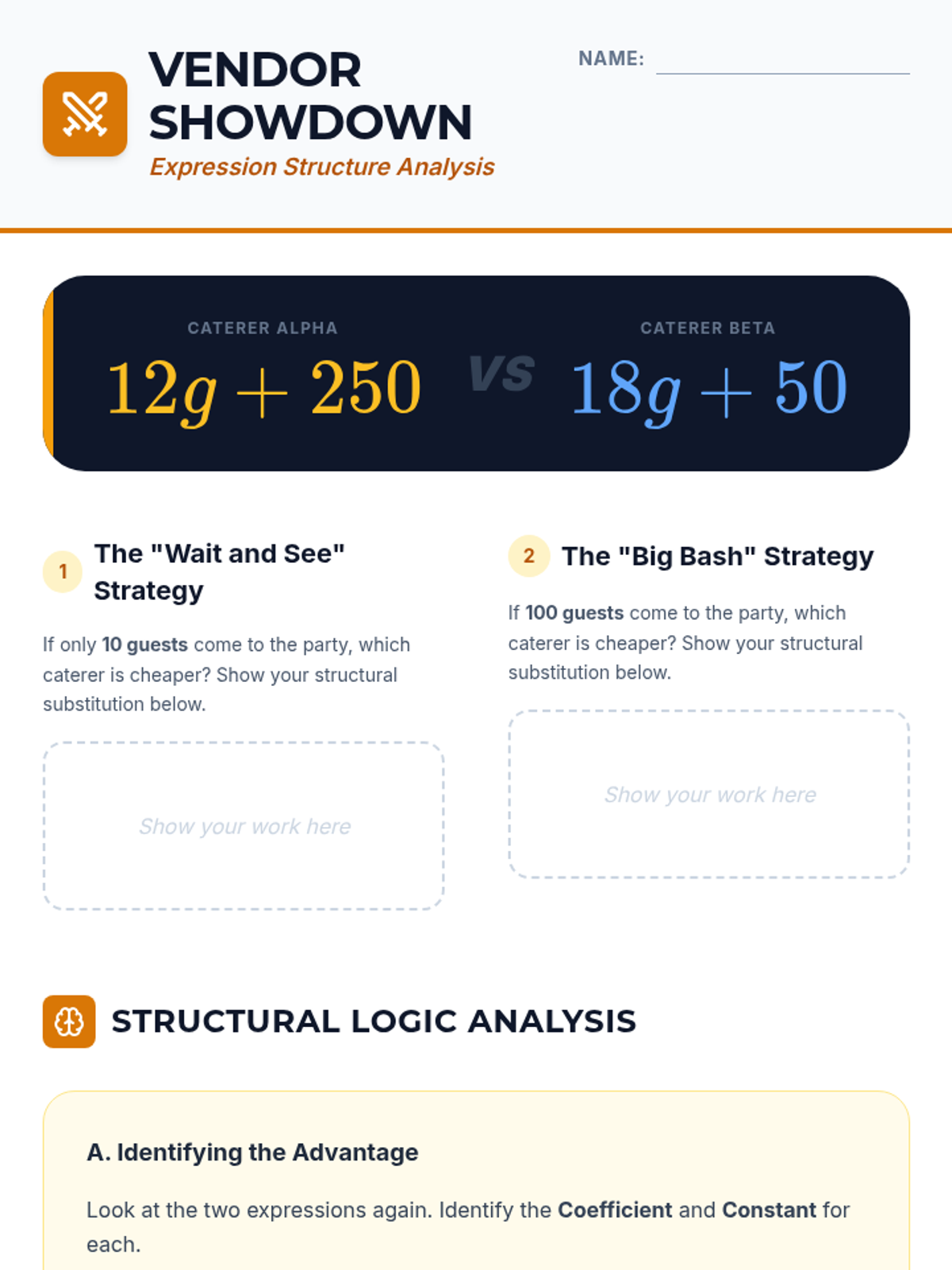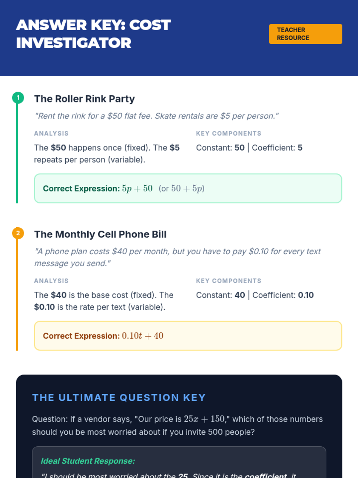 A 5-lesson sequence for 6th-grade students focusing on algebraic expression structure through the lens of event planning and budgeting. Students progress from basic translation of words to math to building and comparing complex cost models for a professional event proposal.