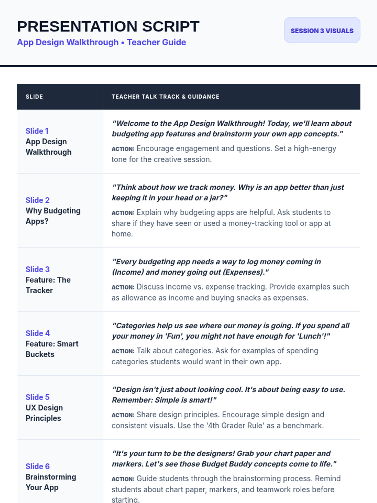 A comprehensive 5-session project-based learning unit where 4th-grade students collaborate to design a budgeting app, applying math and financial literacy to solve real-world problems.