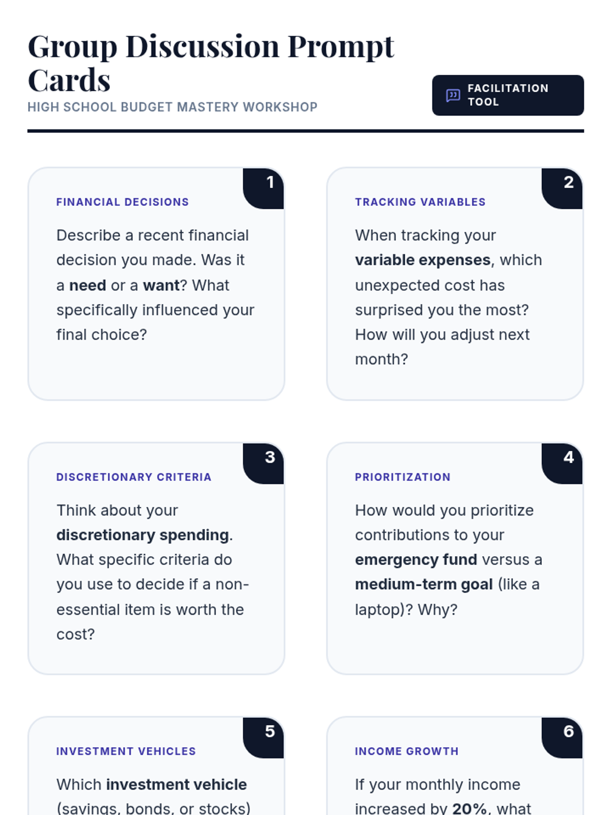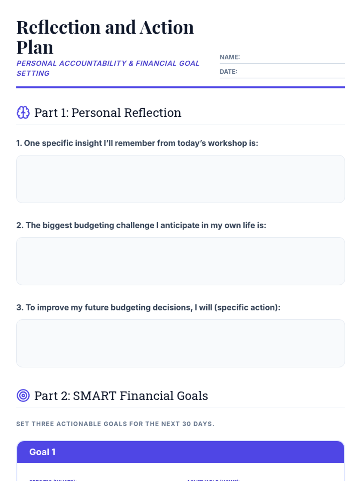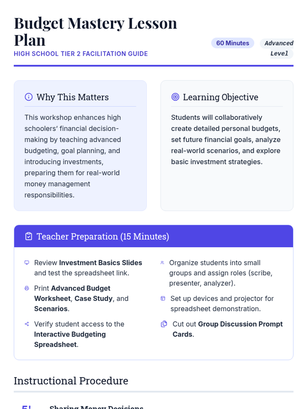A comprehensive financial literacy sequence designed to take students from basic money concepts to advanced budgeting, goal setting, and investment basics. Suitable for diverse learners in a workshop setting.