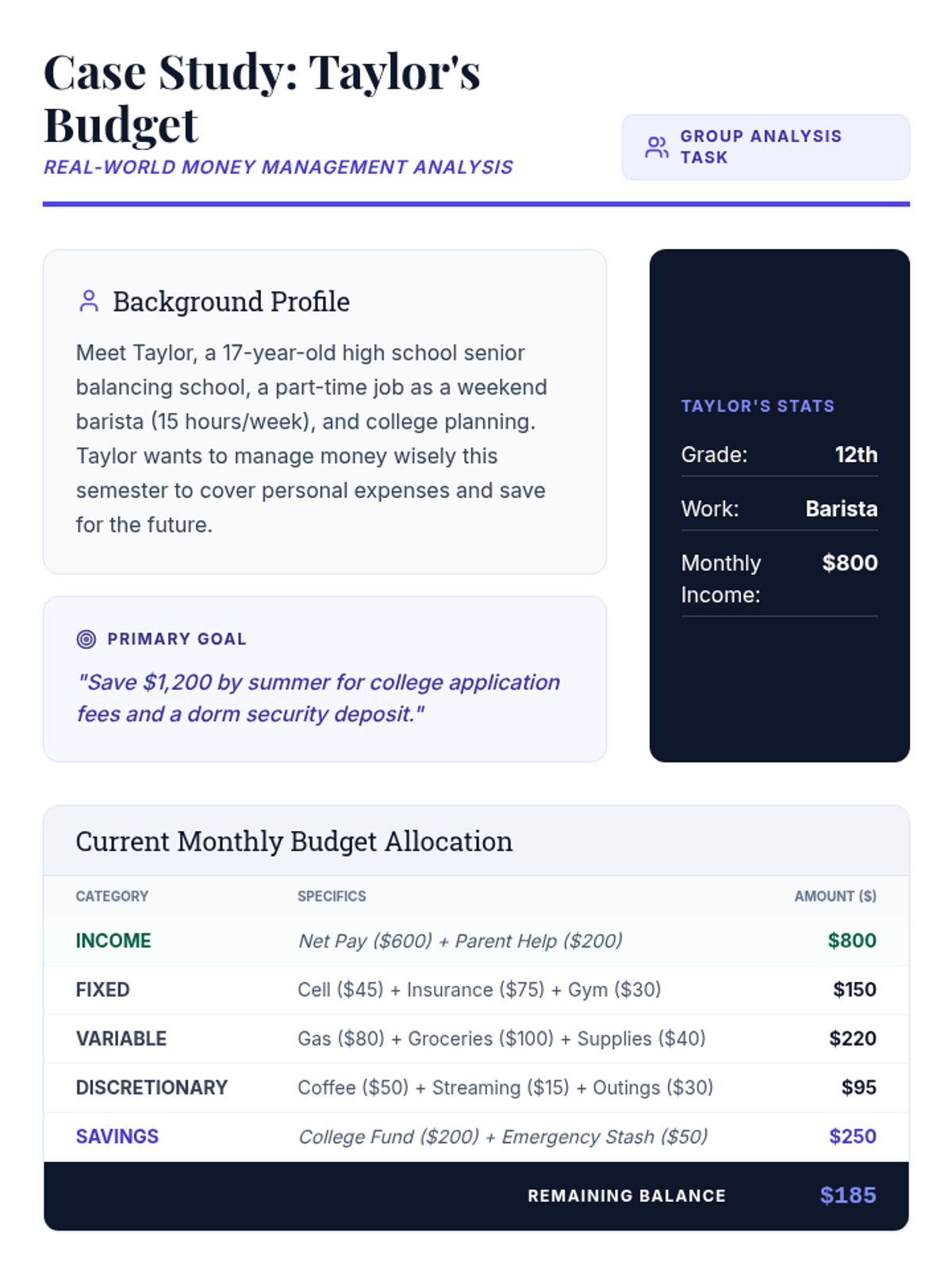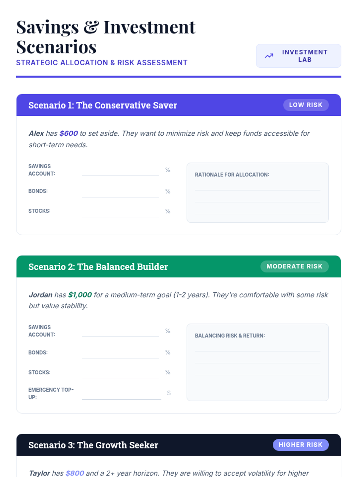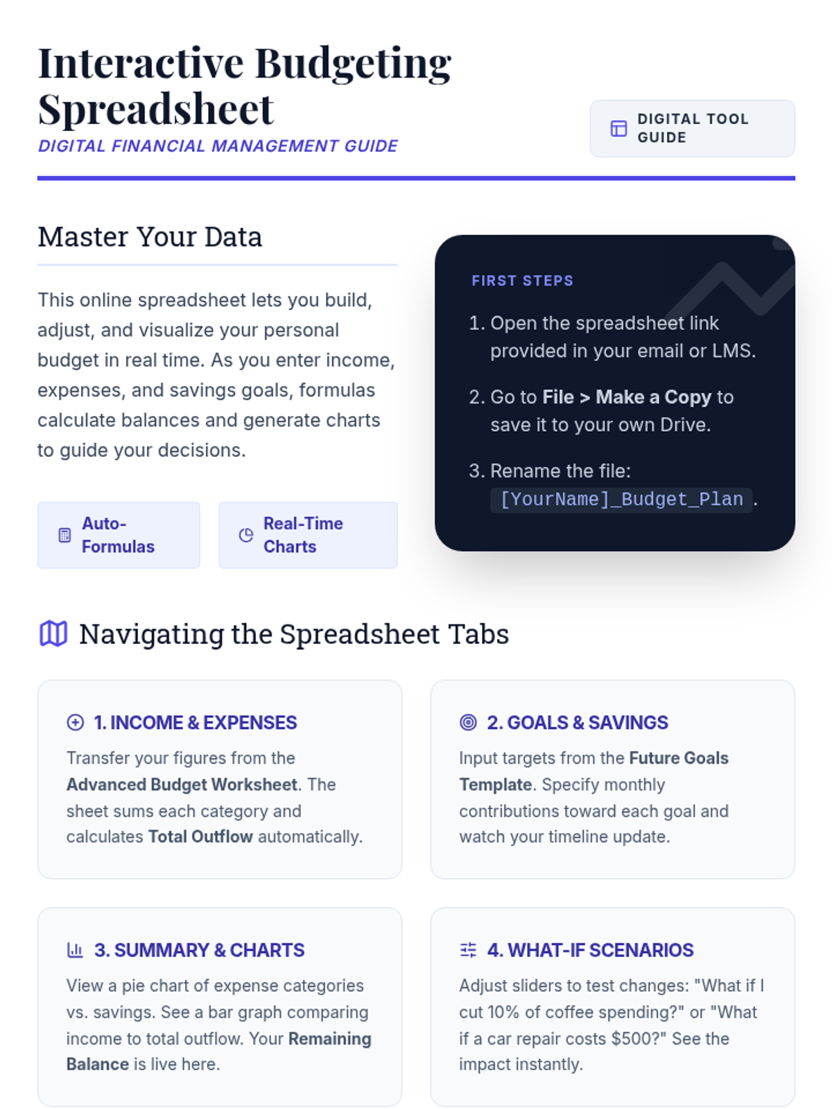 A comprehensive financial literacy sequence designed to take students from basic money concepts to advanced budgeting, goal setting, and investment basics. Suitable for diverse learners in a workshop setting.