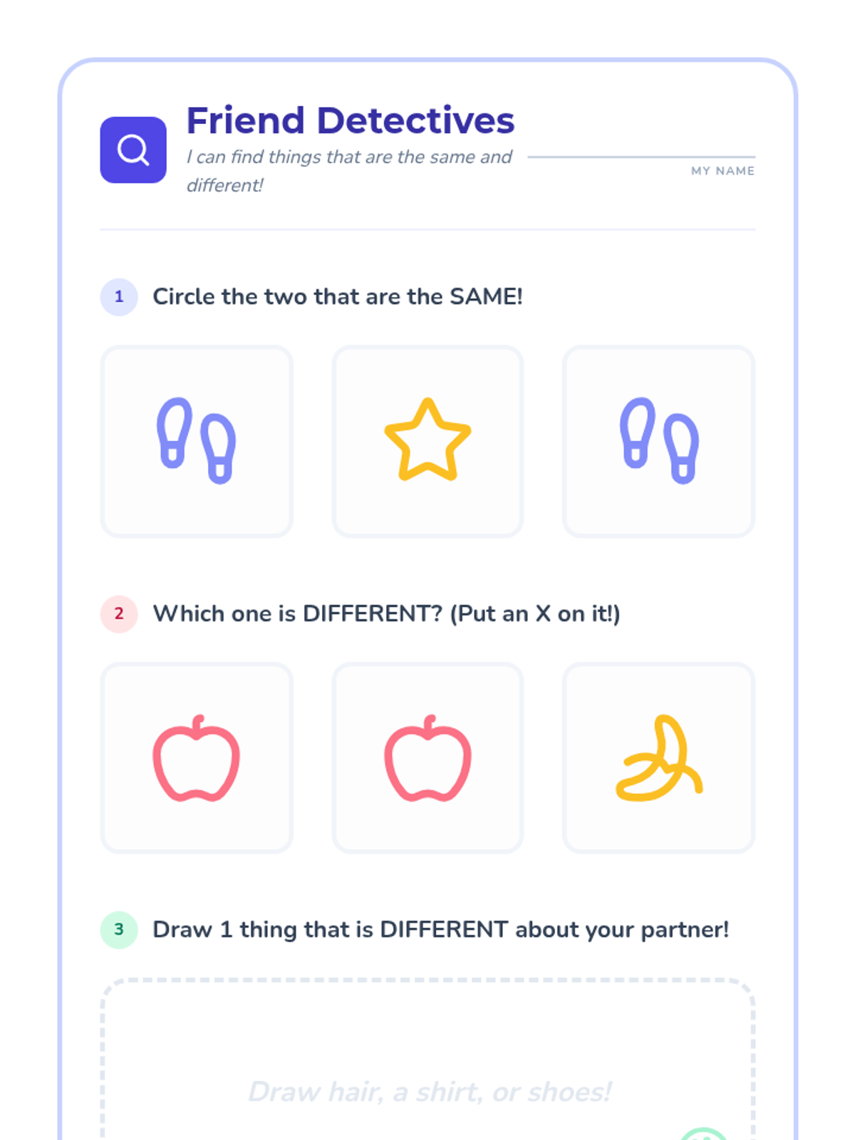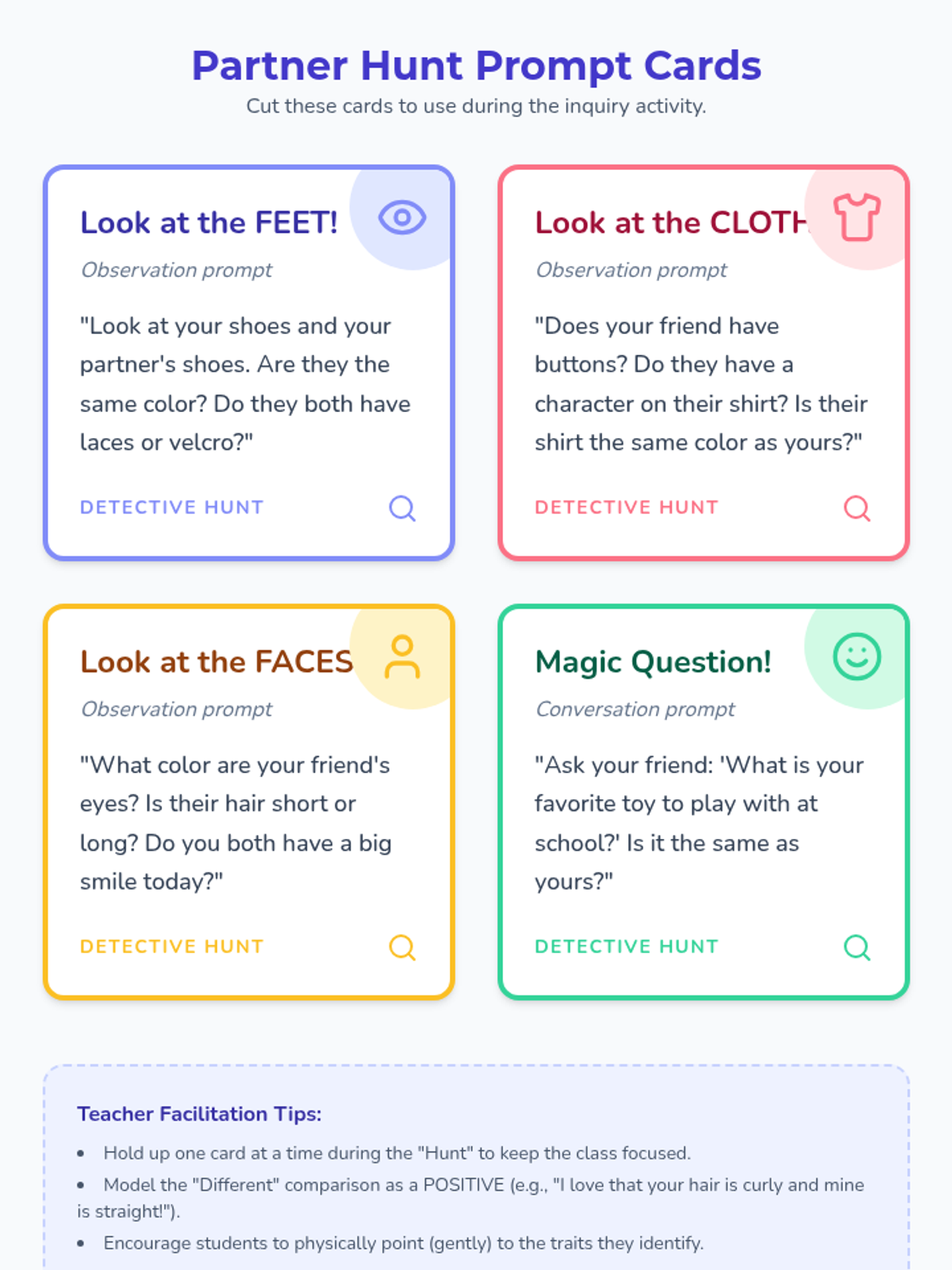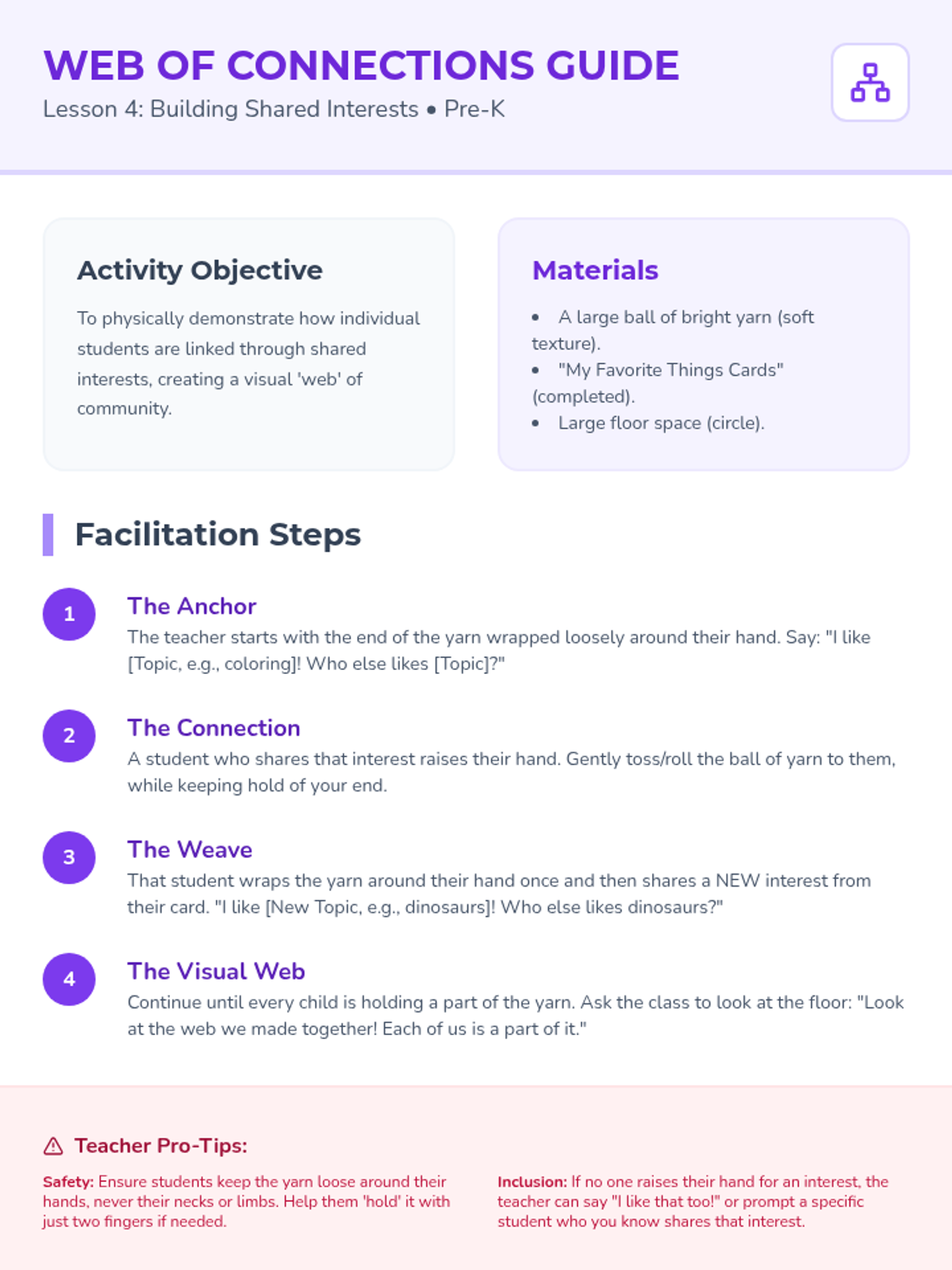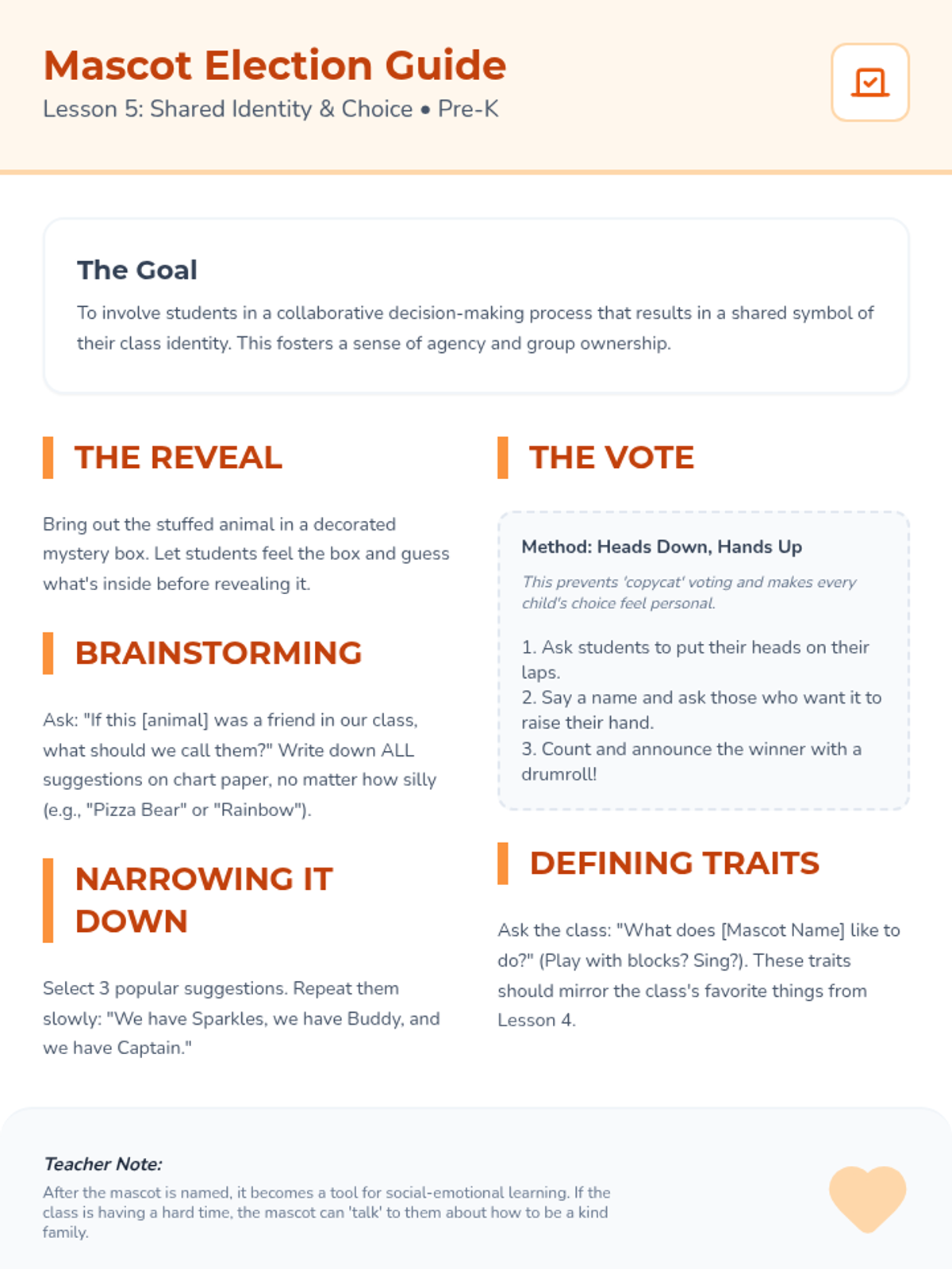 A Pre-K sequence focused on building a 'class family' through name recognition, visual maps of the community, exploring similarities and differences, and creating a shared class identity. Students learn to recognize their peers, appreciate individual traits, and understand how they fit into the group.
