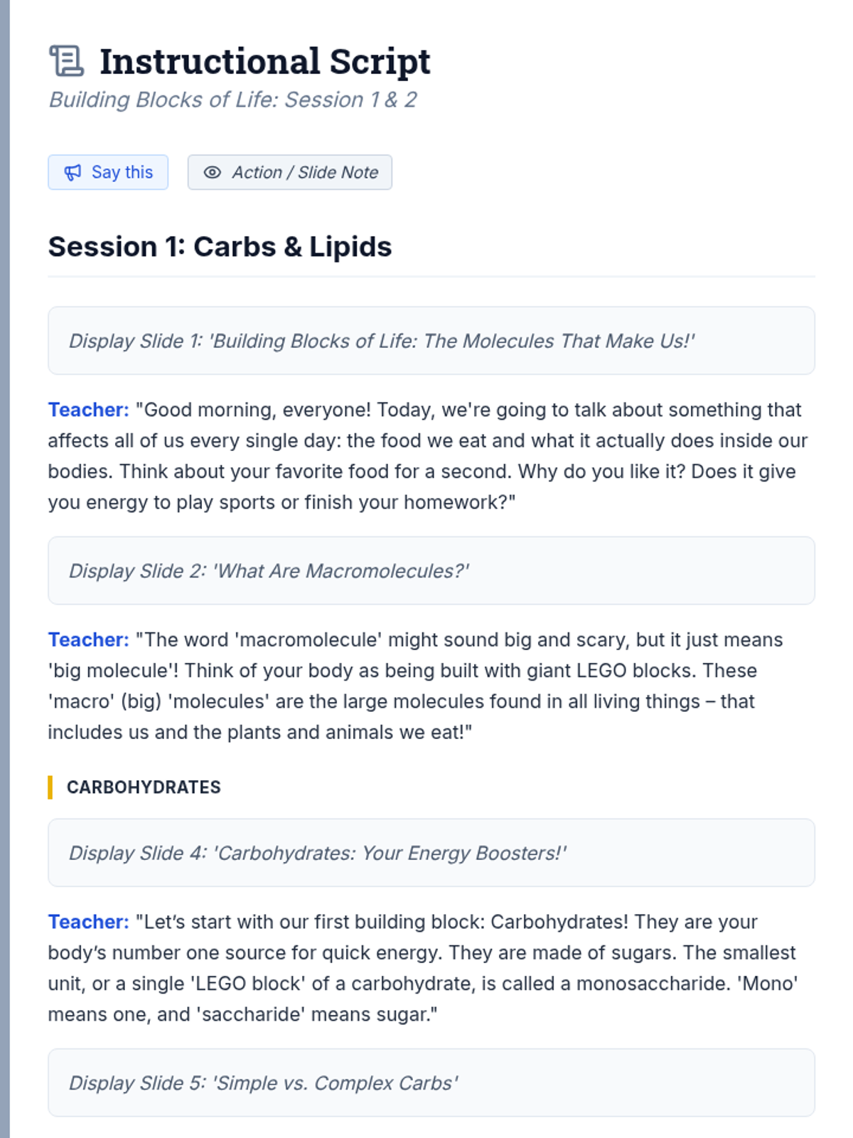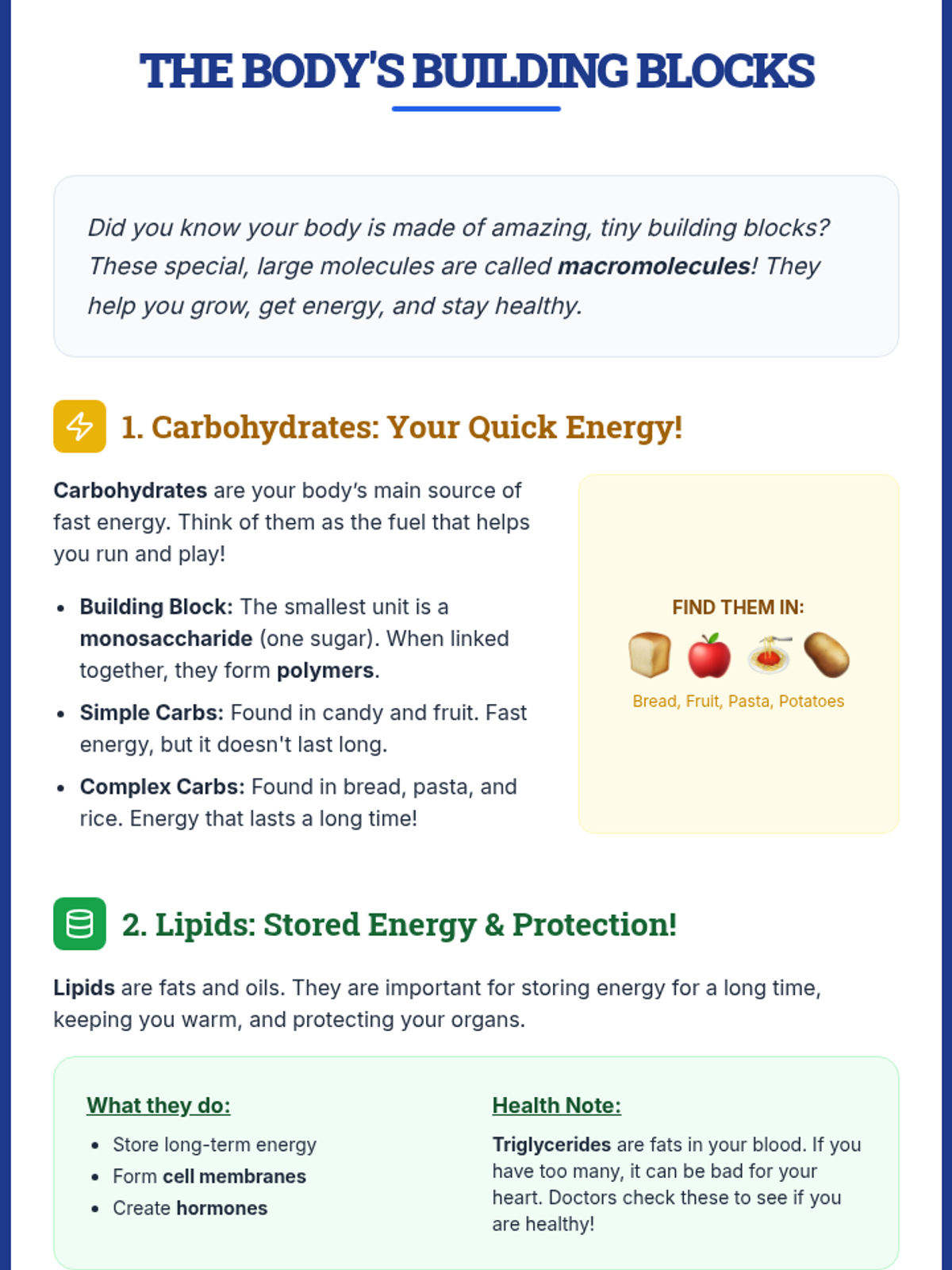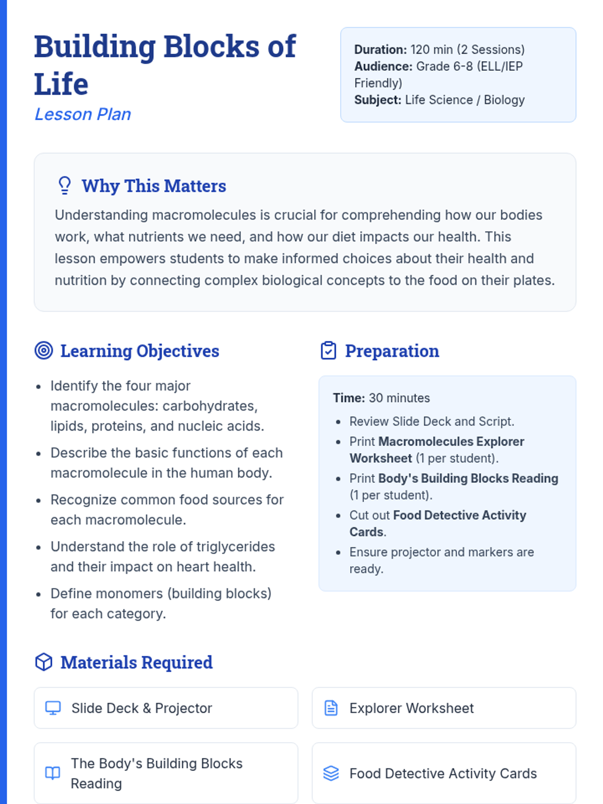 A 120-minute, 2-session lesson introducing middle school students to carbohydrates, lipids, proteins, and nucleic acids through interactive activities and guided reading.