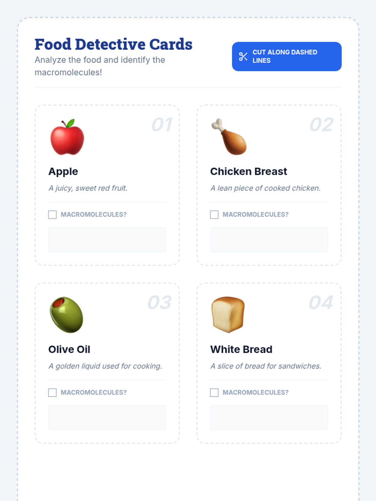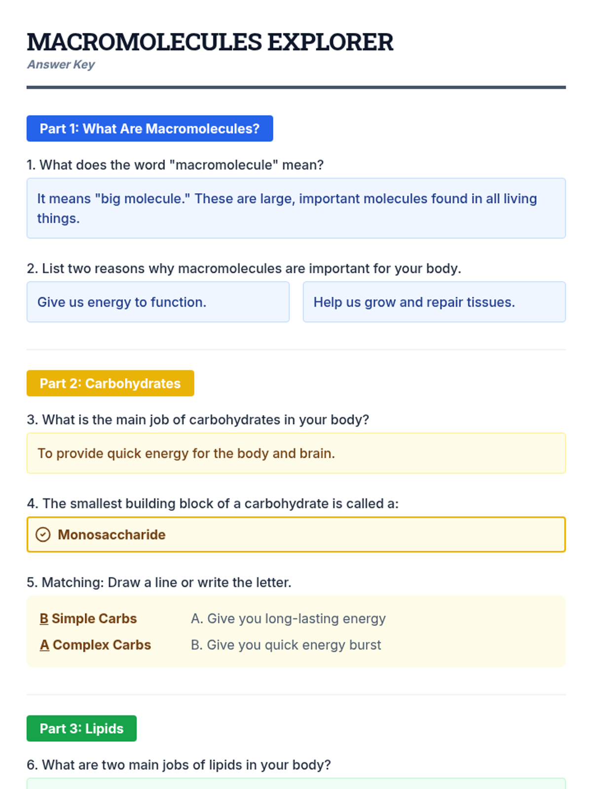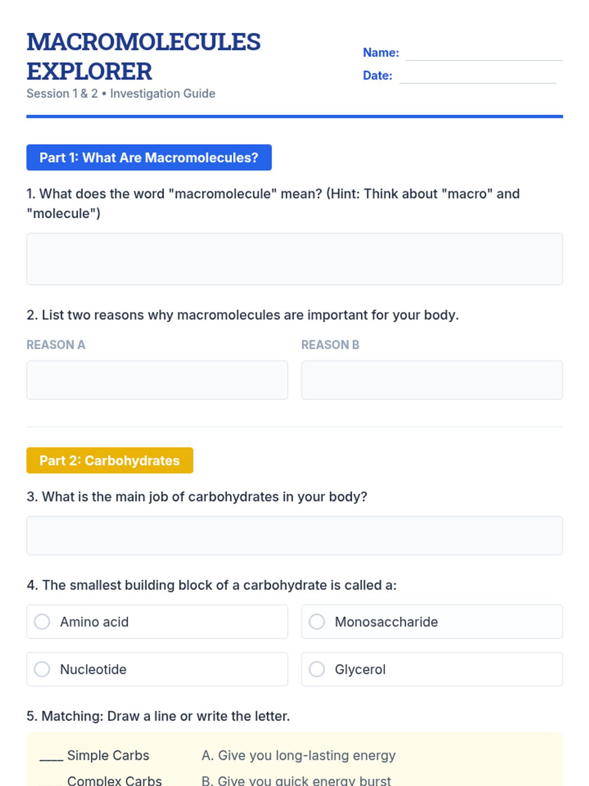 A 120-minute, 2-session lesson introducing middle school students to carbohydrates, lipids, proteins, and nucleic acids through interactive activities and guided reading.