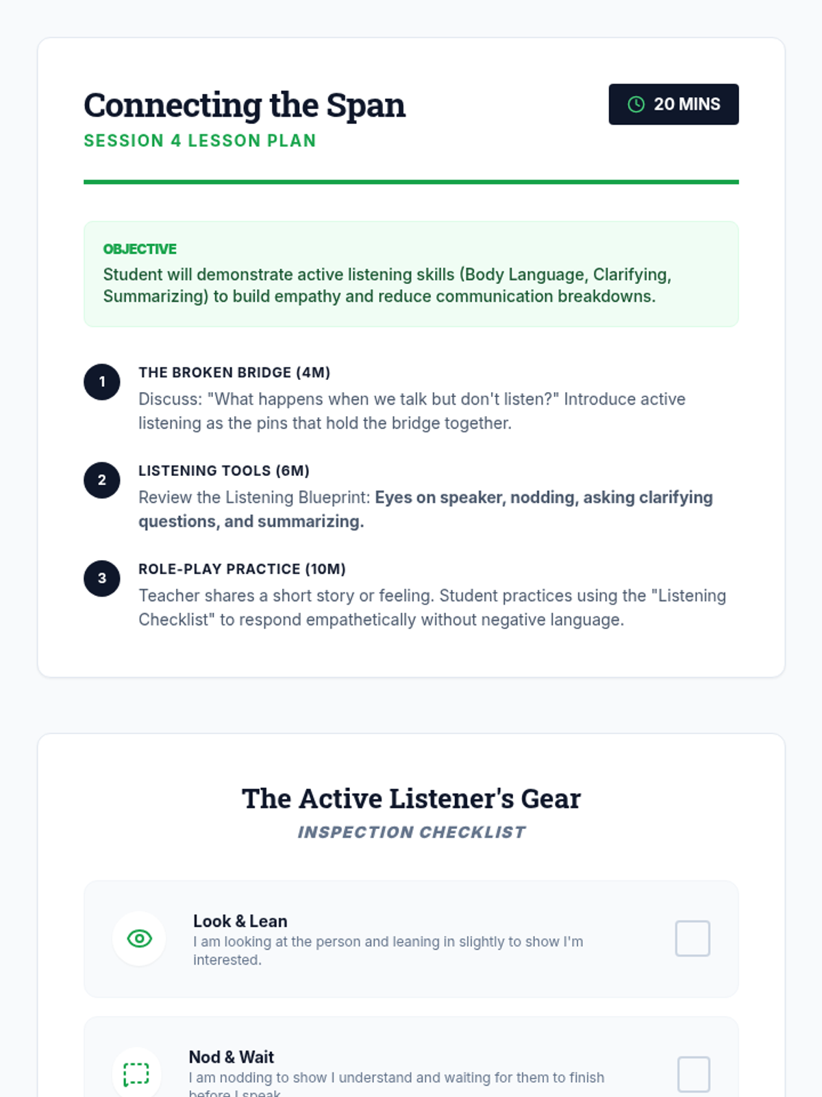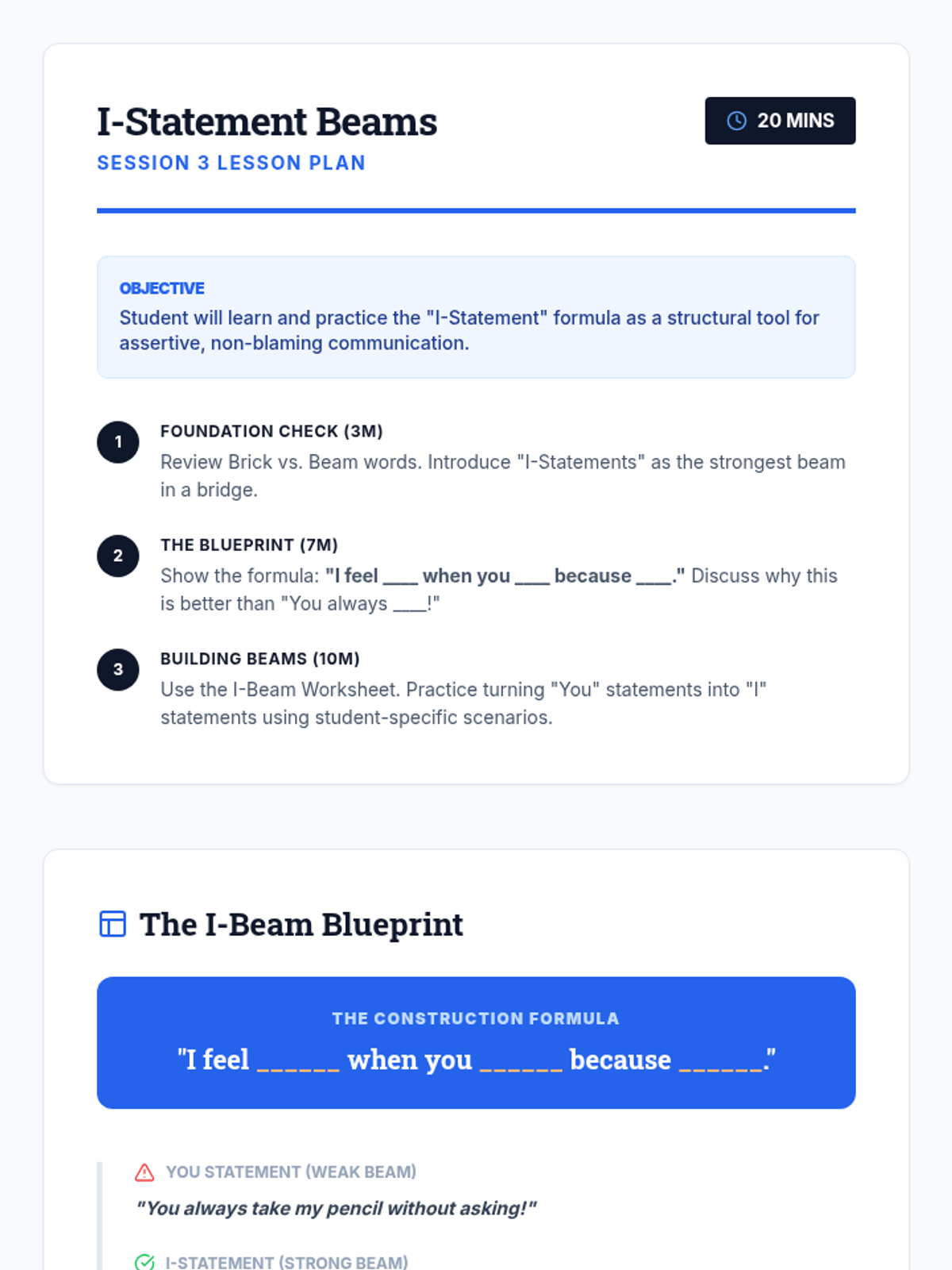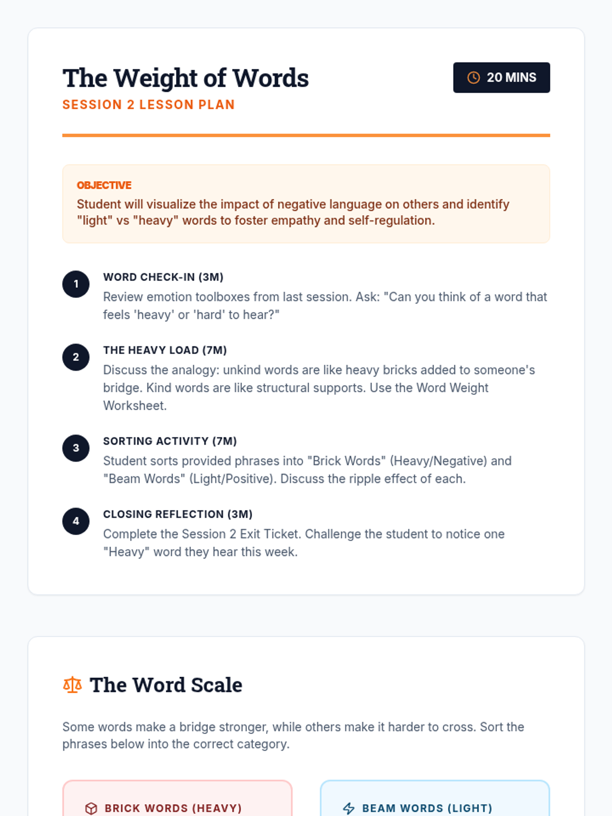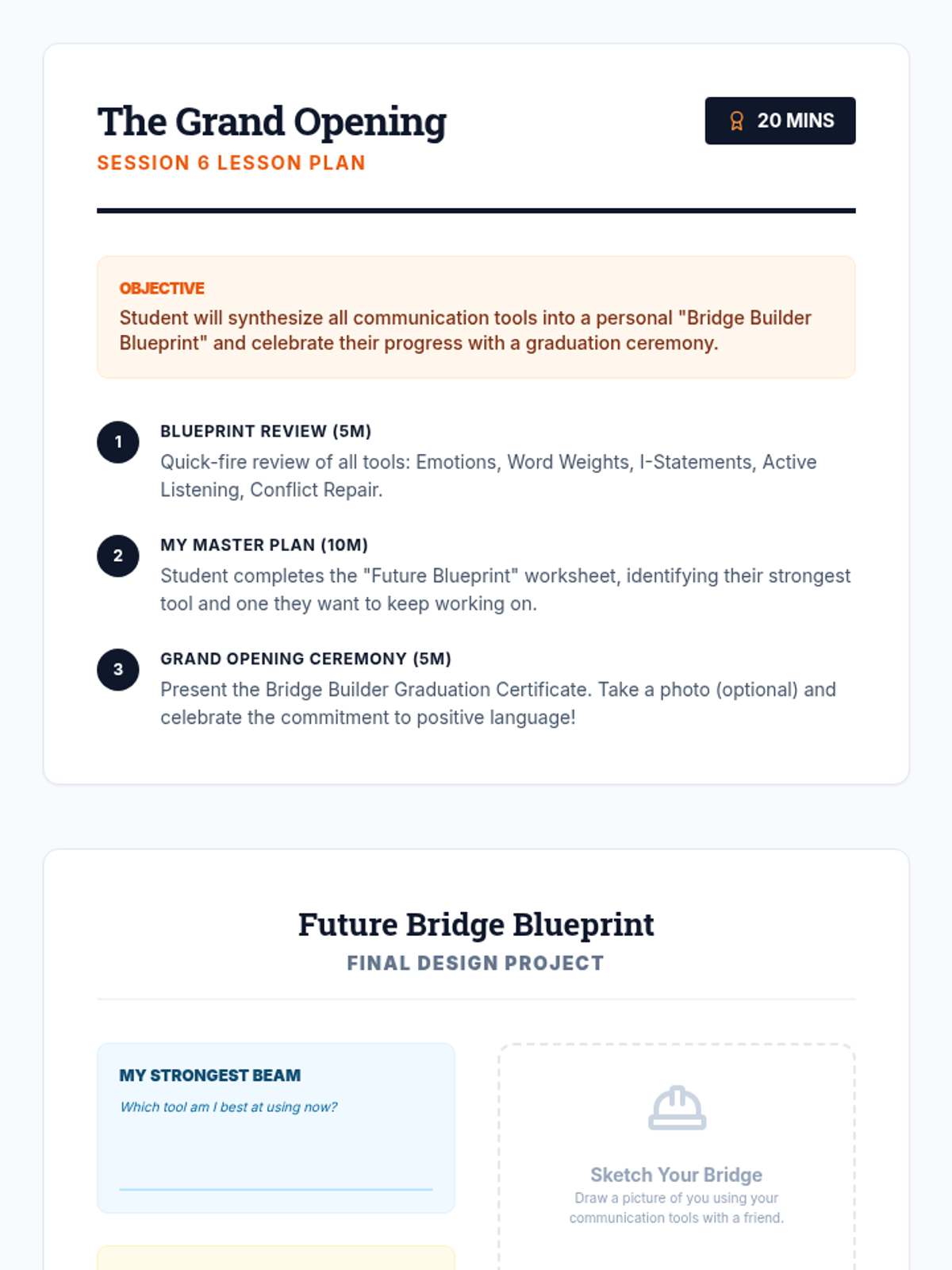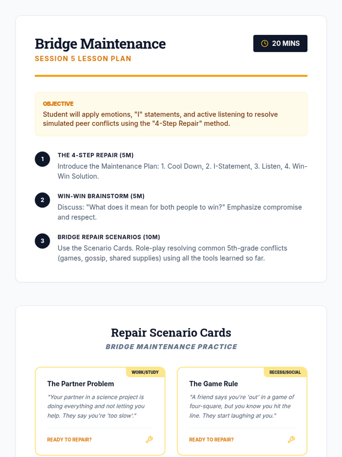 A 6-session Tier 3 social-emotional learning intervention for 5th graders focused on replacing negative peer language with positive communication and conflict resolution strategies. Using a 'Bridge Builders' theme, the student develops self-awareness, empathy, and relationship skills through structured activities.