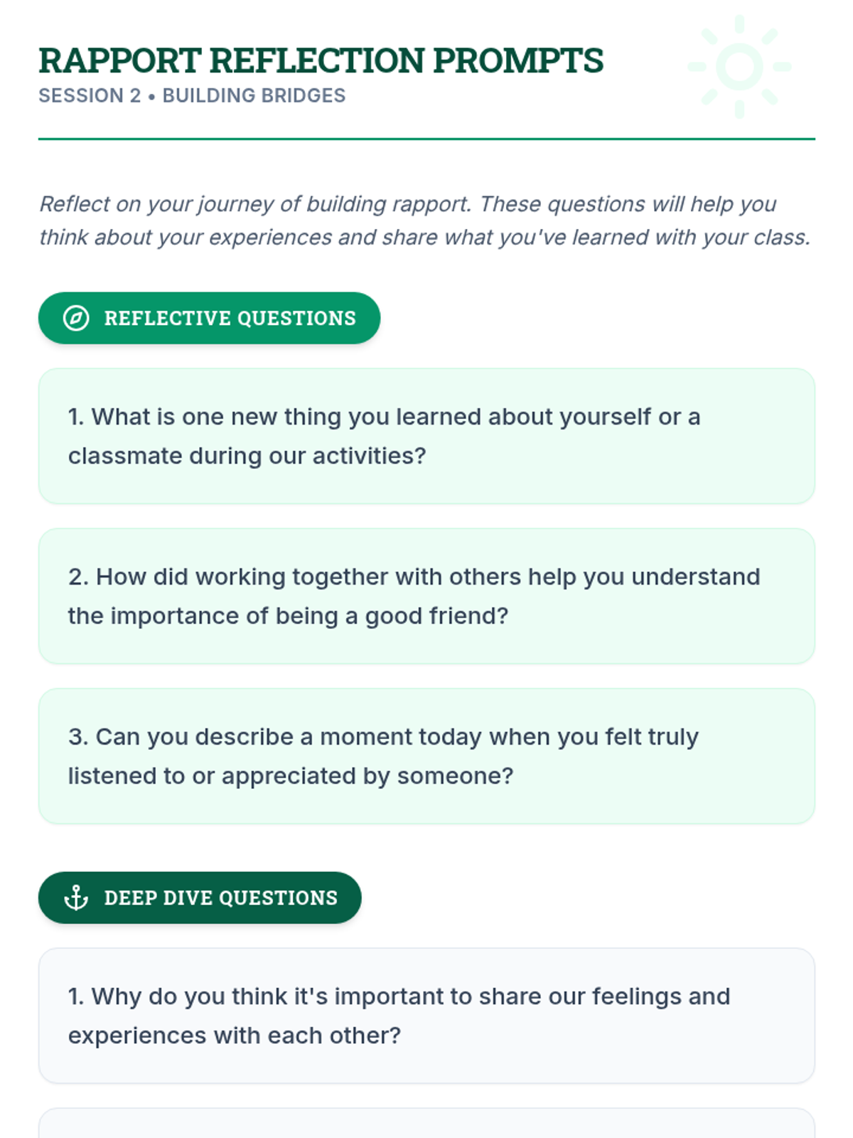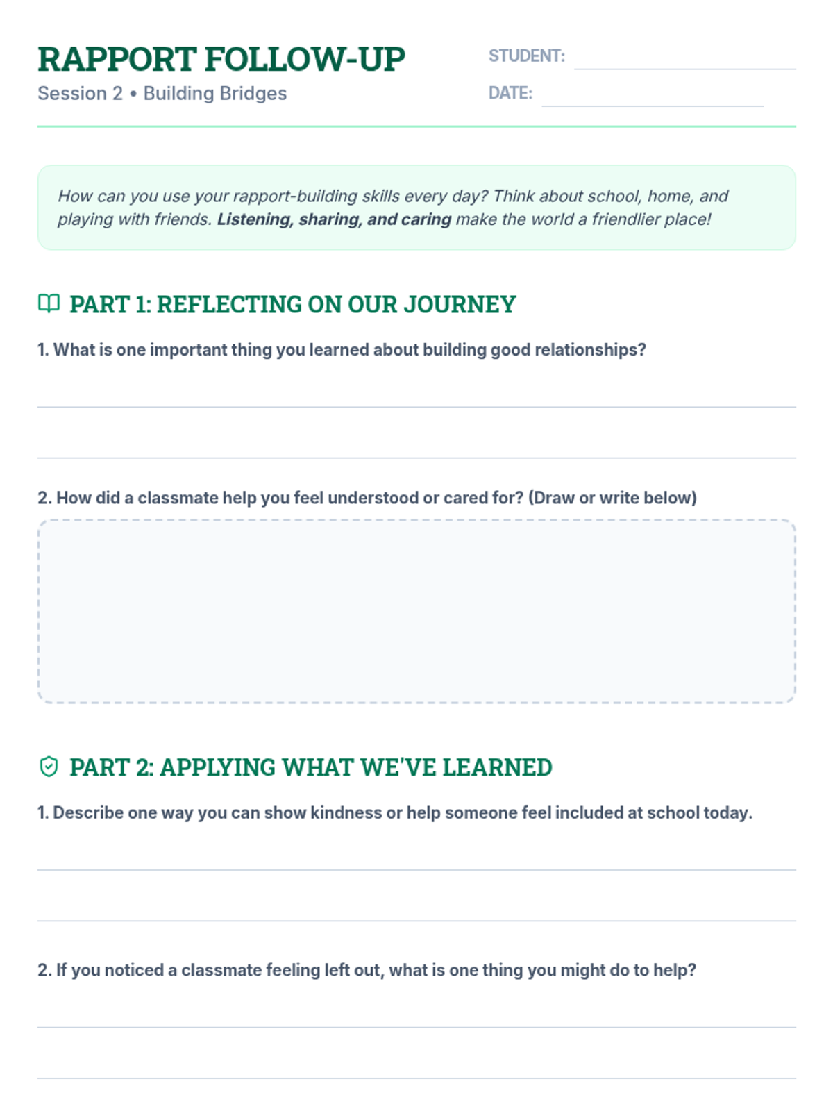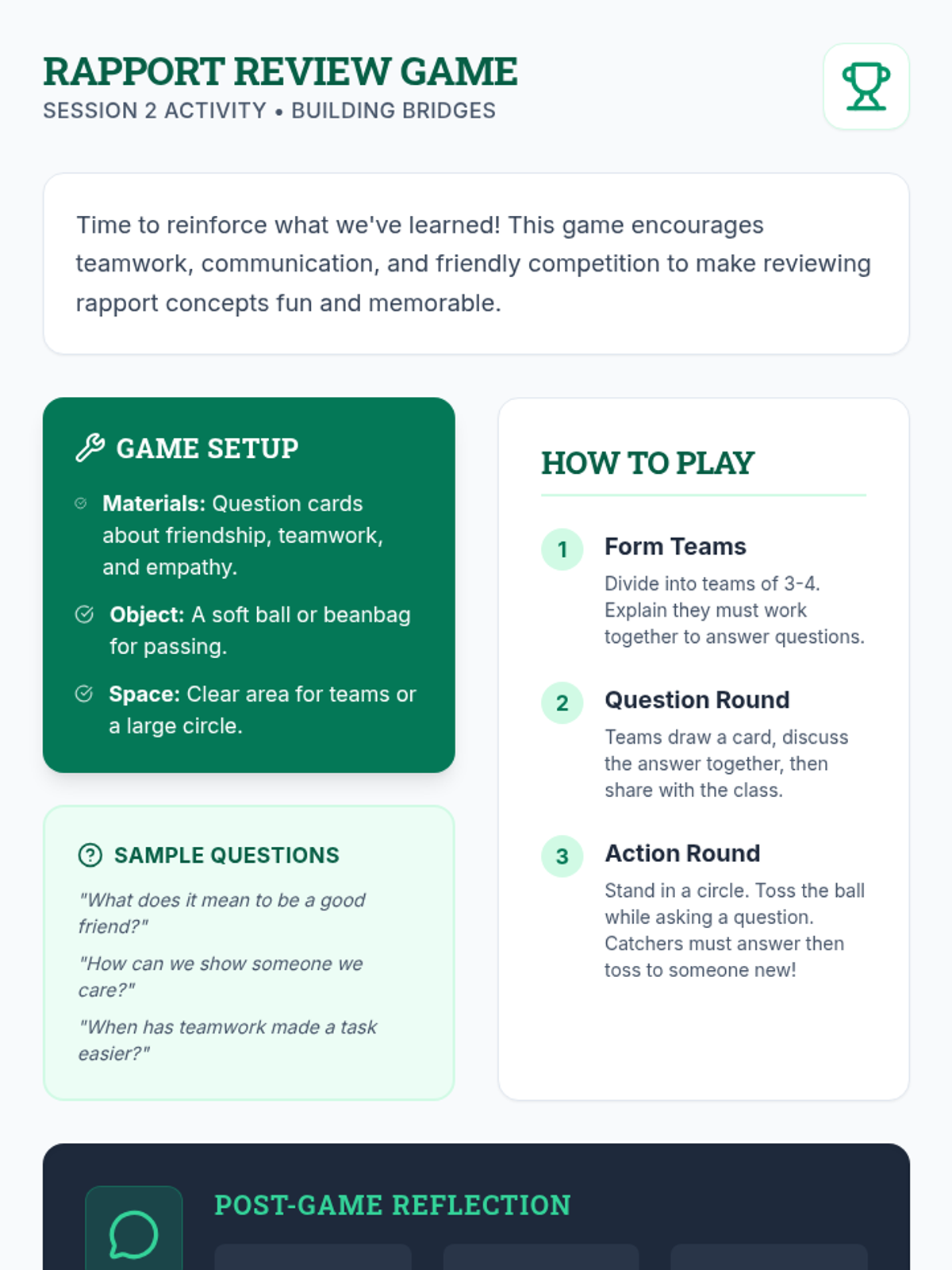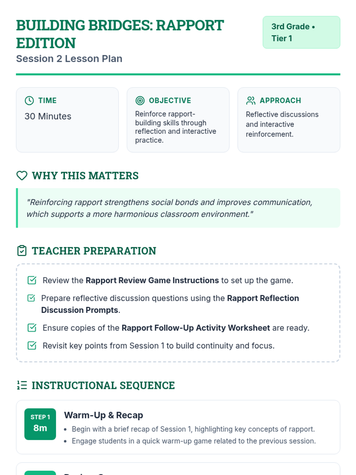 A two-session unit for 3rd graders focused on building rapport, communication, and teamwork through interactive games and reflective activities.