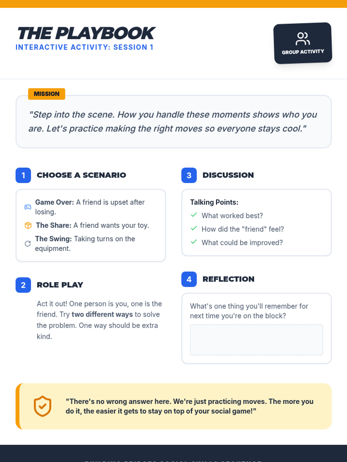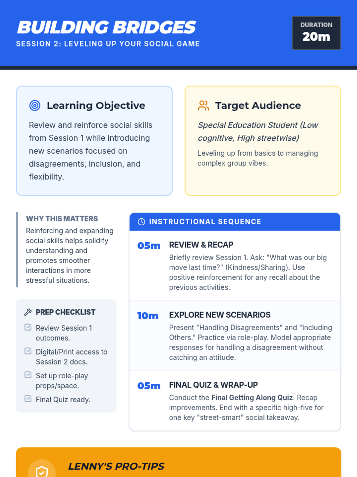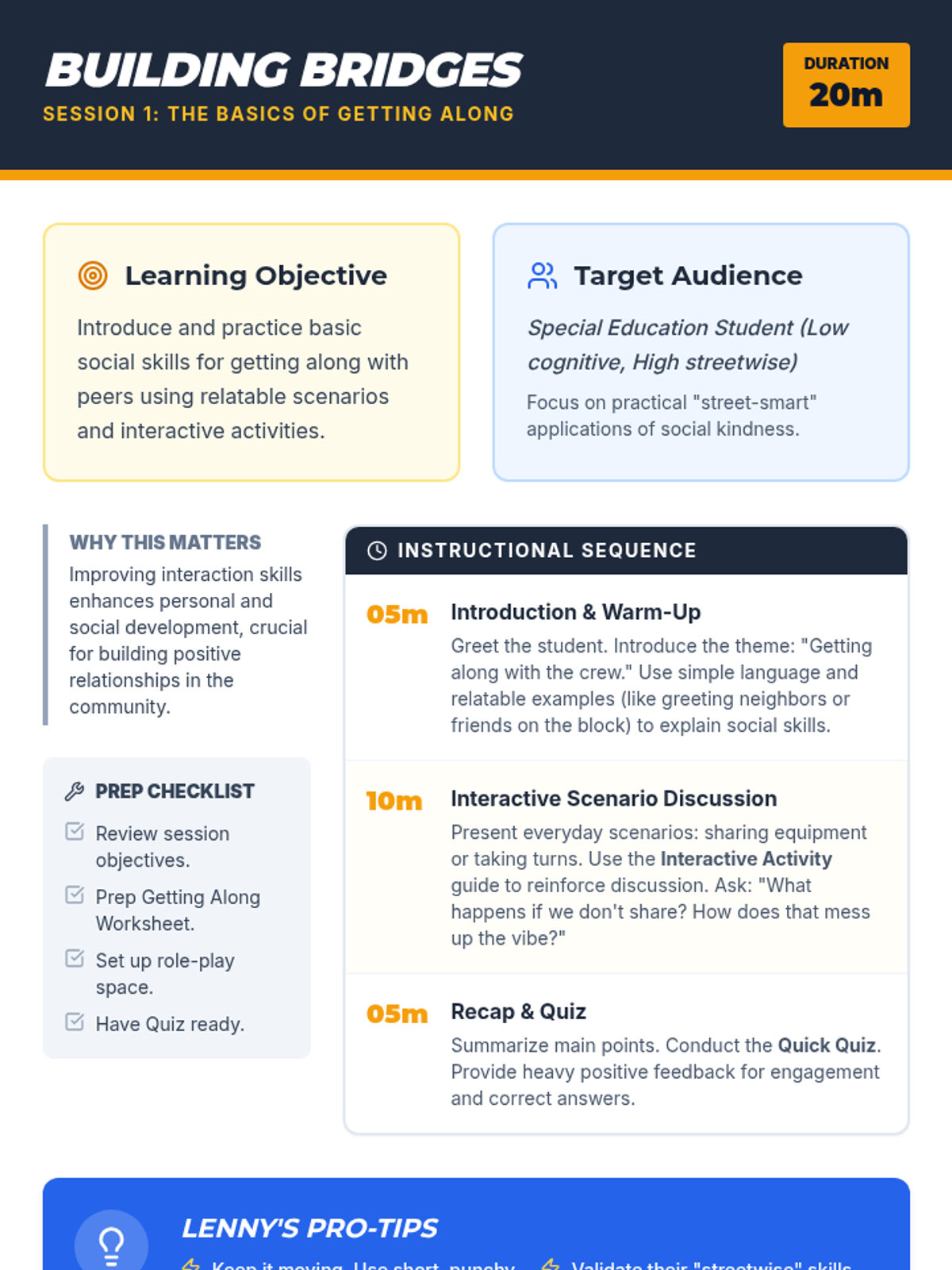 A social skills intervention sequence for special education students, focusing on practical strategies for peer interaction, sharing, and conflict resolution through relatable urban-themed scenarios.