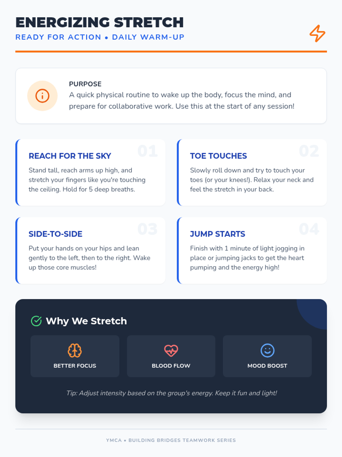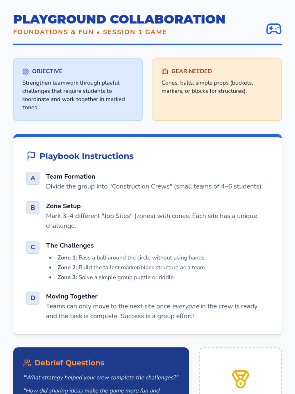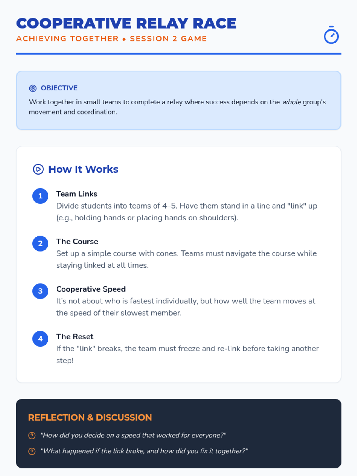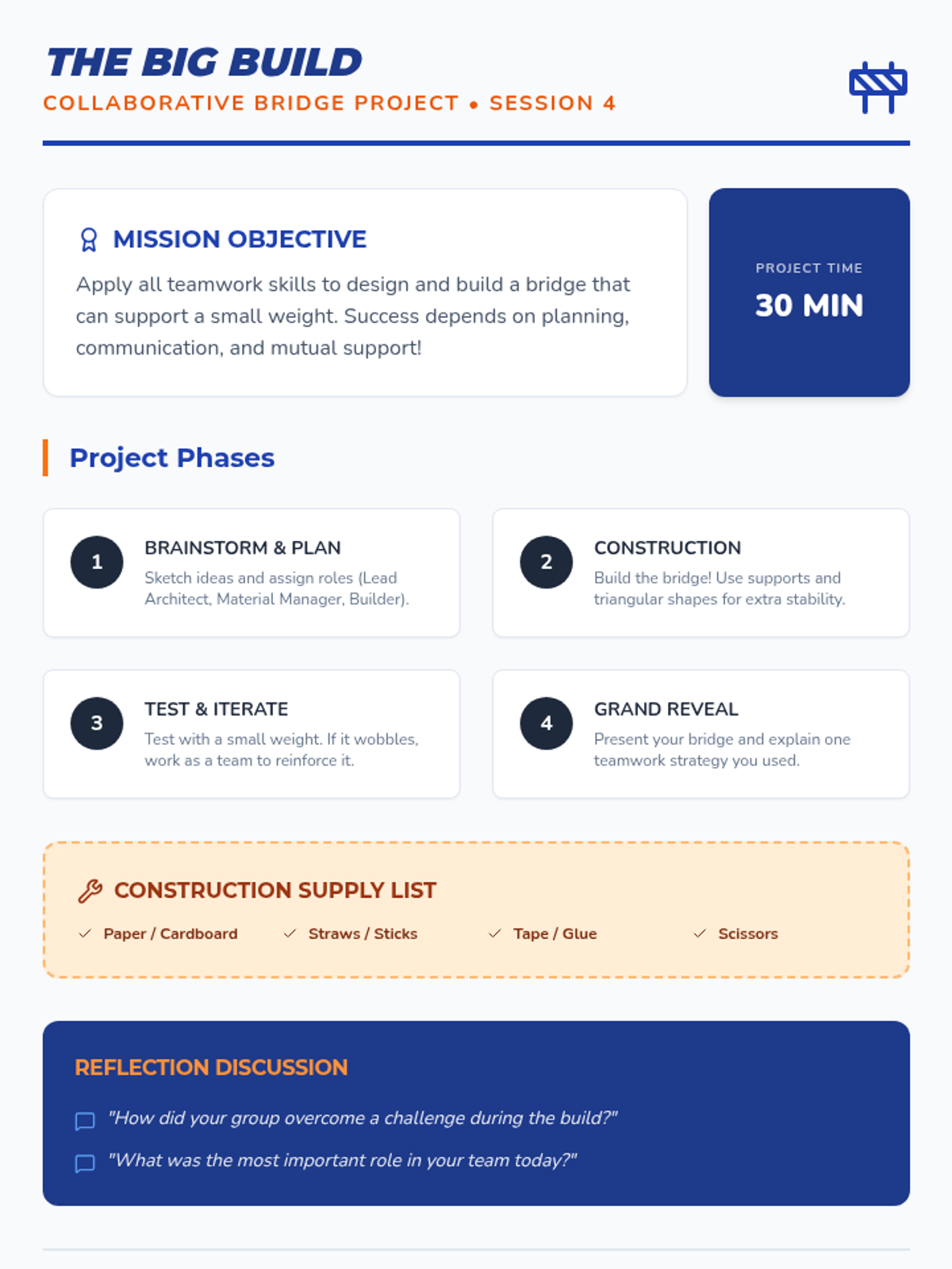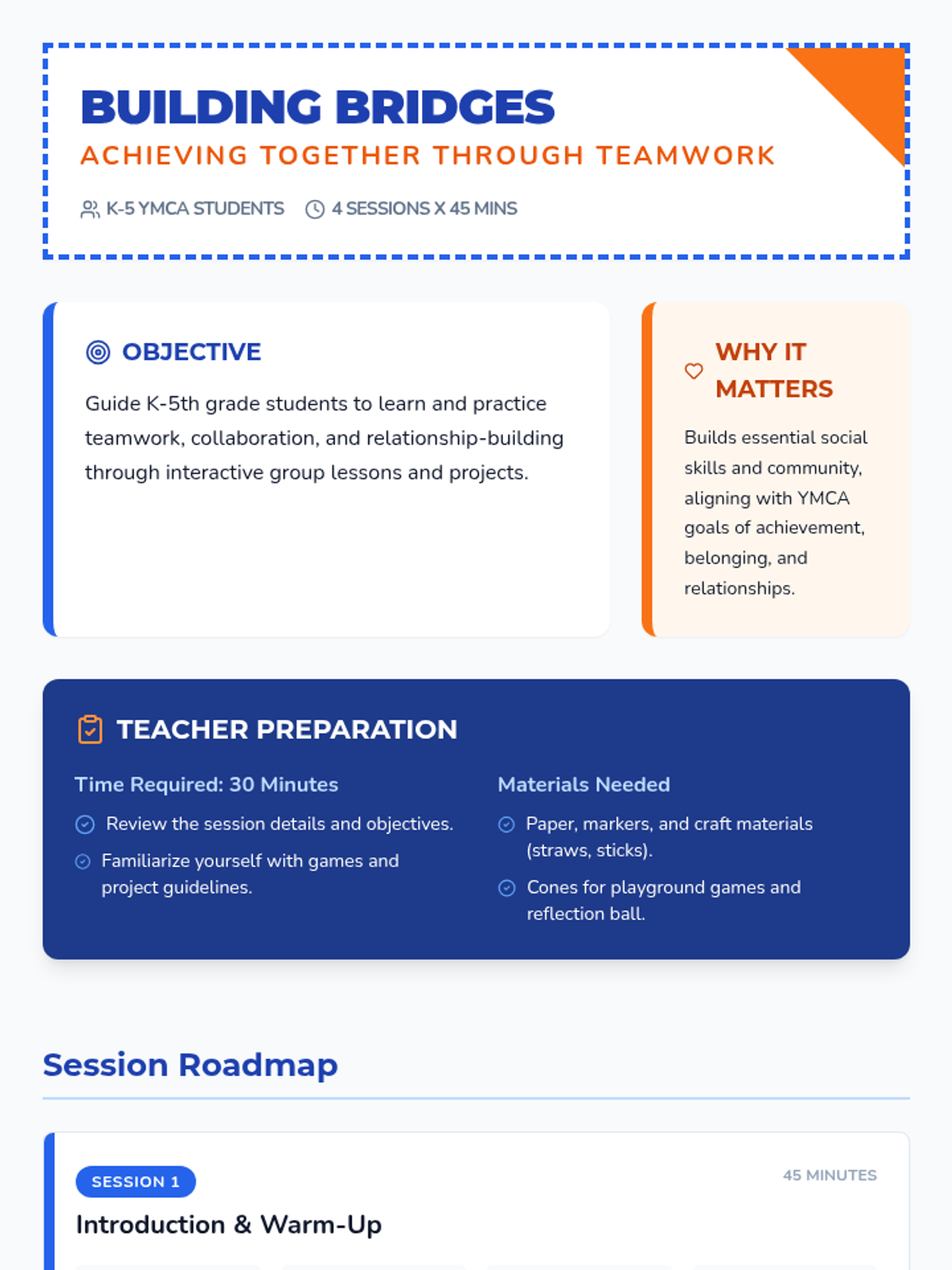 A 4-session program for K-5th graders at the YMCA focusing on achievement, belonging, and relationships through teamwork, trust-building, and a collaborative construction project.