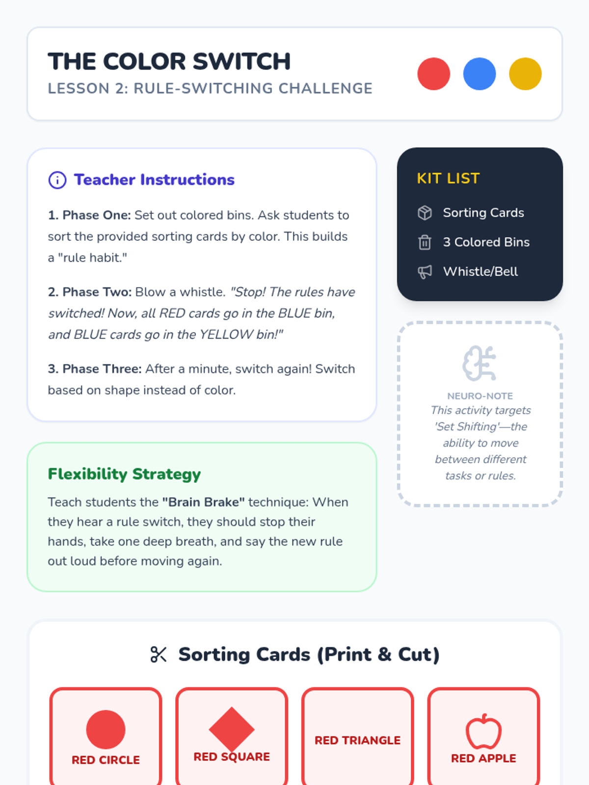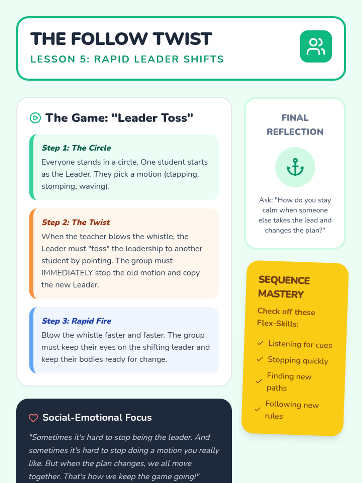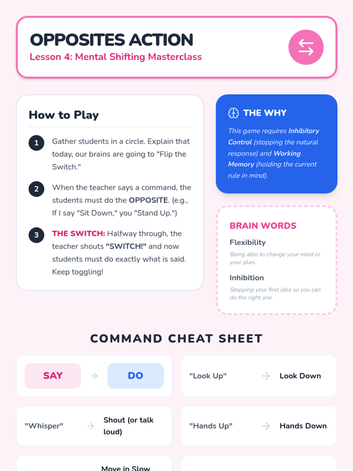 A game-based sequence for Kindergarten students to develop cognitive flexibility by practicing adaptation to changing rules and unexpected obstacles in a low-stakes environment.