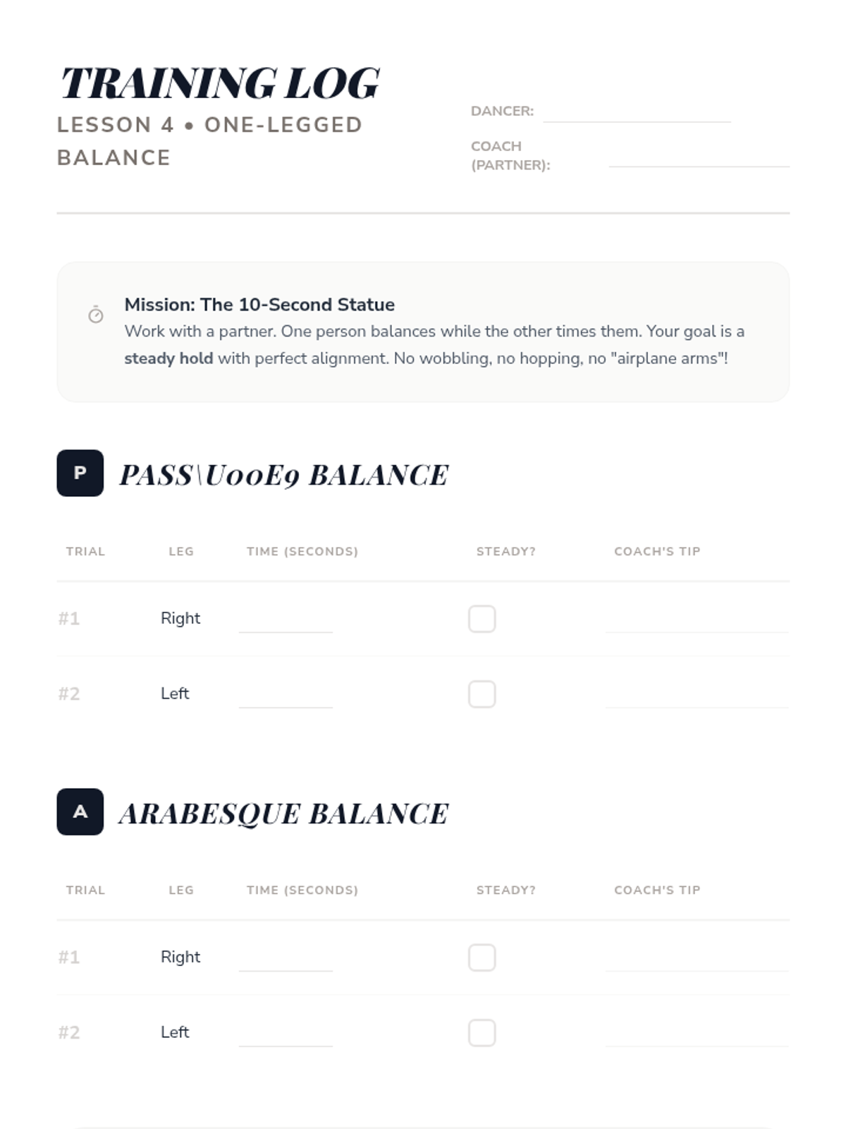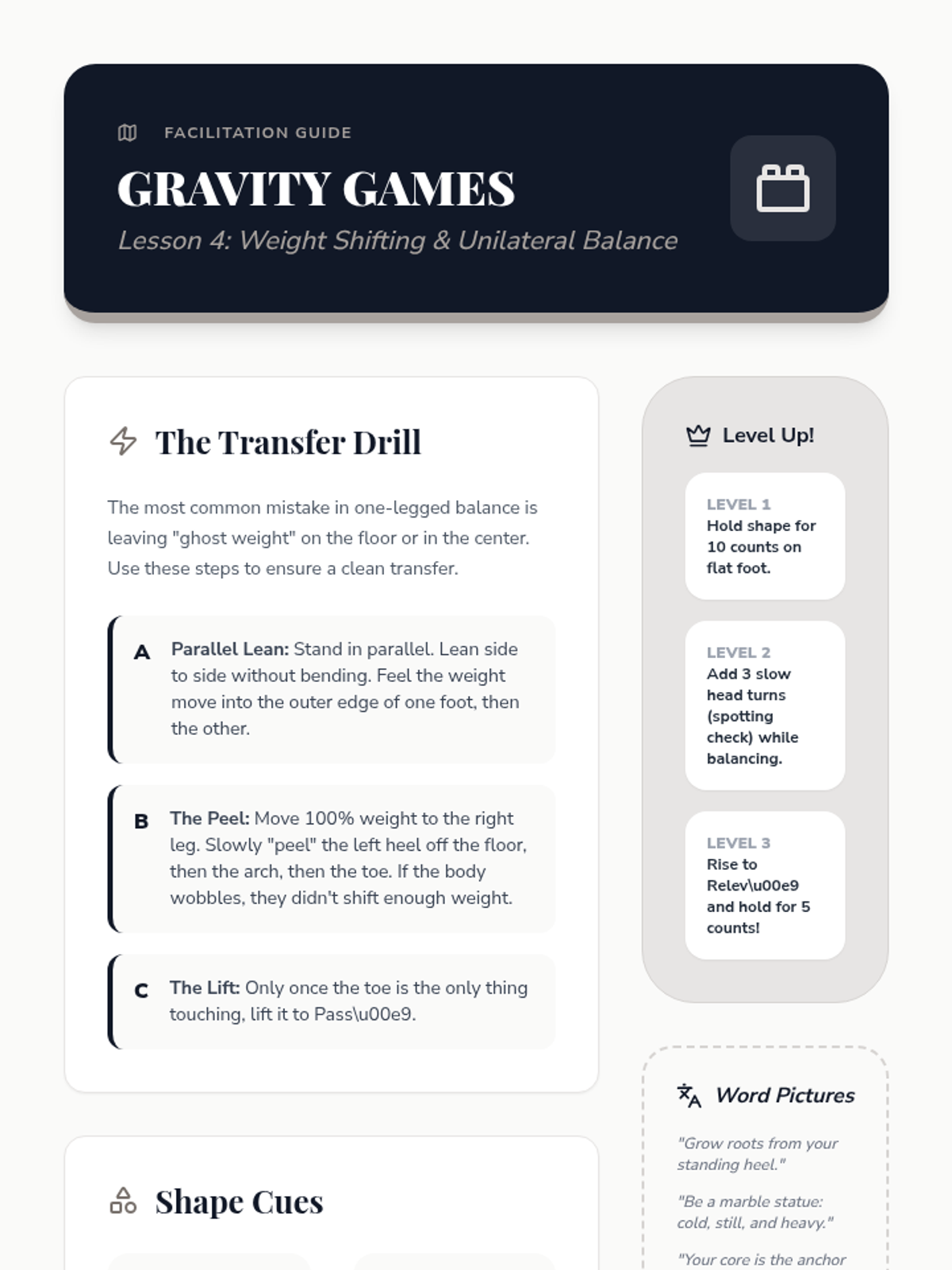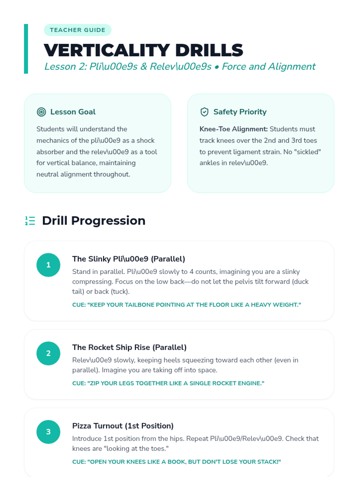 A foundational dance sequence for 3rd graders focusing on skeletal alignment, core stability, and basic technique. Students move from static posture to dynamic movement using ballet-based fundamentals like pli\u00e9s, relev\u00e9s, and spotting.