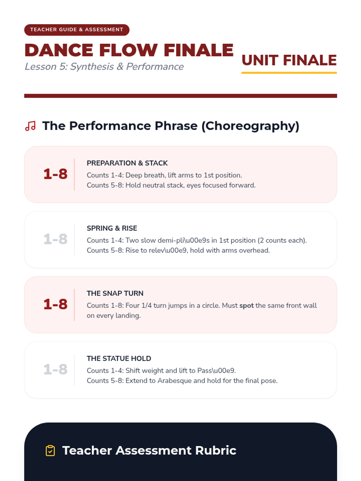 A four-day music and movement unit for K-3 students focused on collaboration, rhythm, and creative choreography. Groups work together to select songs and build original dance routines.