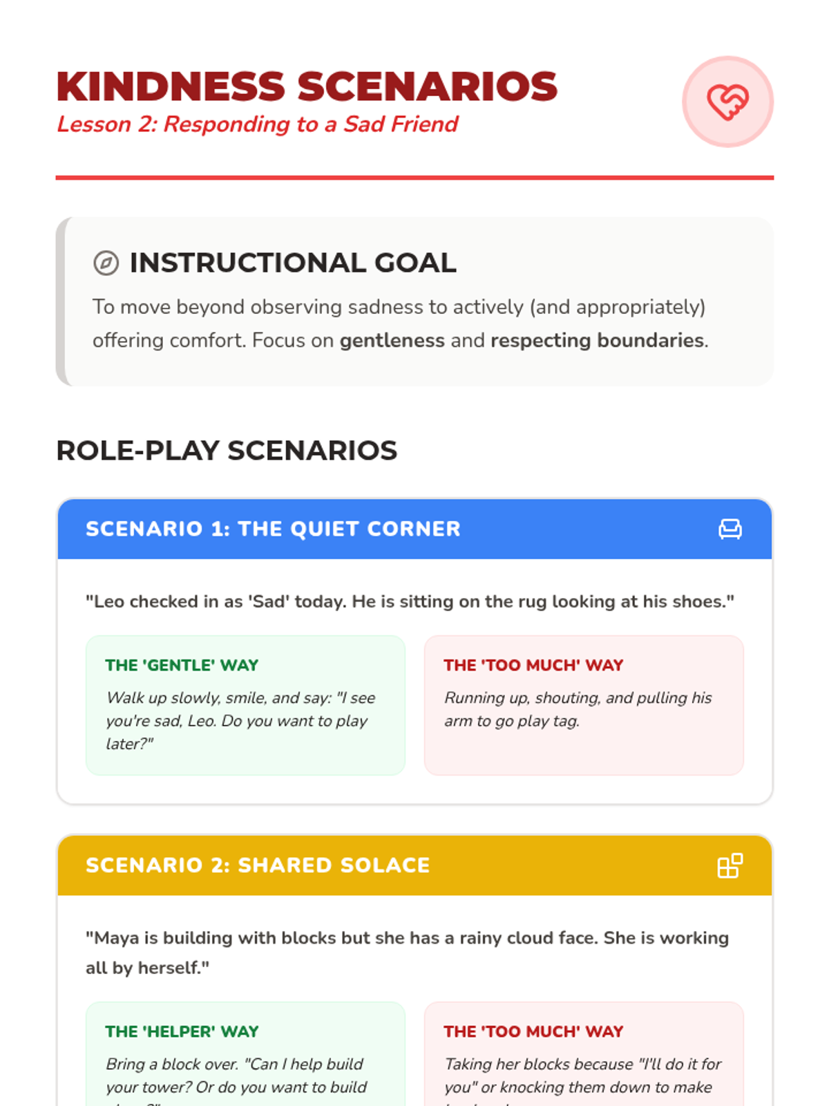 This sequence teaches Pre-K students how to use daily check-in data to foster empathy and social awareness. Students learn to observe how their peers are feeling and practice appropriate, regulated responses to support their classroom community.