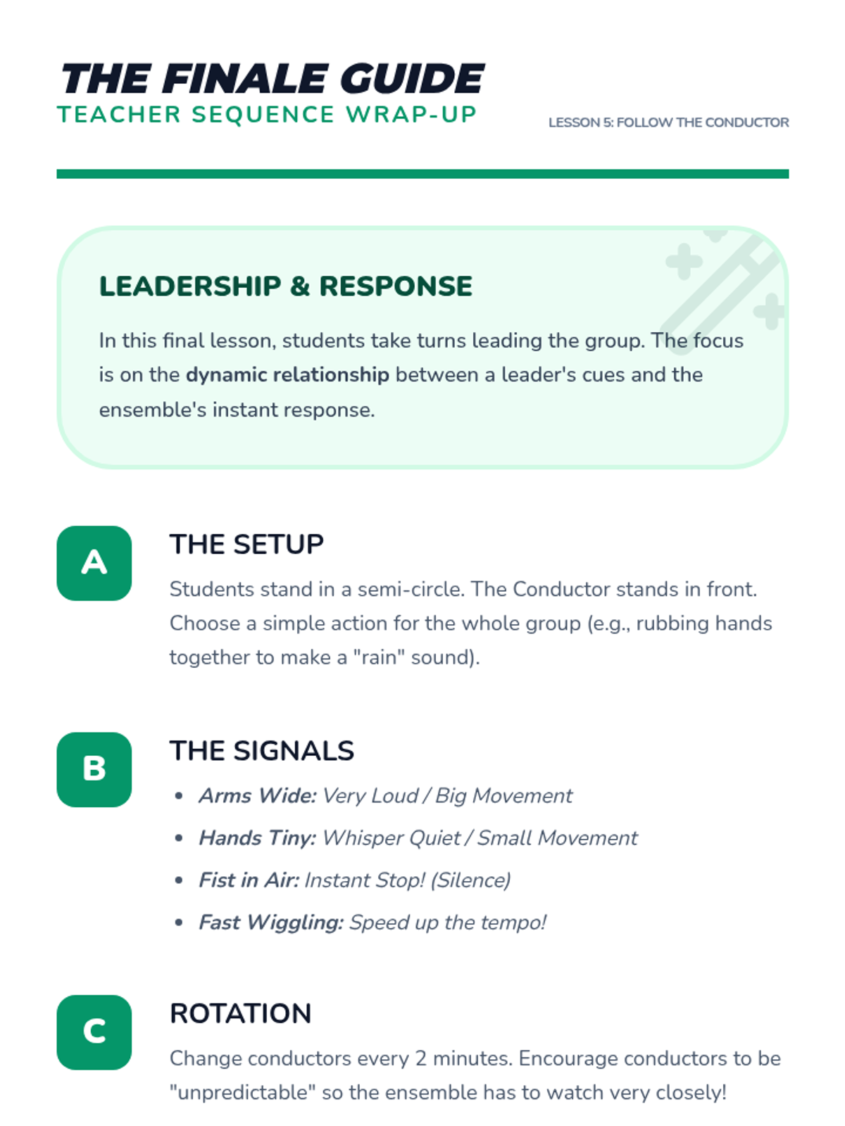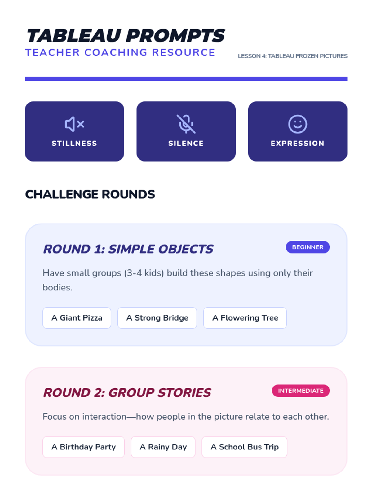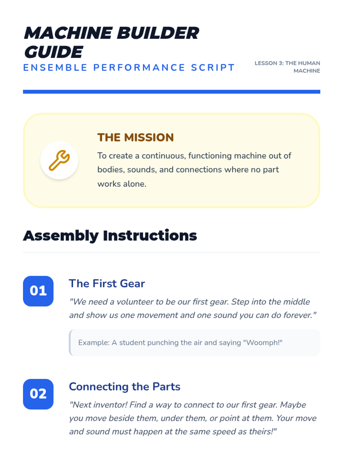 This performing arts sequence for Kindergarten focuses on building ensemble skills through movement, rhythm, and non-verbal communication. Students progress from partner mirroring to complex group coordination, learning that their individual contributions are essential to a collective performance.