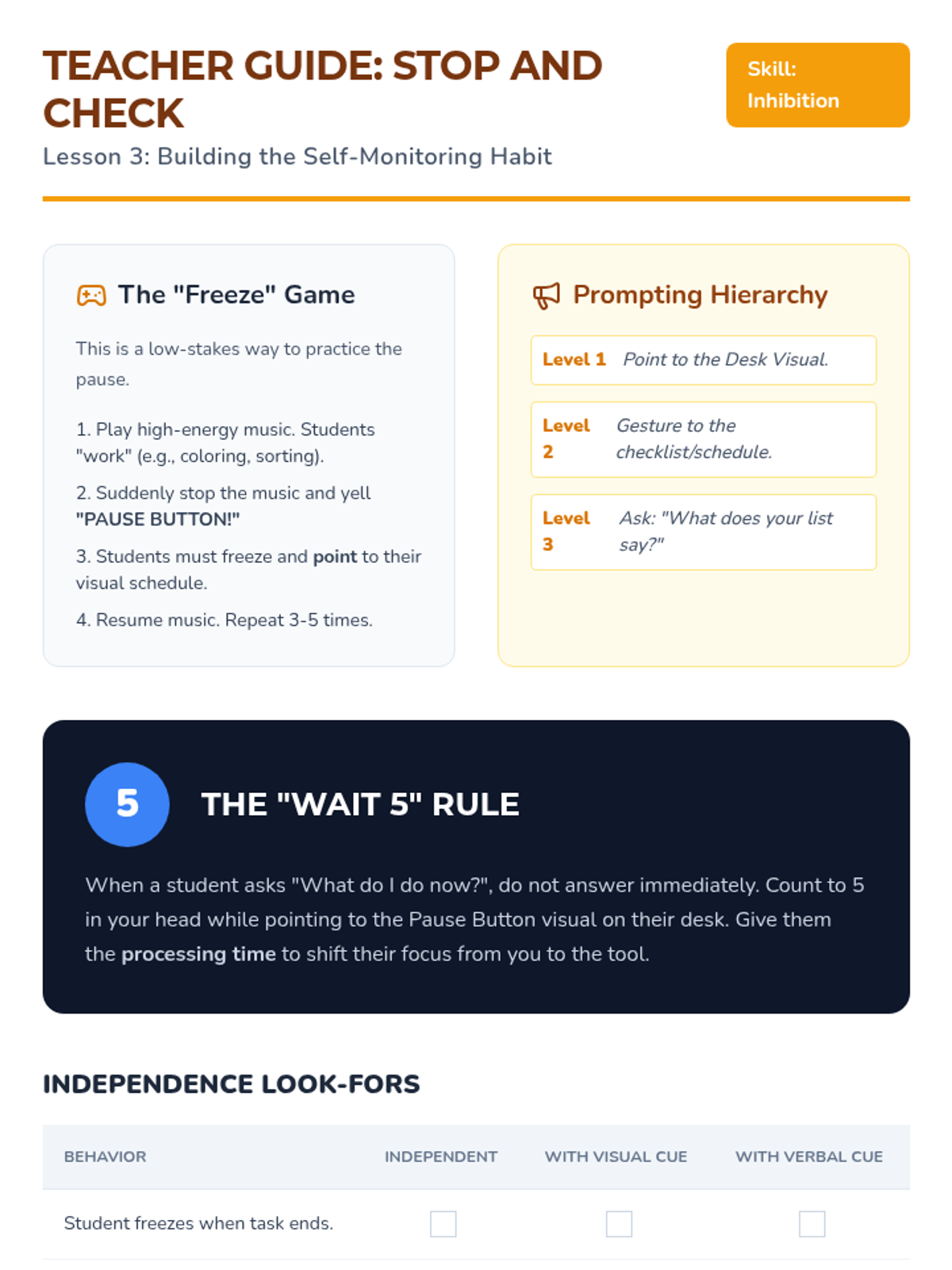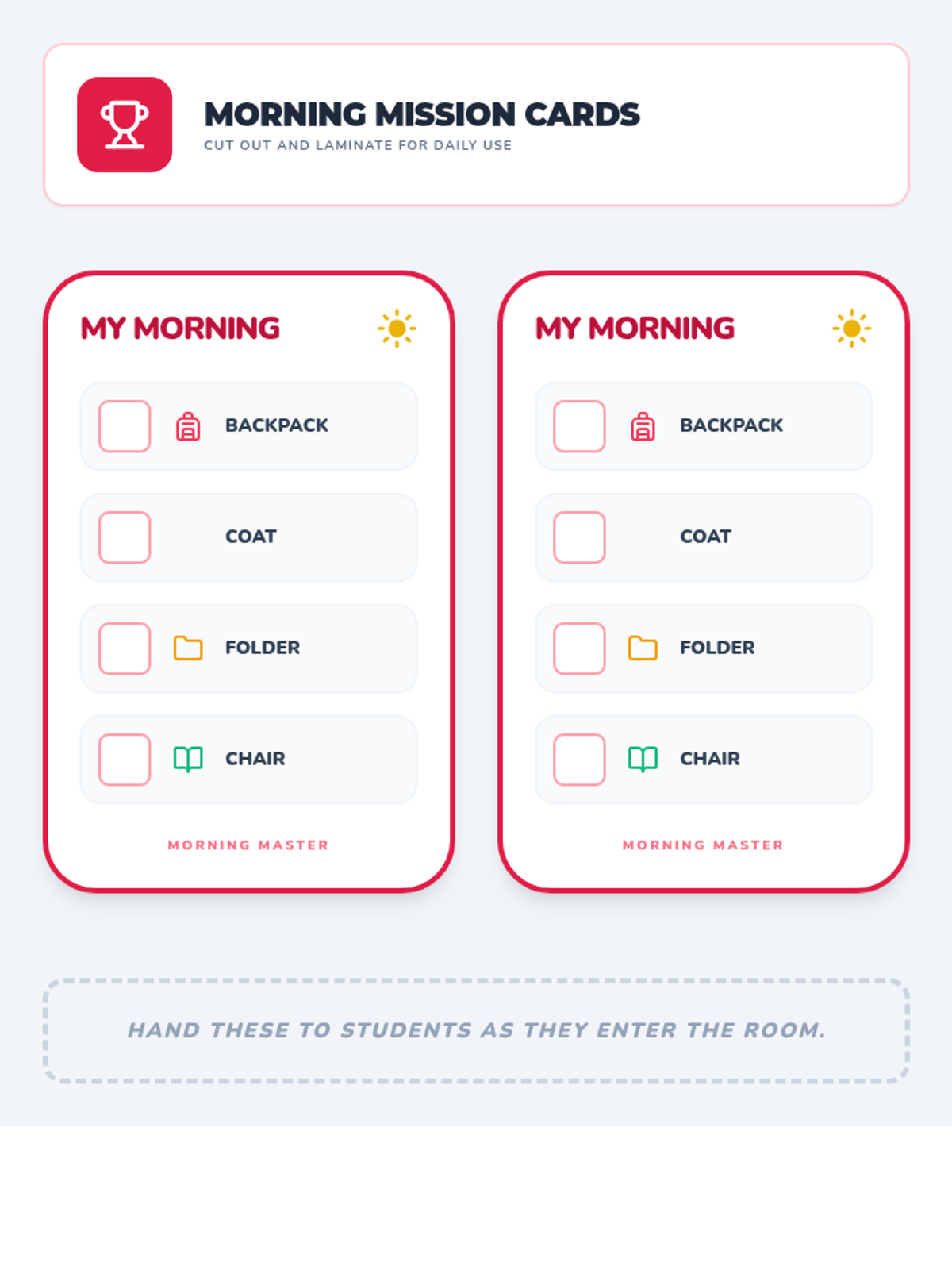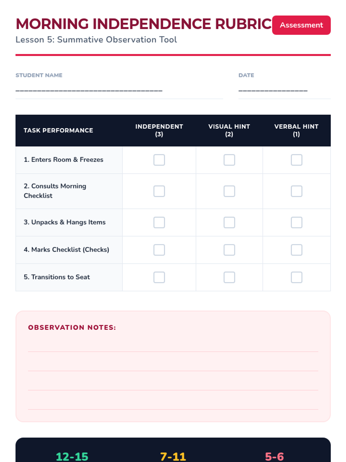 A 1st Grade Special Education sequence designed to build student autonomy and self-monitoring skills using visual checklists and timers. Students progress from simple item-matching to independent morning routines.