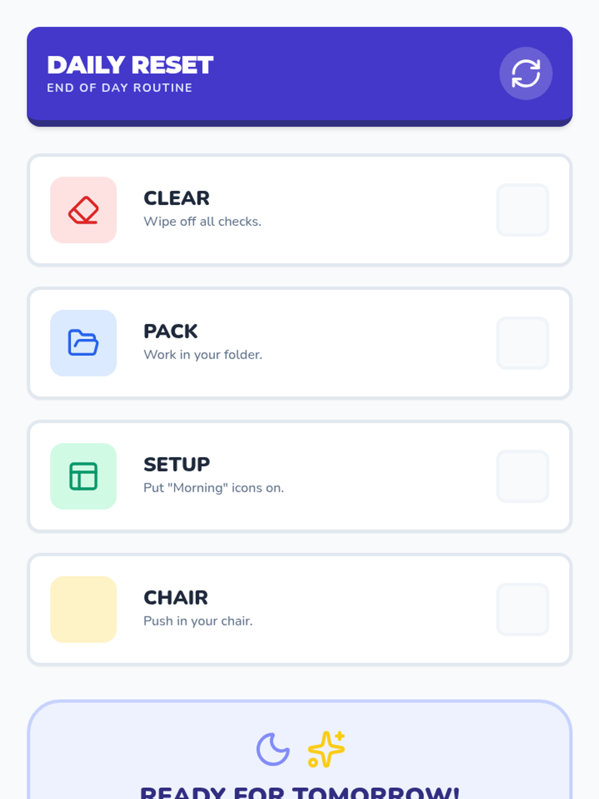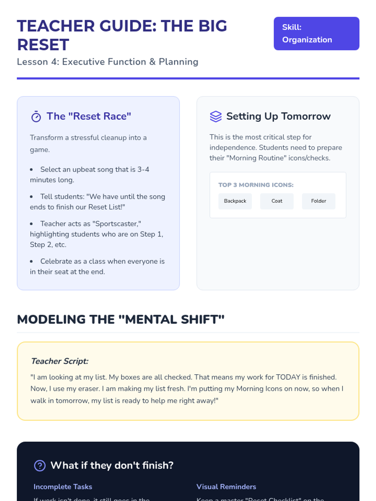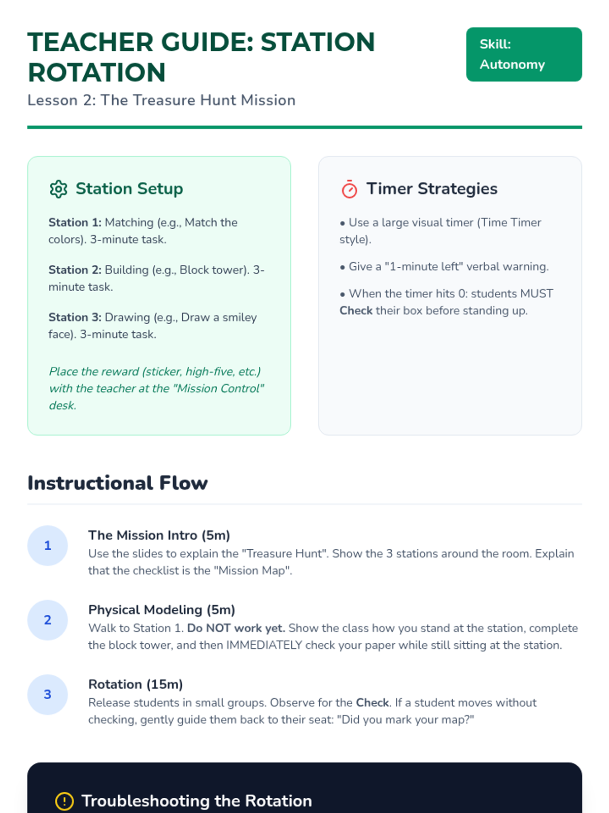 A 1st Grade Special Education sequence designed to build student autonomy and self-monitoring skills using visual checklists and timers. Students progress from simple item-matching to independent morning routines.