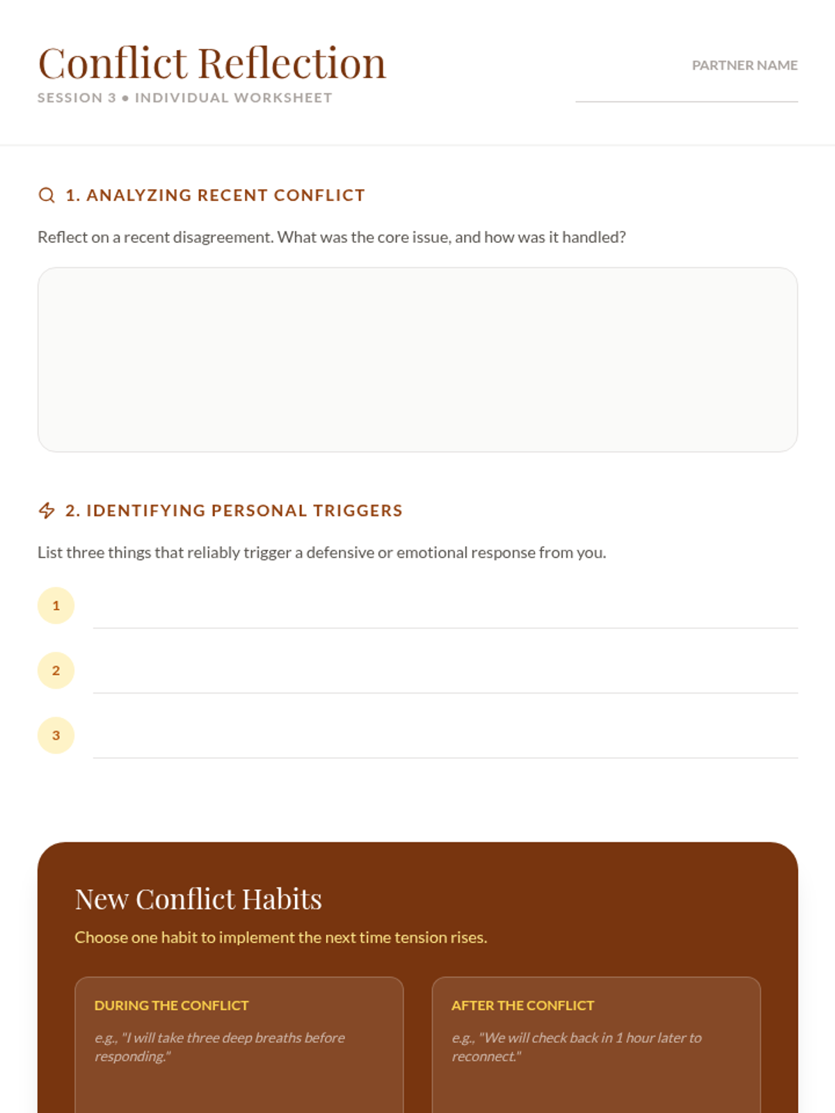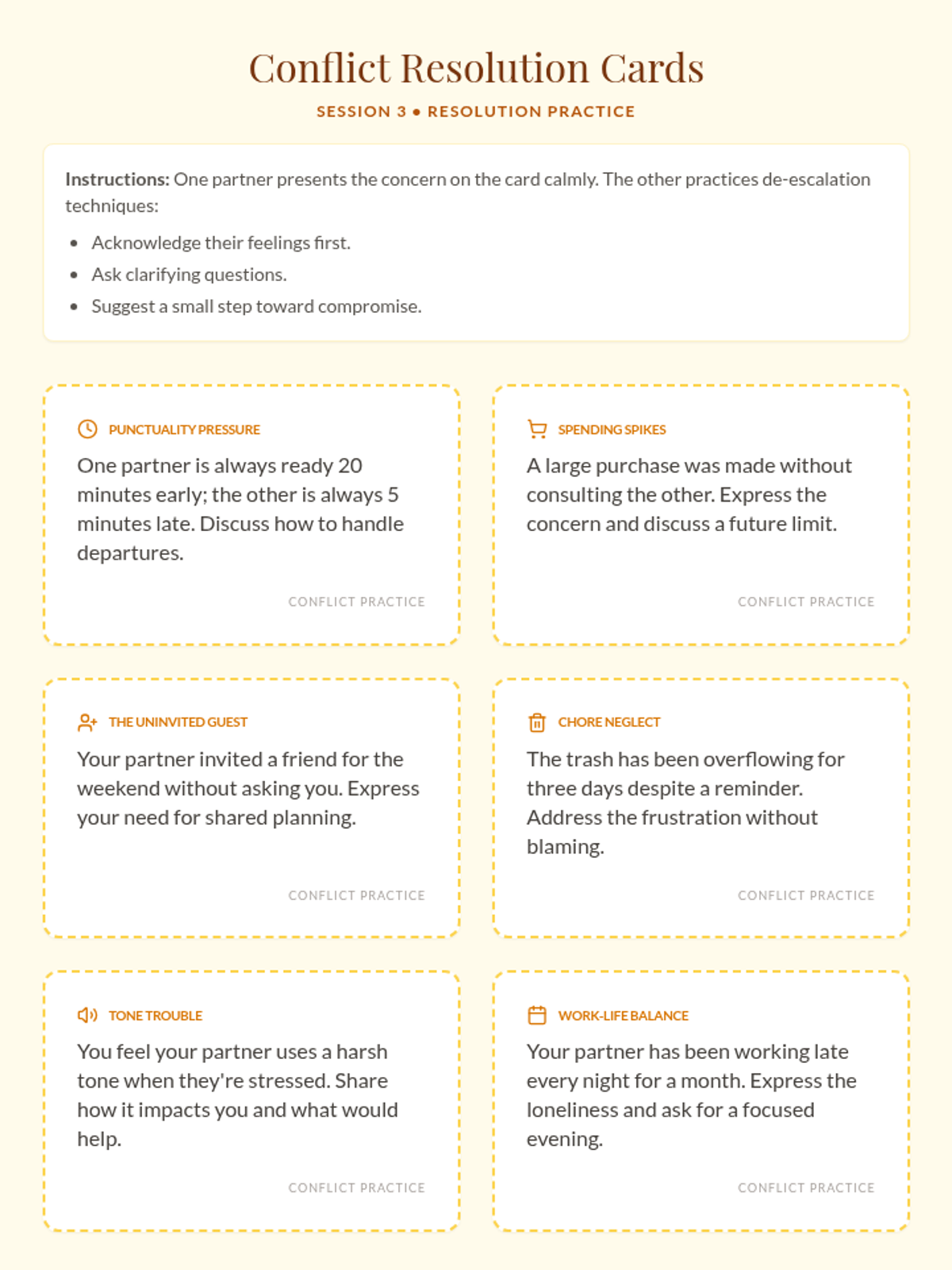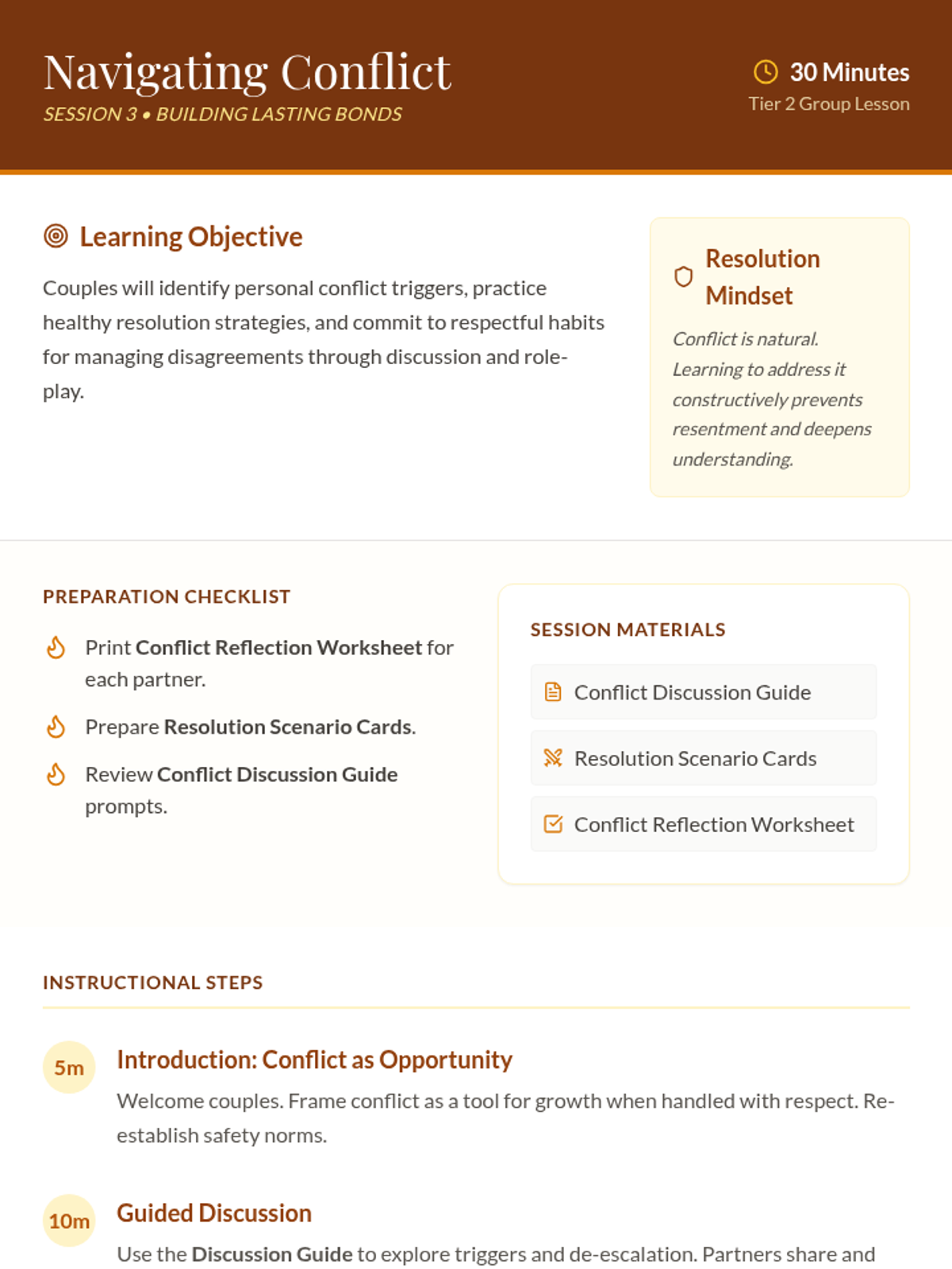 A 6-session couples’ workshop exploring key aspects of romantic relationships, including trust, communication, and conflict resolution. This sequence provides structured tools and activities to deepen emotional intimacy and strengthen partnership bonds.