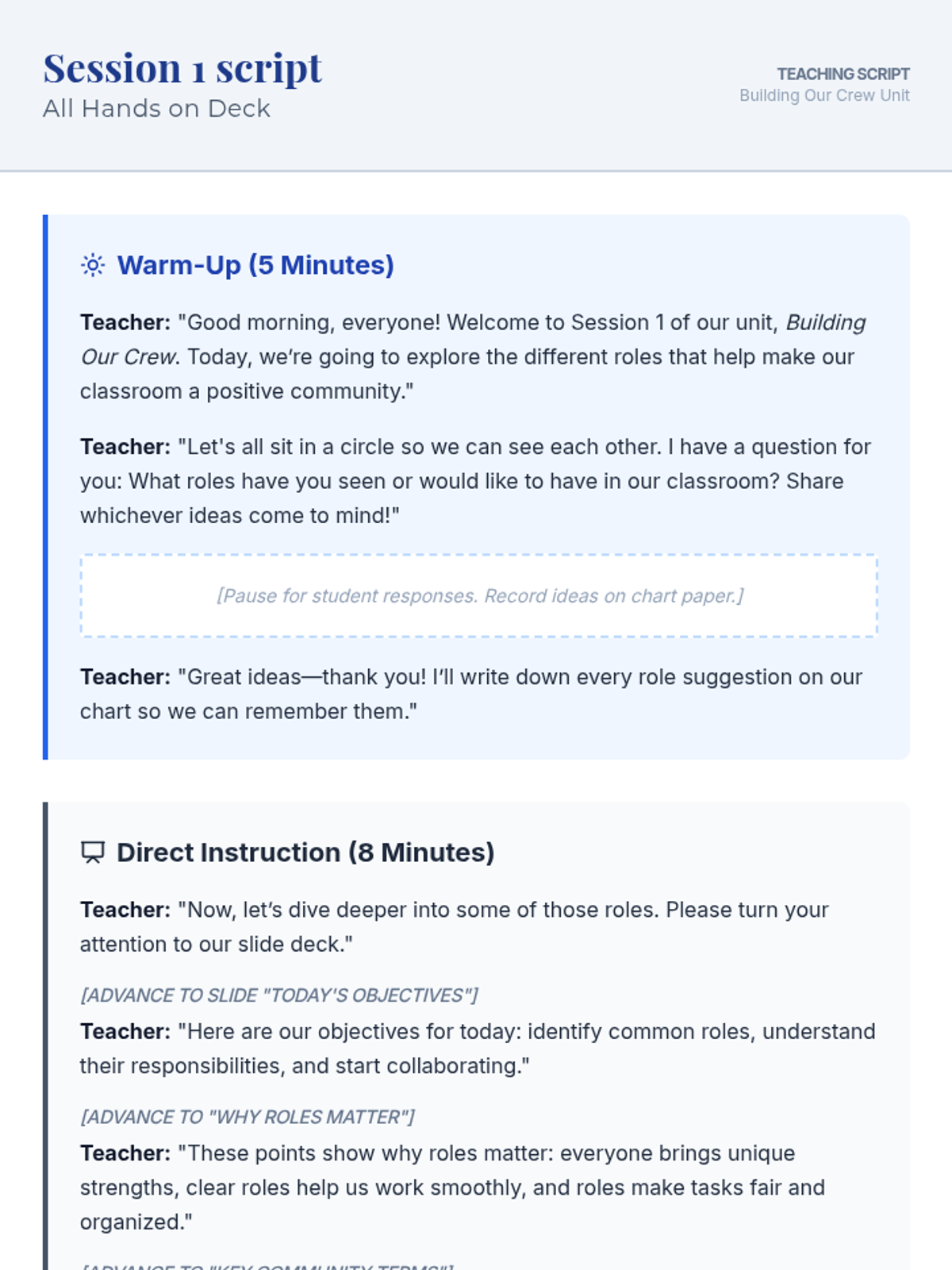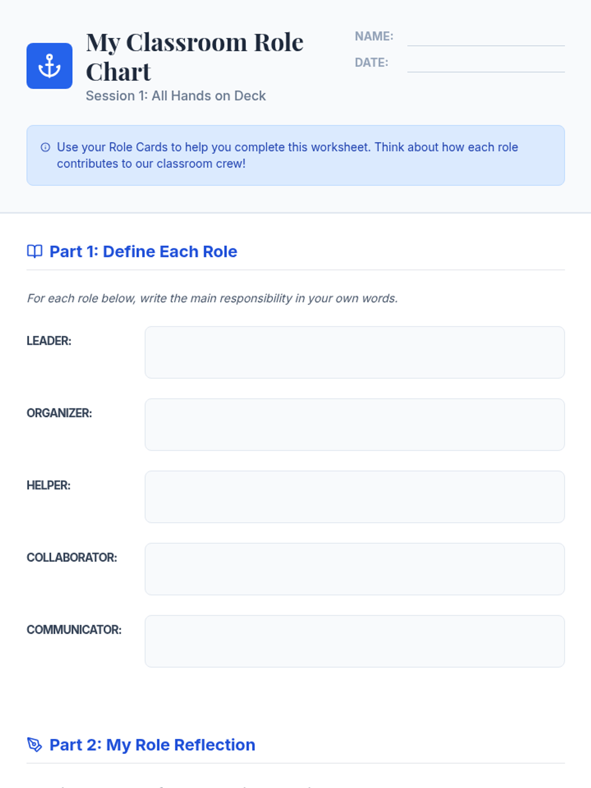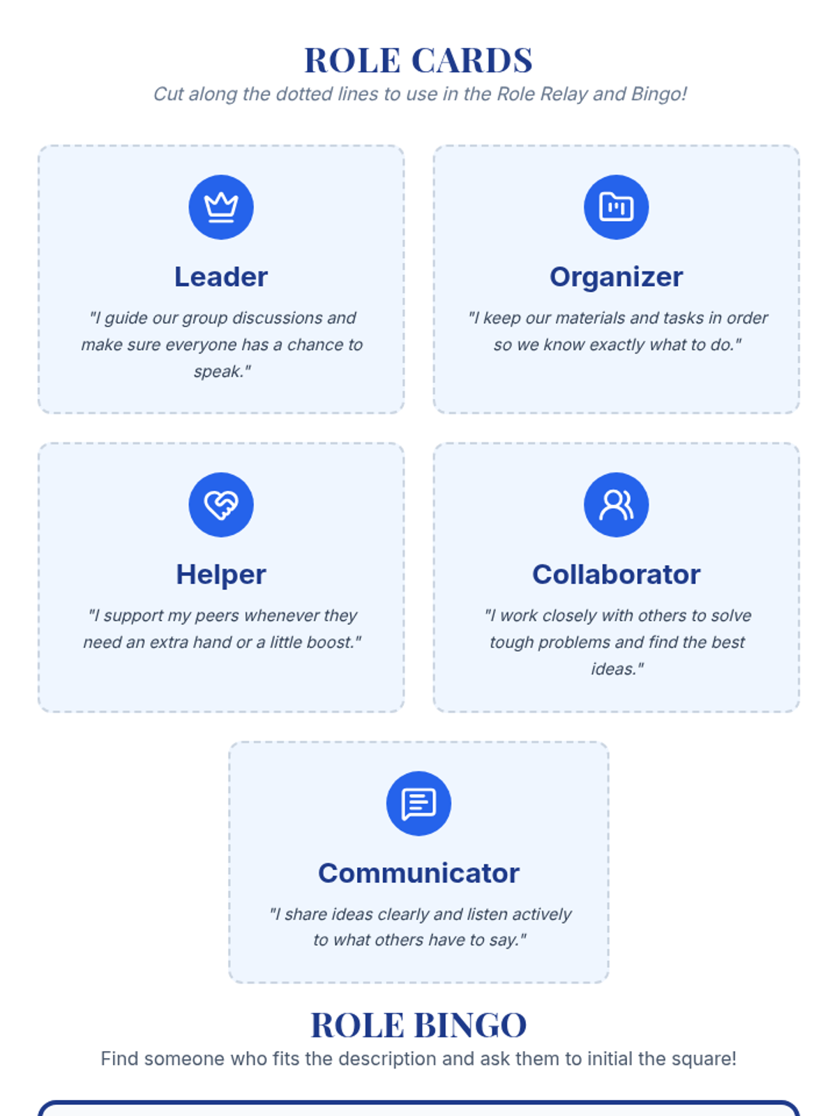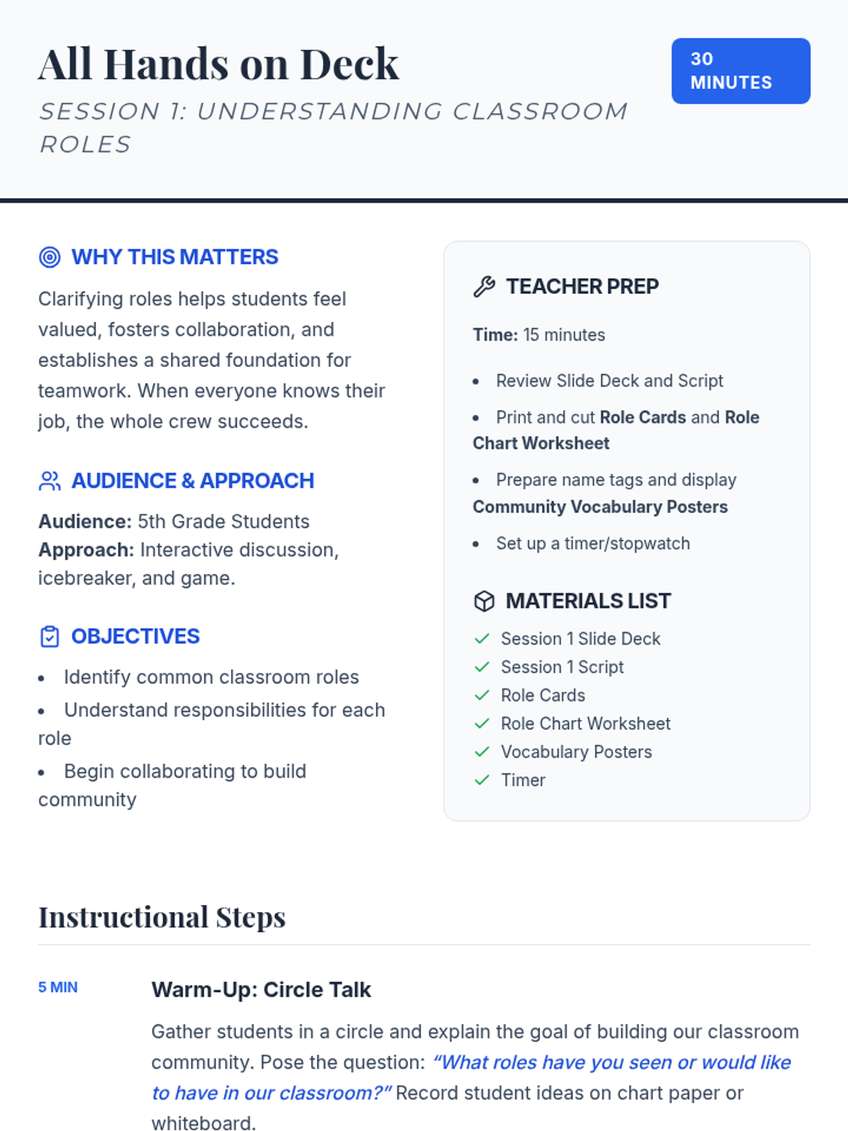 A three-session Tier 1 classroom unit for 5th graders focused on building a positive classroom community through roles, communication skills, and shared norms. Students will transition from individual roles to collaborative communication and finally to collective agreements.