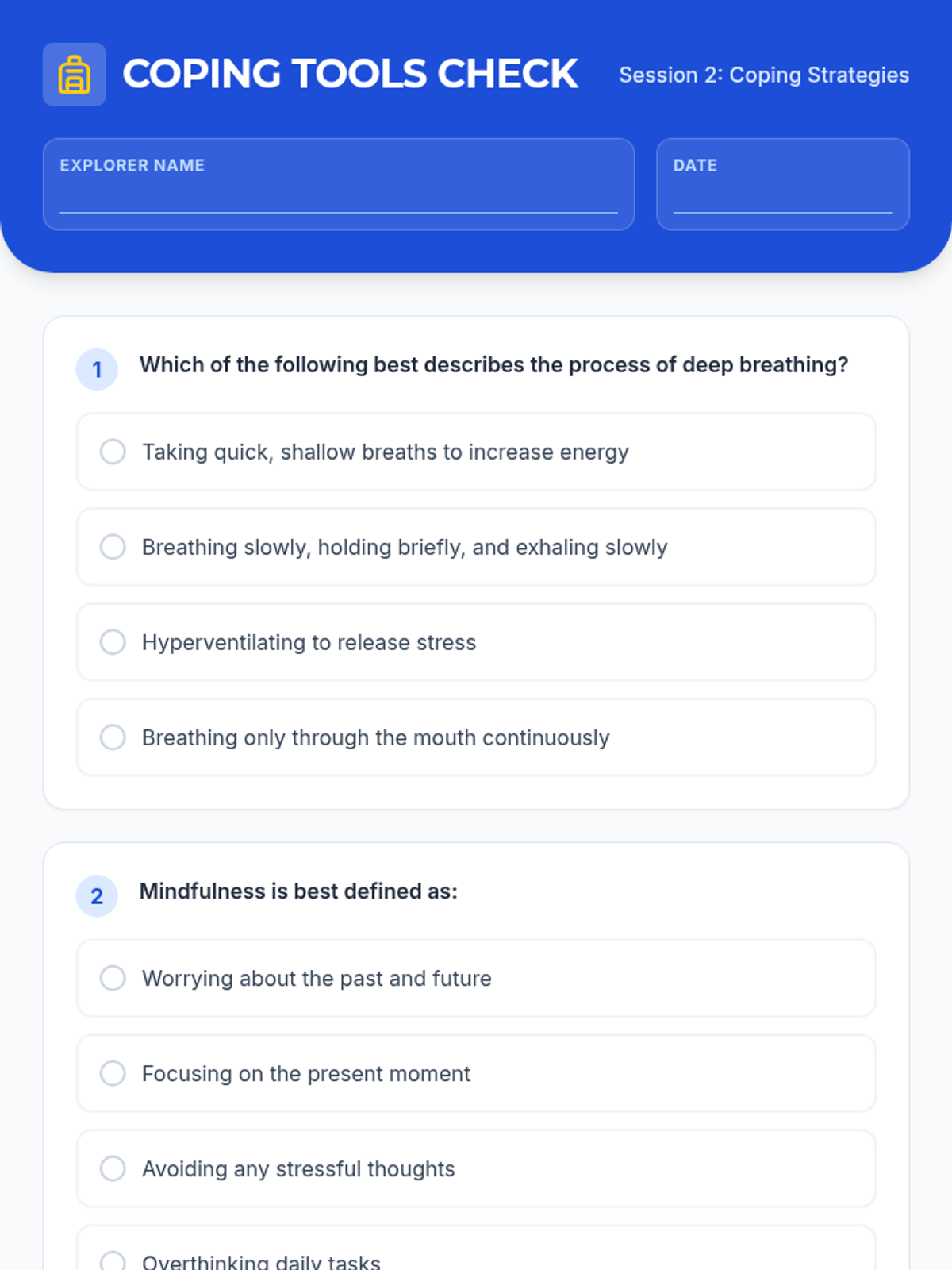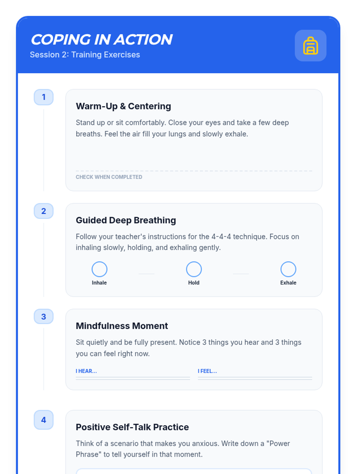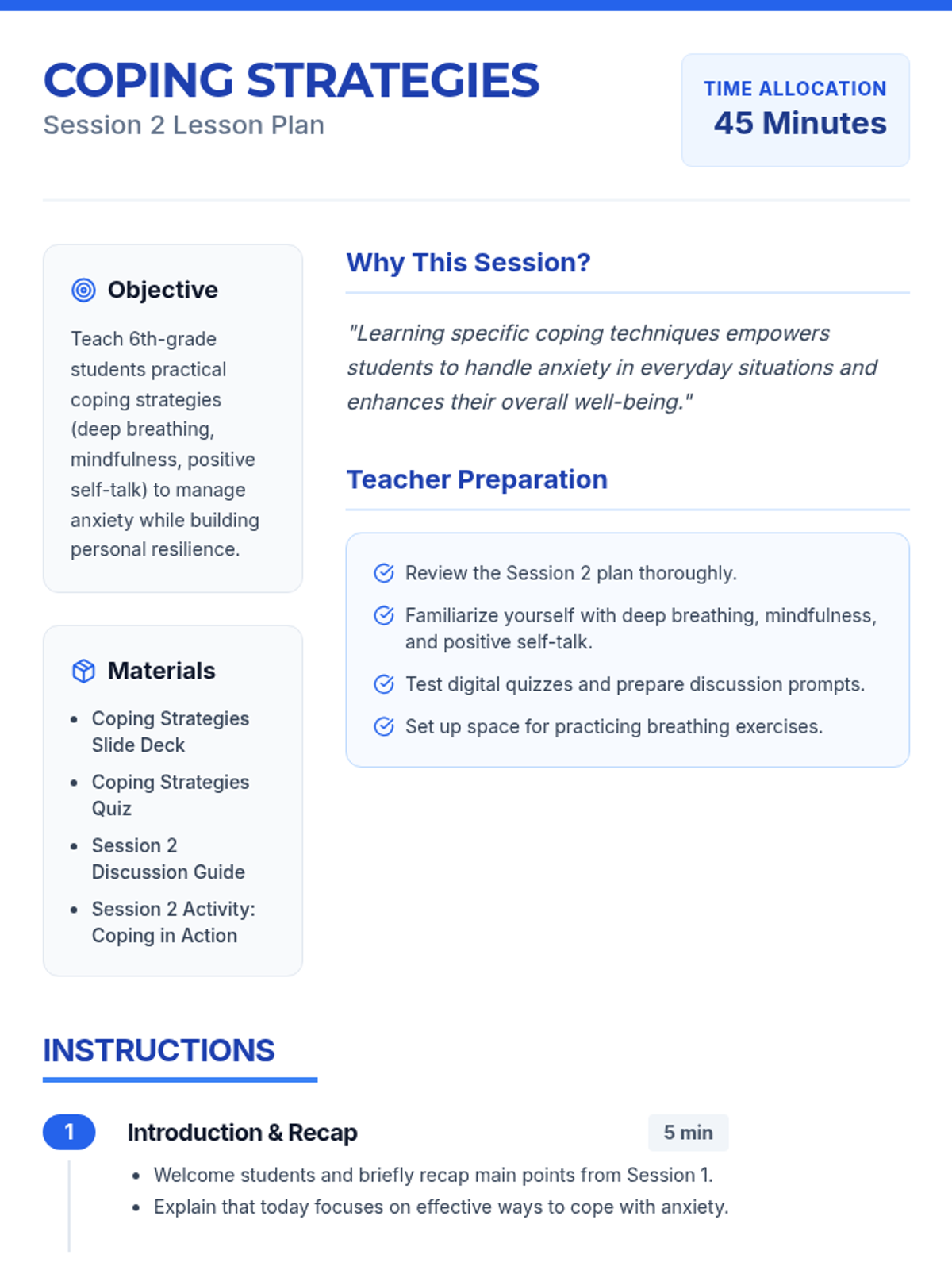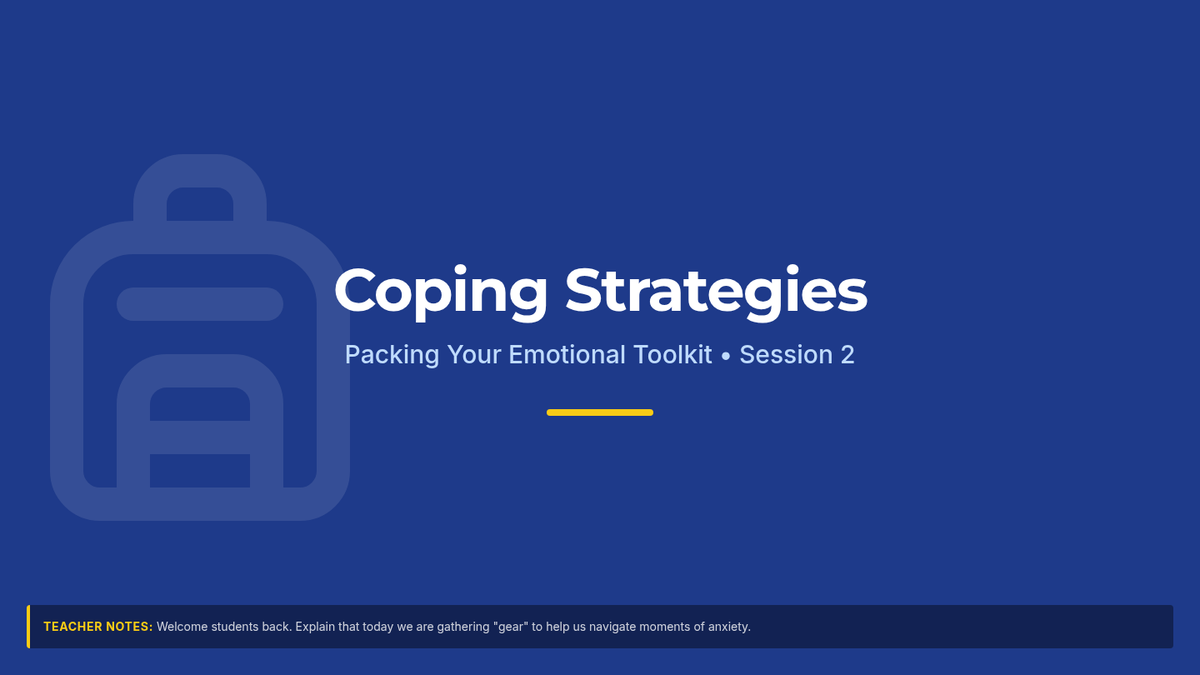 This 6-session series (4 sessions detailed here) is designed for 6th-grade students to develop anxiety management and resiliency skills. Students will learn to recognize signs of anxiety, practice coping strategies, build resilience through challenges, and increase emotional awareness.