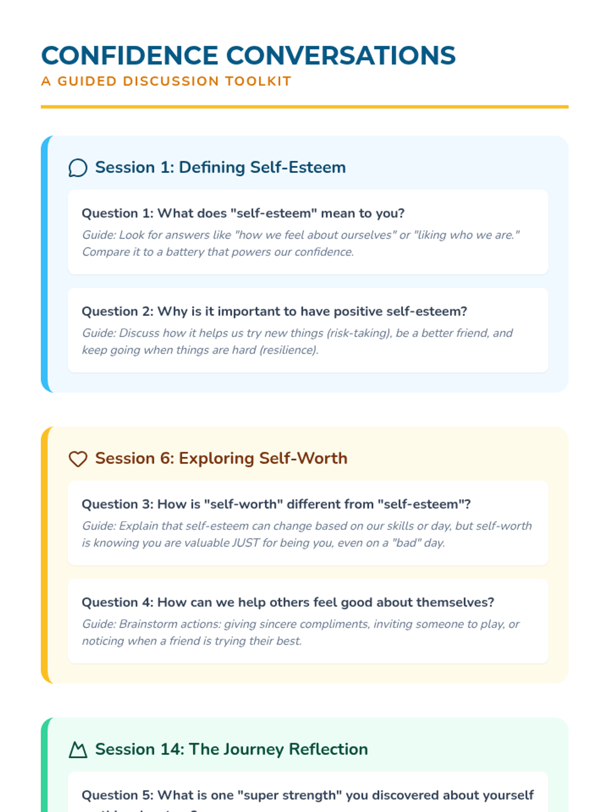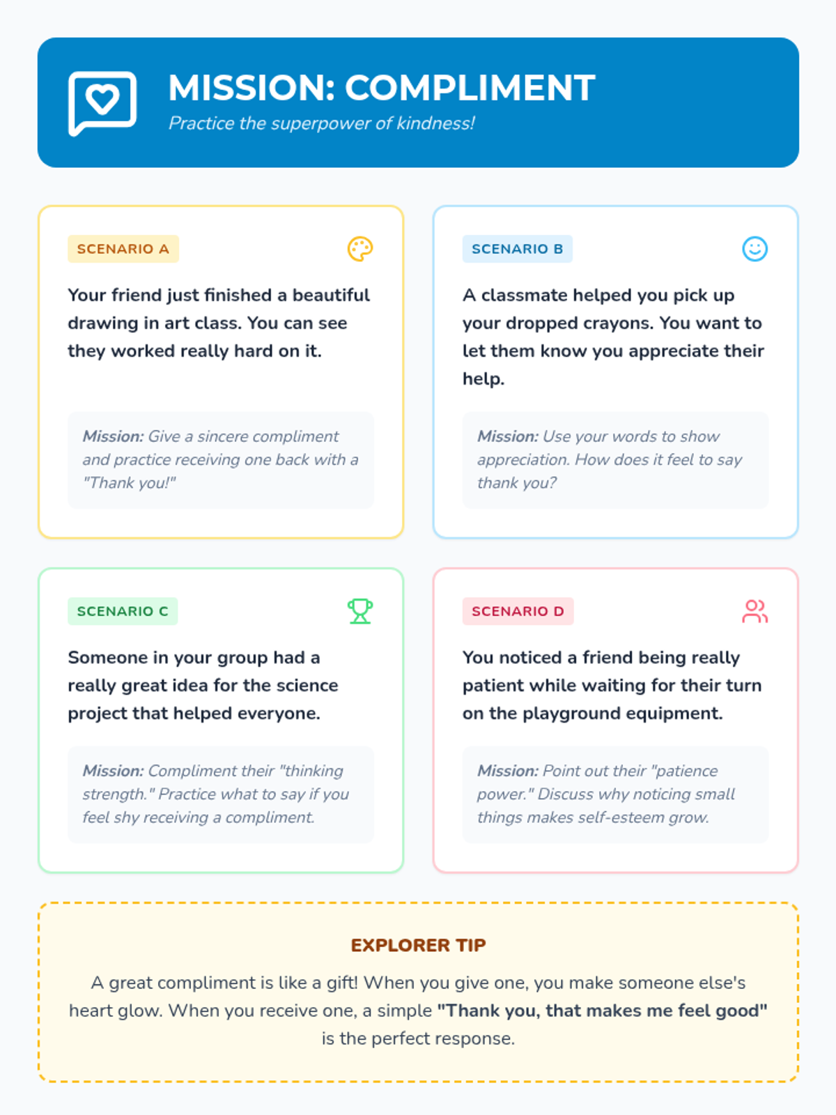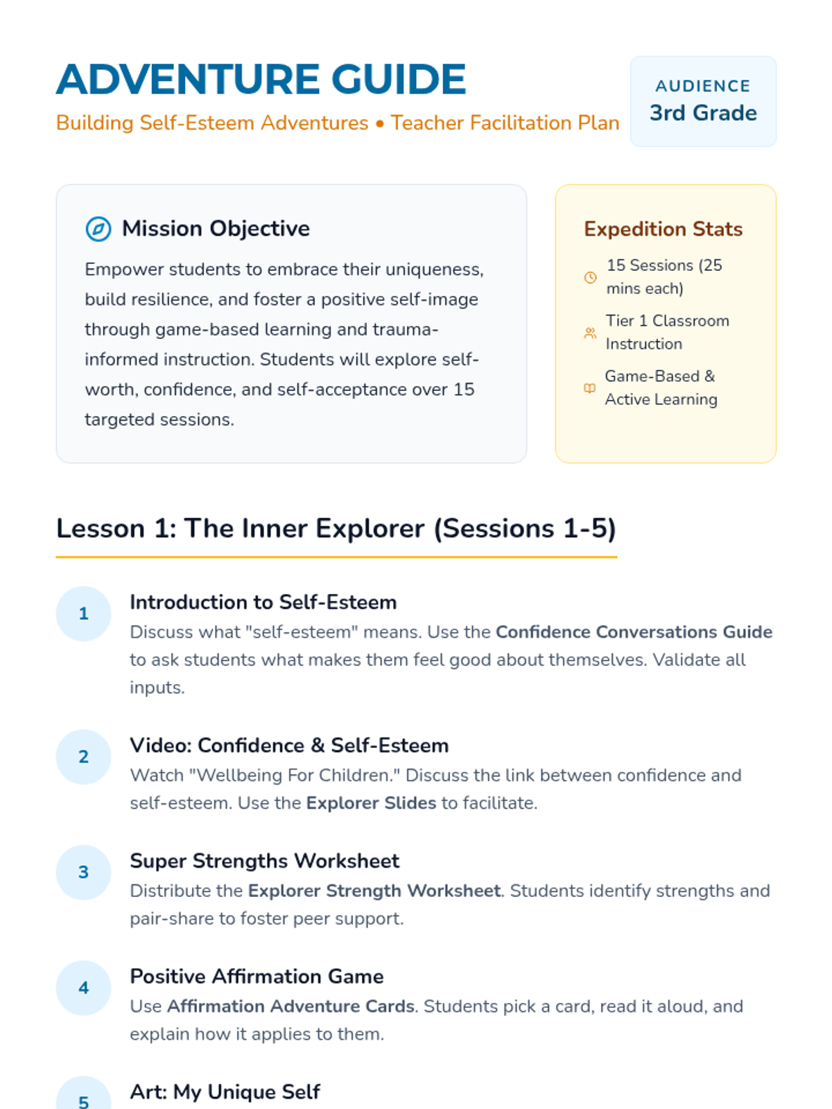 A 15-session social-emotional learning sequence for 3rd graders focused on building self-esteem, identifying strengths, and fostering self-acceptance through an adventure-themed curriculum.