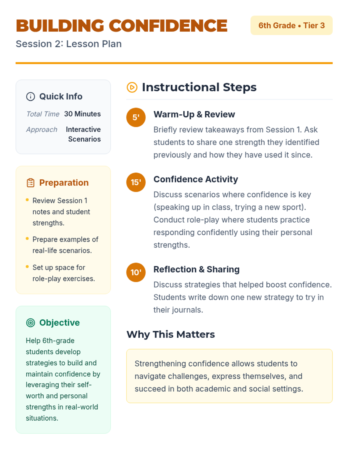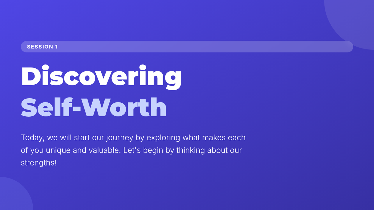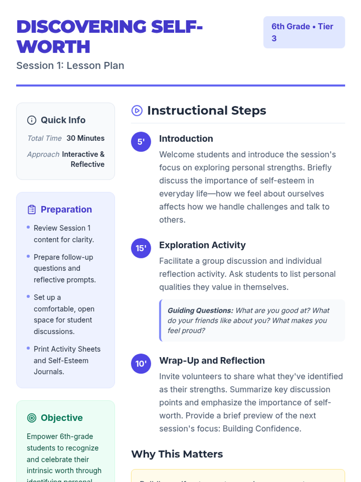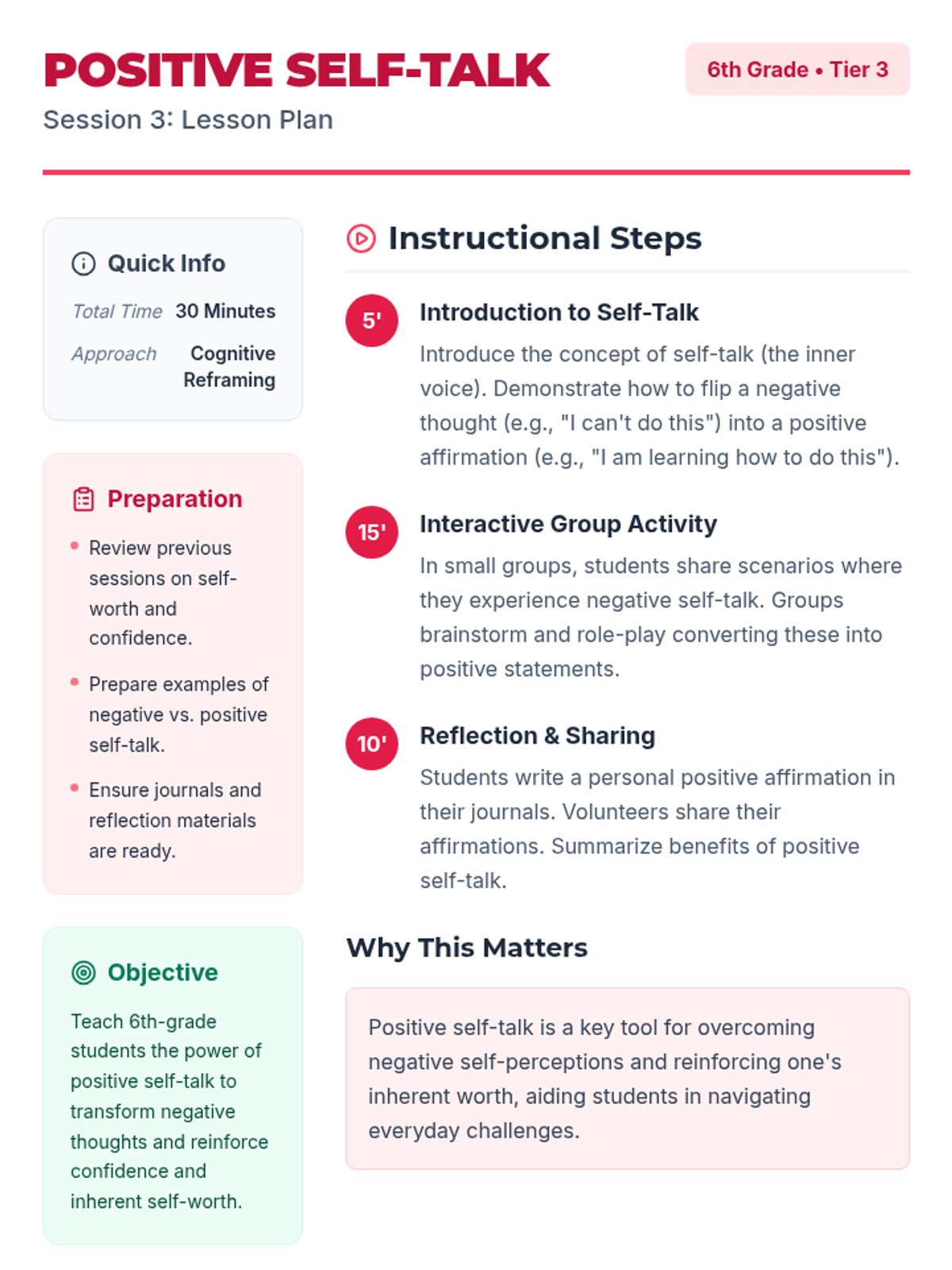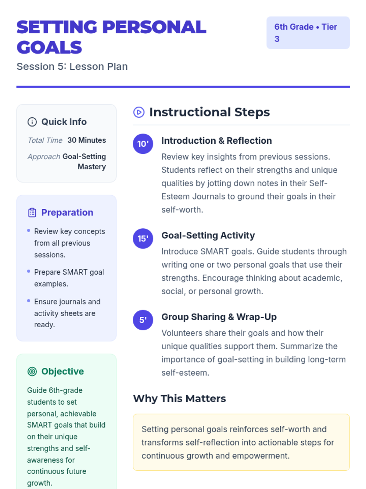 A 5-session Tier 3 intervention for 6th-grade students focused on building self-esteem, recognizing self-worth, and developing resilience through reflective activities and goal-setting.