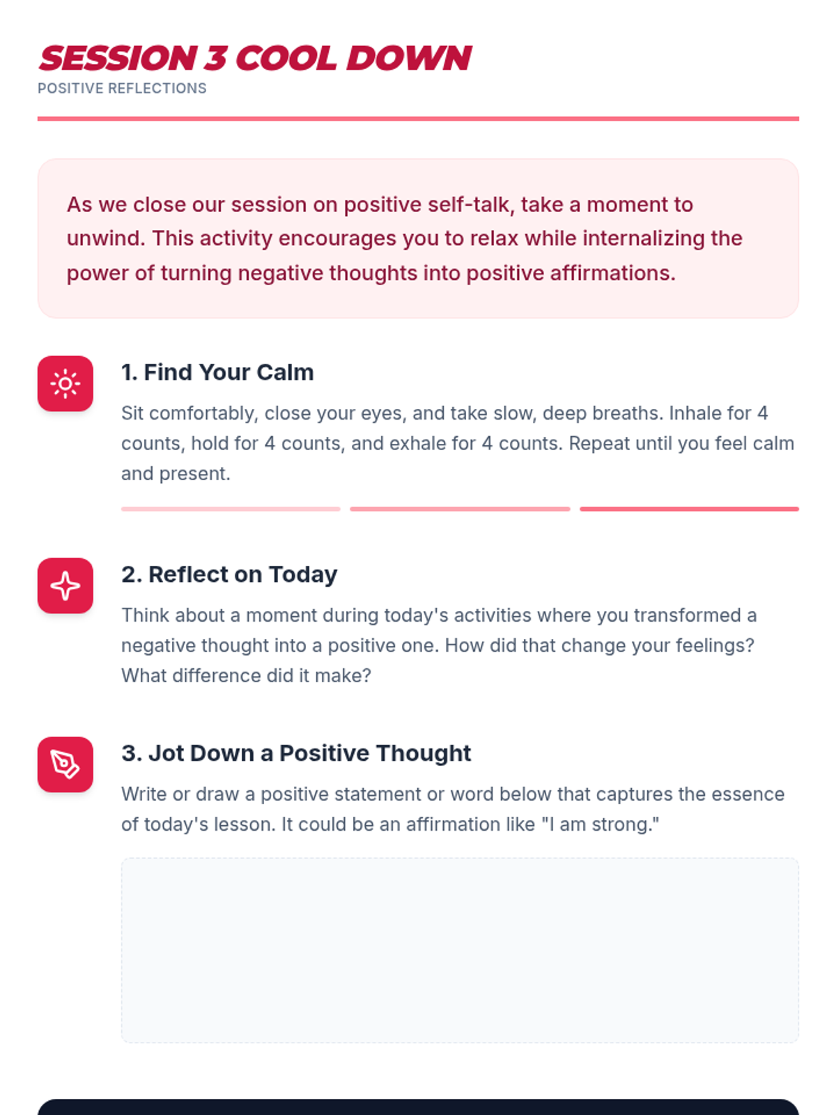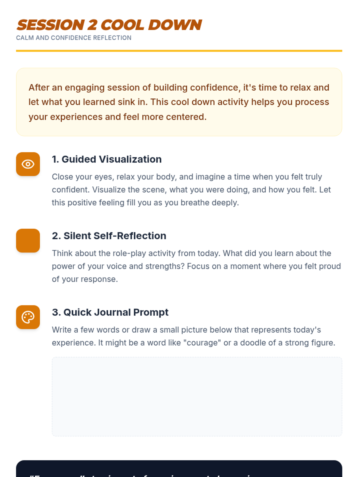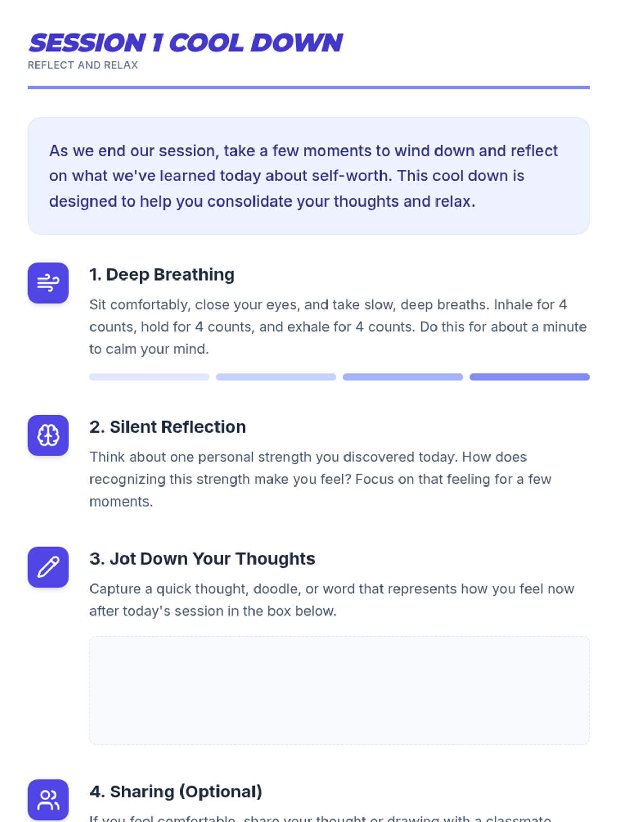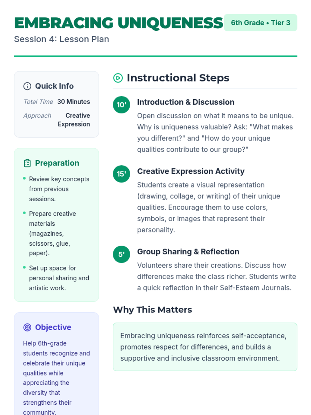 A 5-session Tier 3 intervention for 6th-grade students focused on building self-esteem, recognizing self-worth, and developing resilience through reflective activities and goal-setting.