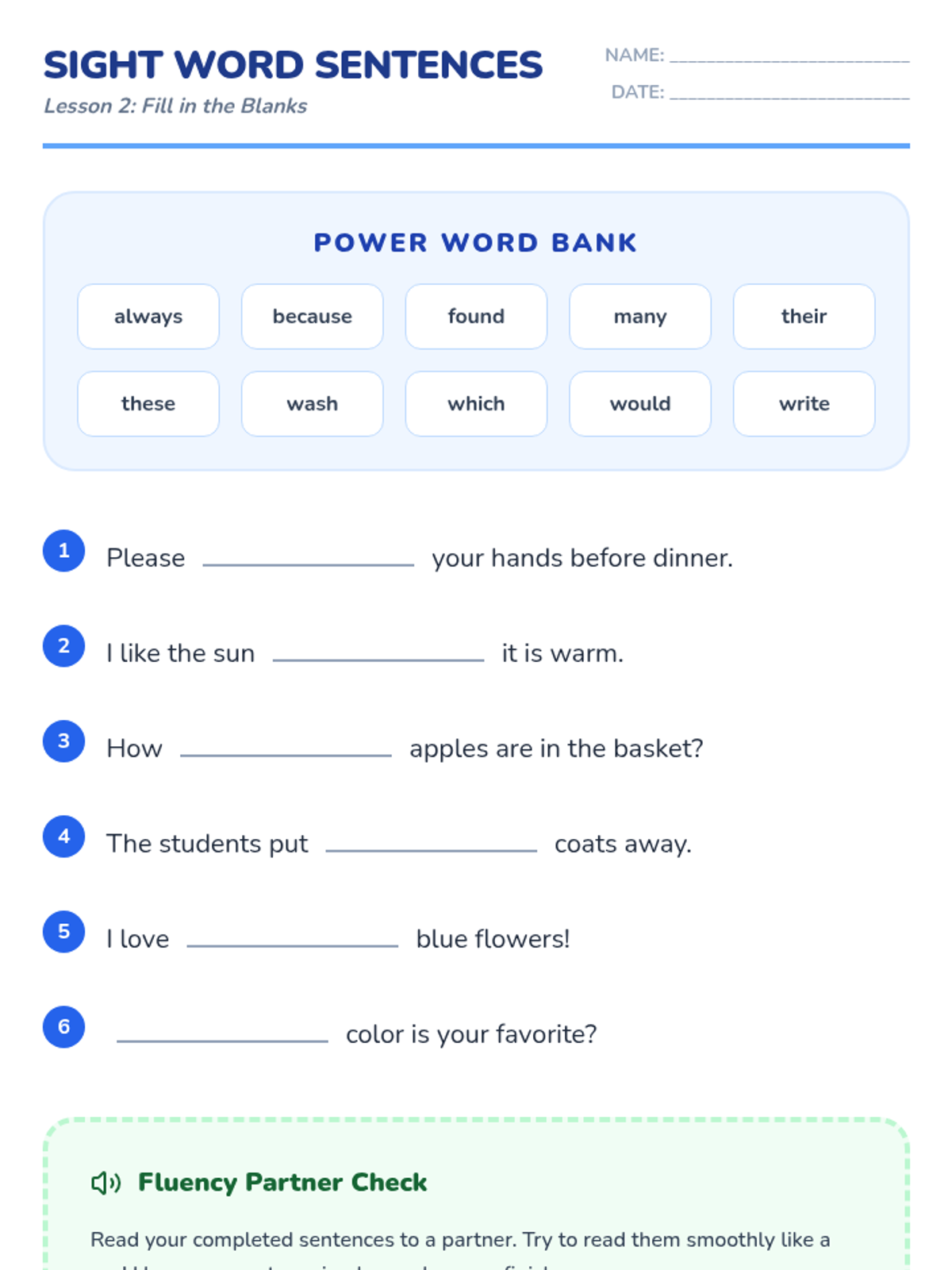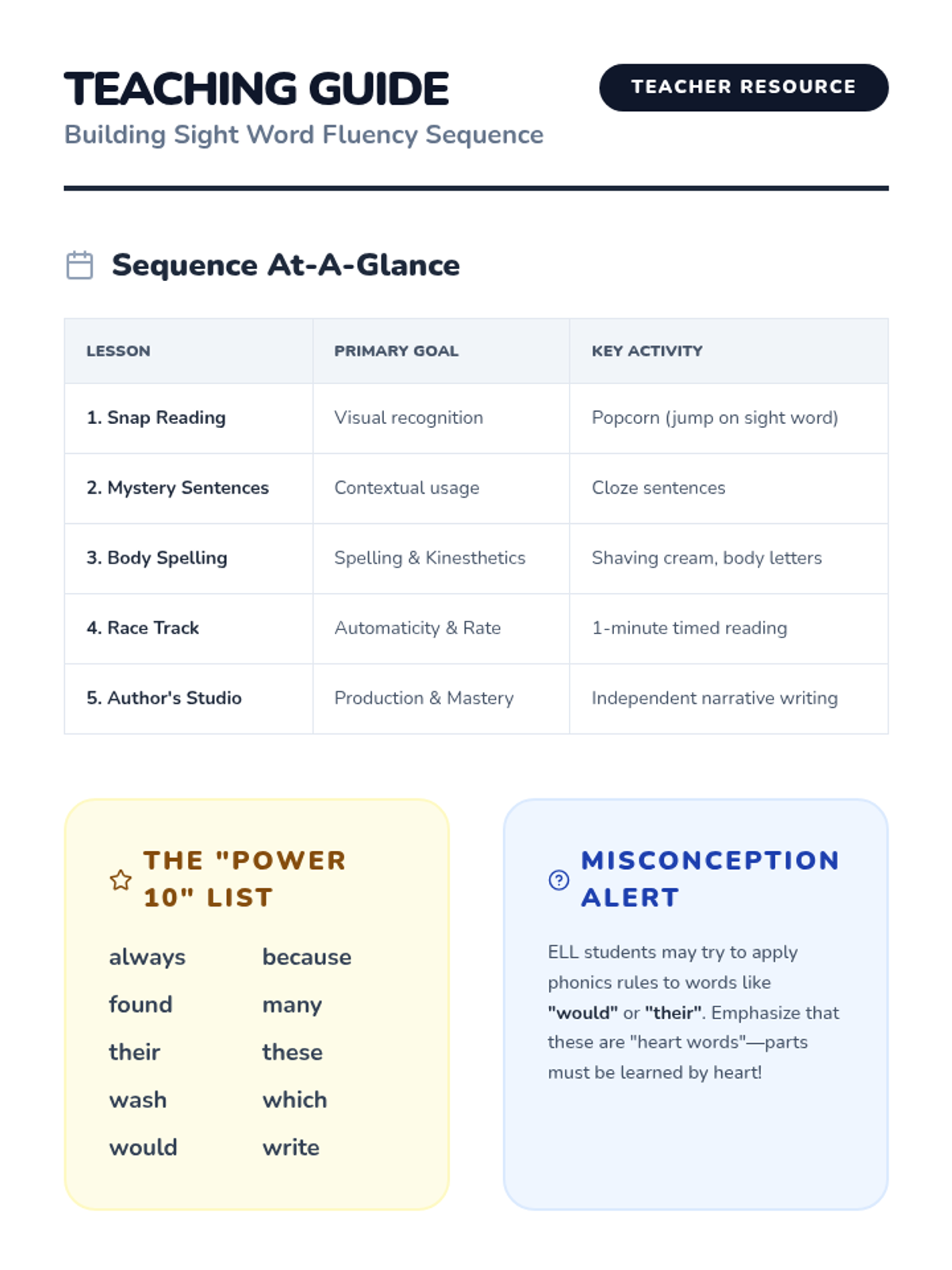 A 5-lesson sequence for 2nd Grade ELL students to master high-frequency sight words through games, multisensory activities, and creative writing. Focuses on 'always, because, found, many, their, these, wash, which, would, write'.