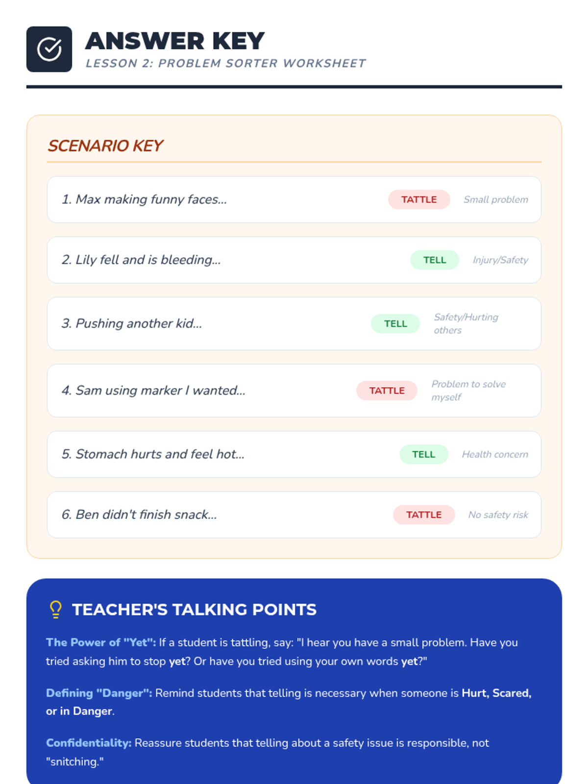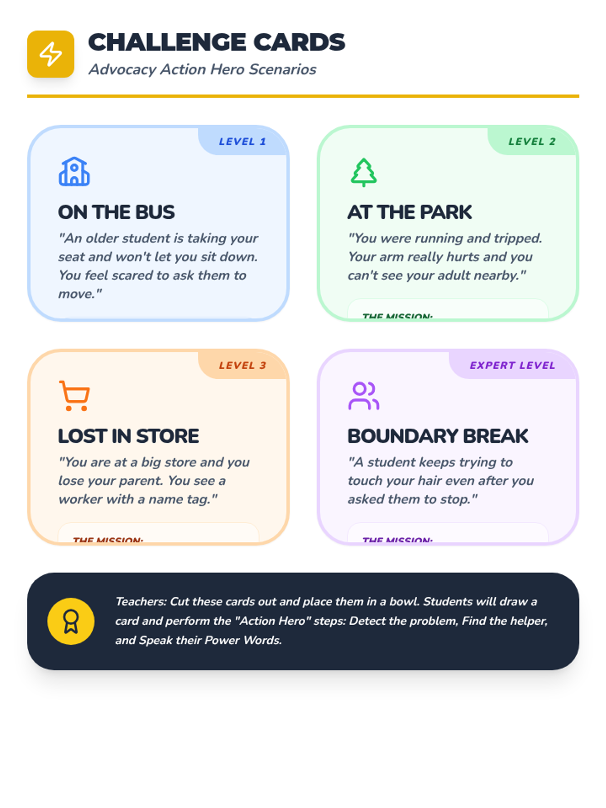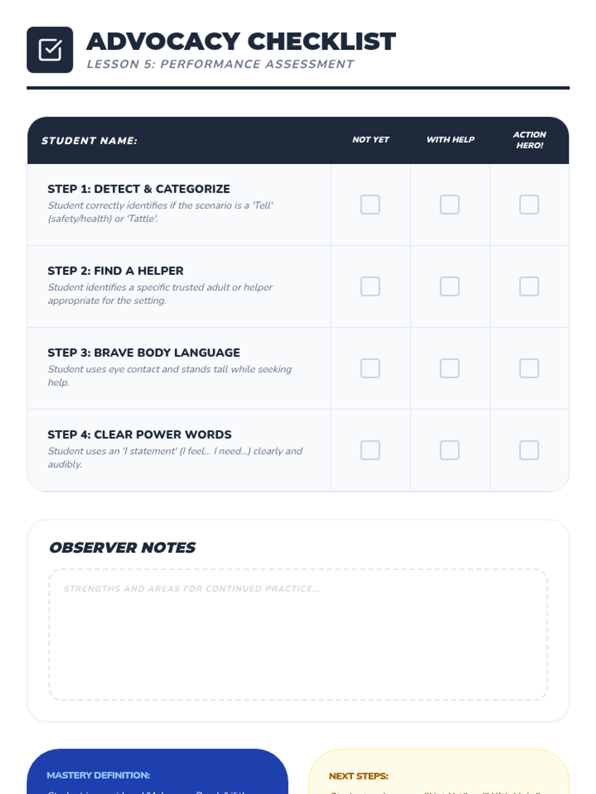 A 5-lesson sequence for 2nd graders focused on identifying support systems, distinguishing between tattling and reporting, practicing 'I' statements, setting personal boundaries, and applying self-advocacy skills in real-world scenarios. Students will build a comprehensive toolkit for seeking help and communicating their needs confidently.