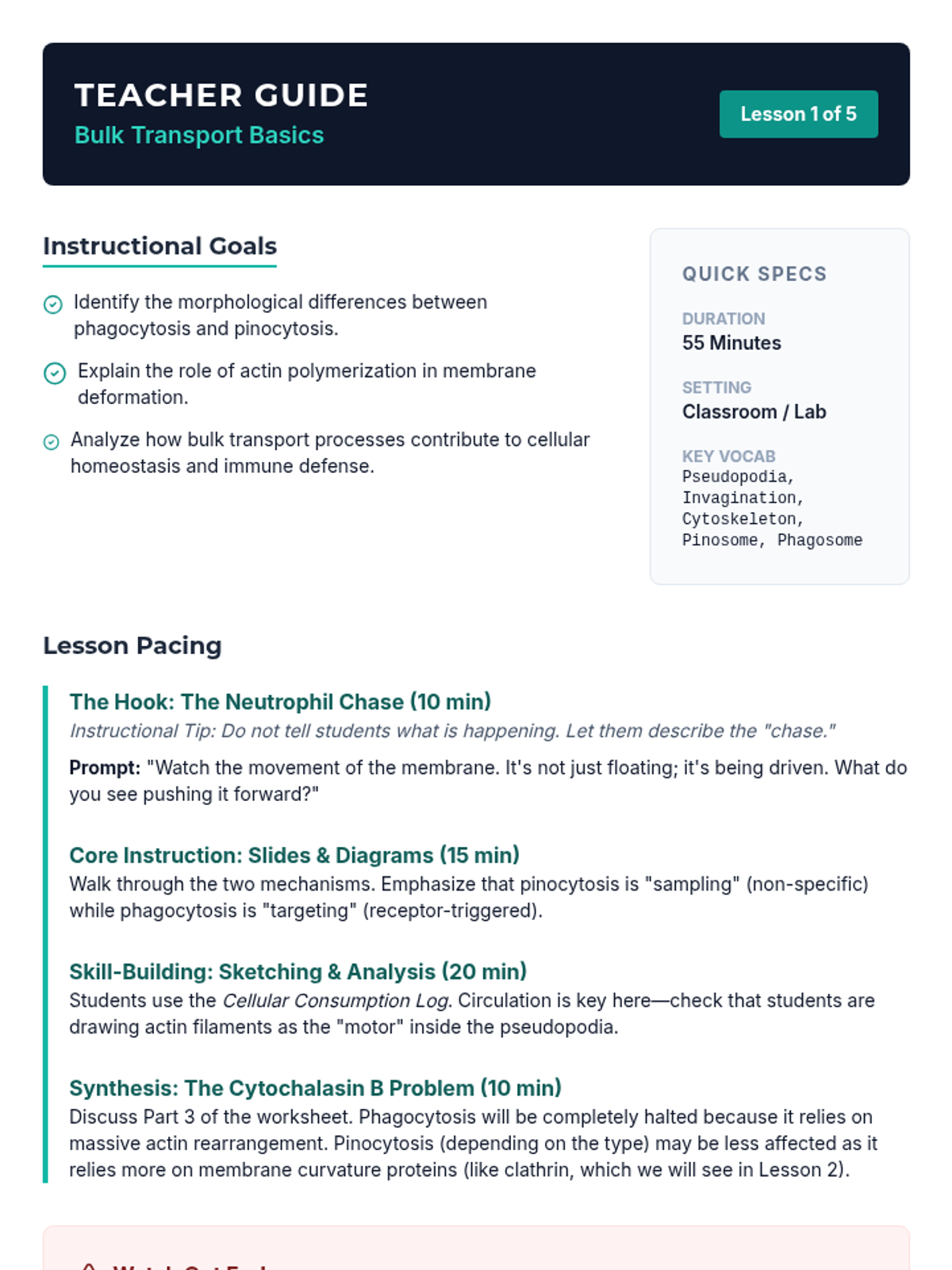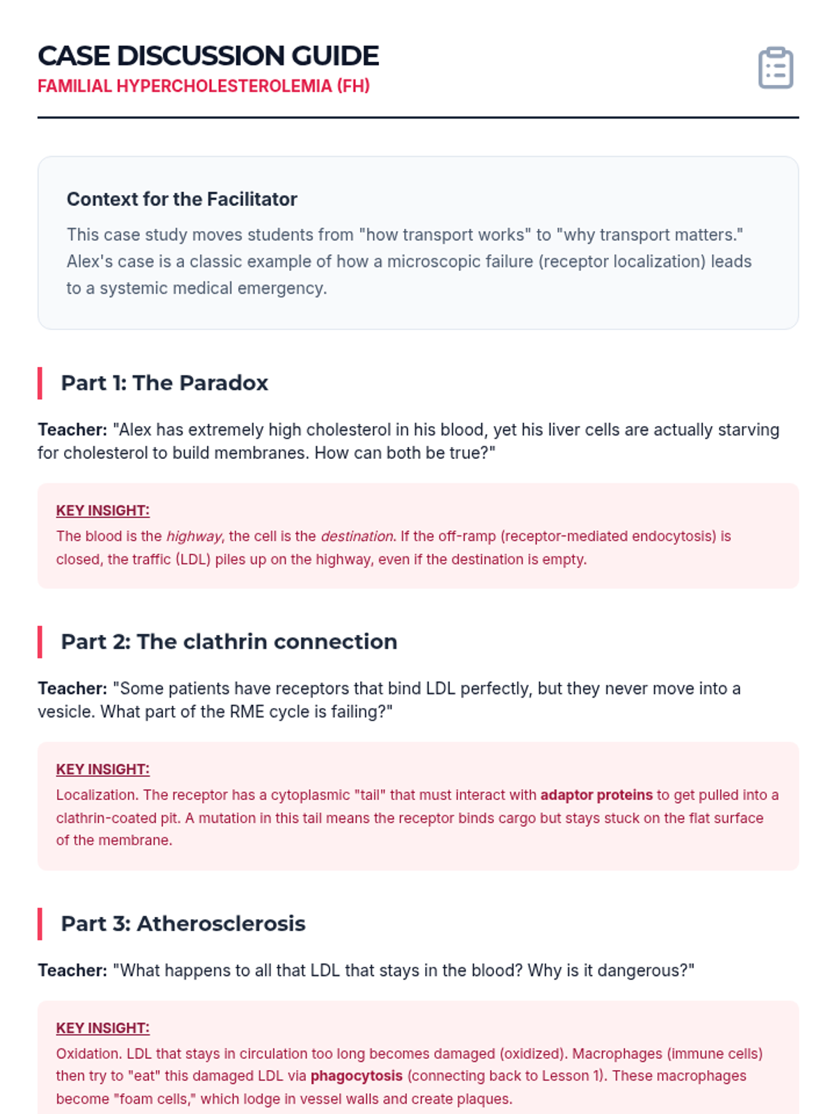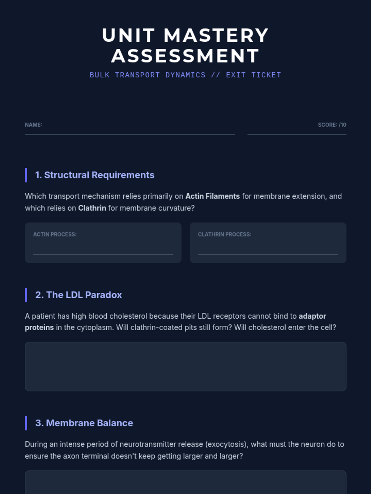 A comprehensive 12th-grade biology unit exploring bulk transport mechanisms through the lens of human health and disease. Students investigate endocytosis and exocytosis, applying molecular biology concepts to case studies like familial hypercholesterolemia and synaptic transmission.