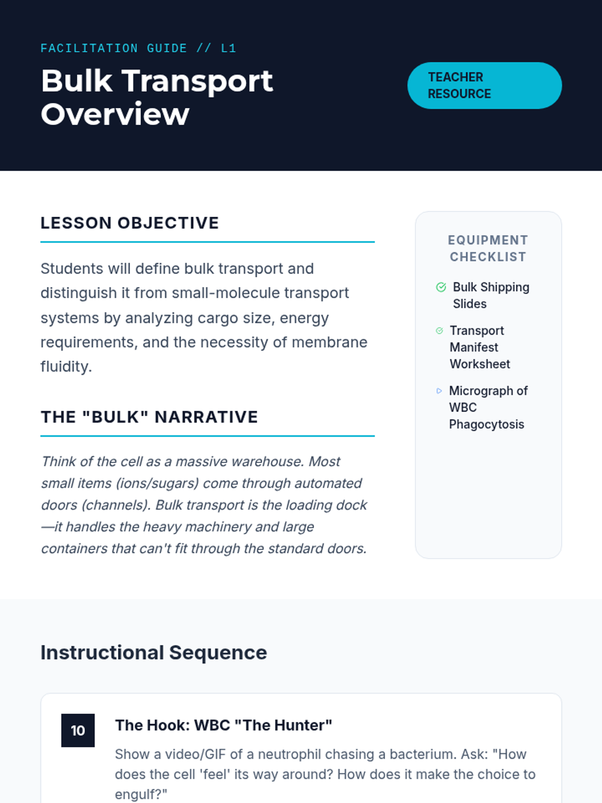 A high school biology sequence exploring the mechanisms of bulk transport—endocytosis and exocytosis. Students analyze membrane dynamics, vesicle formation, and specific pathways like receptor-mediated endocytosis through a 'Cellular Logistics' lens, culminating in a creative visualization project.