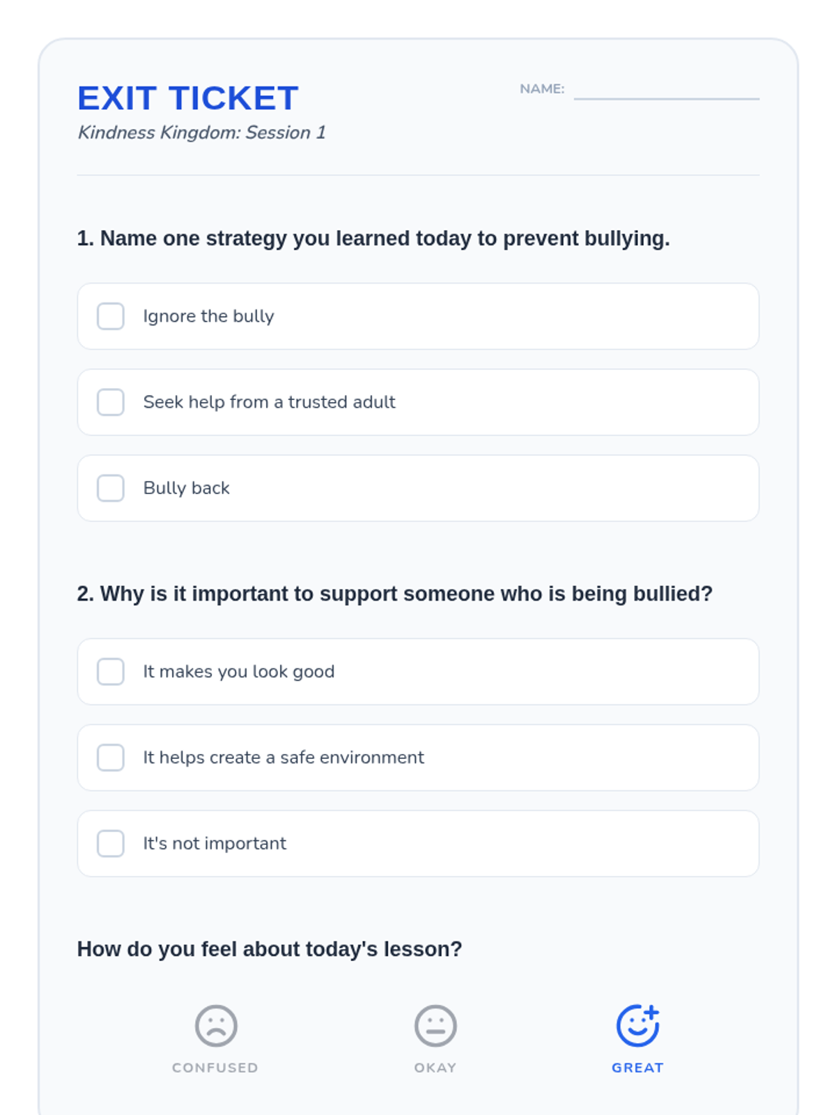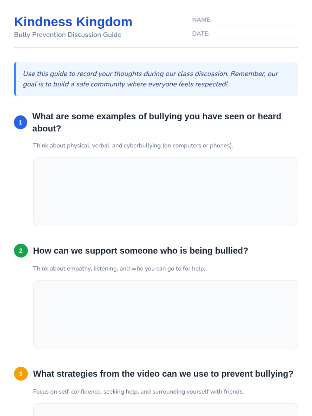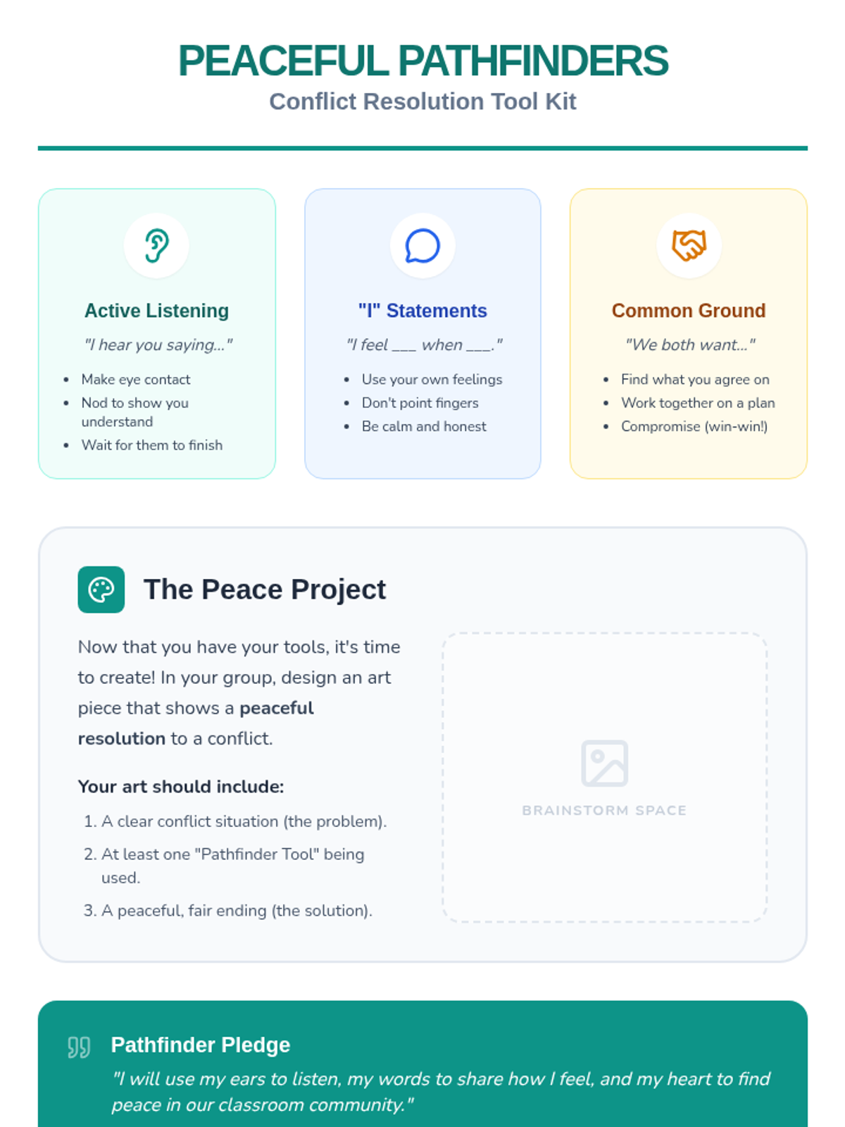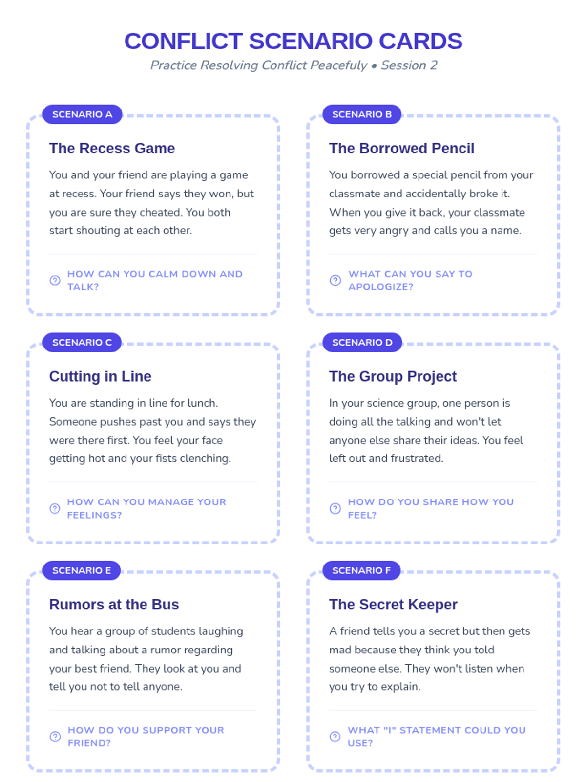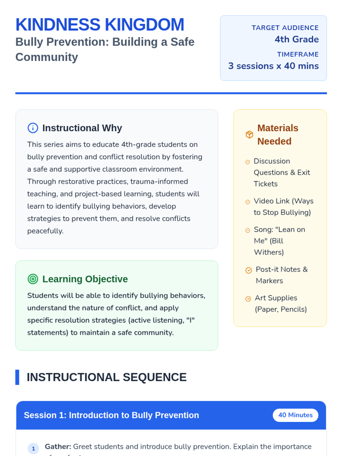 A 3-session series for 4th graders focused on bully prevention, understanding conflict, and developing peaceful resolution strategies through restorative and trauma-informed practices.