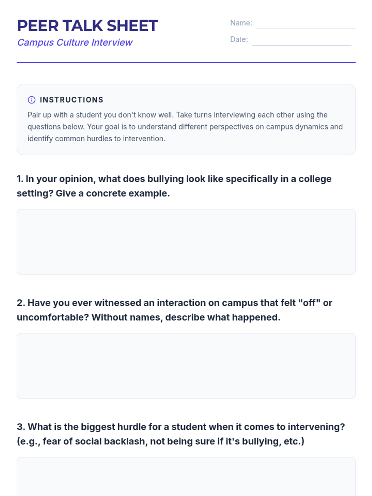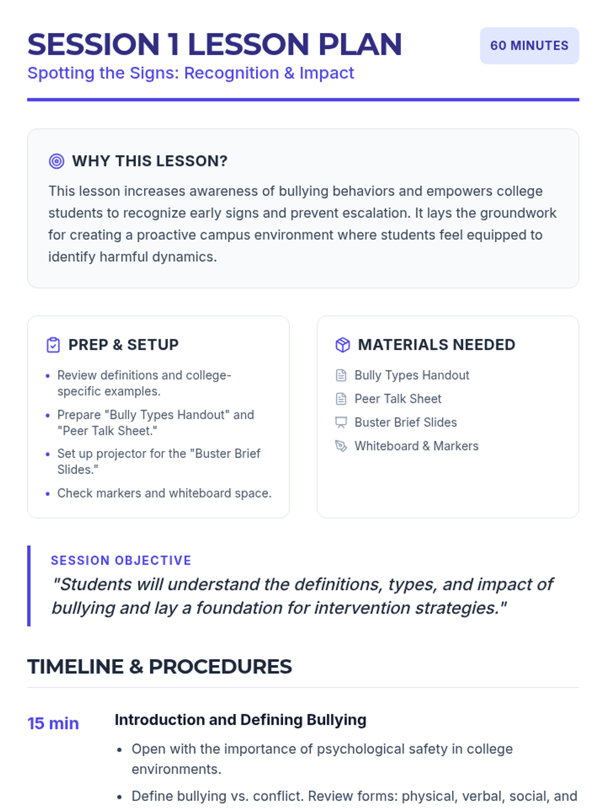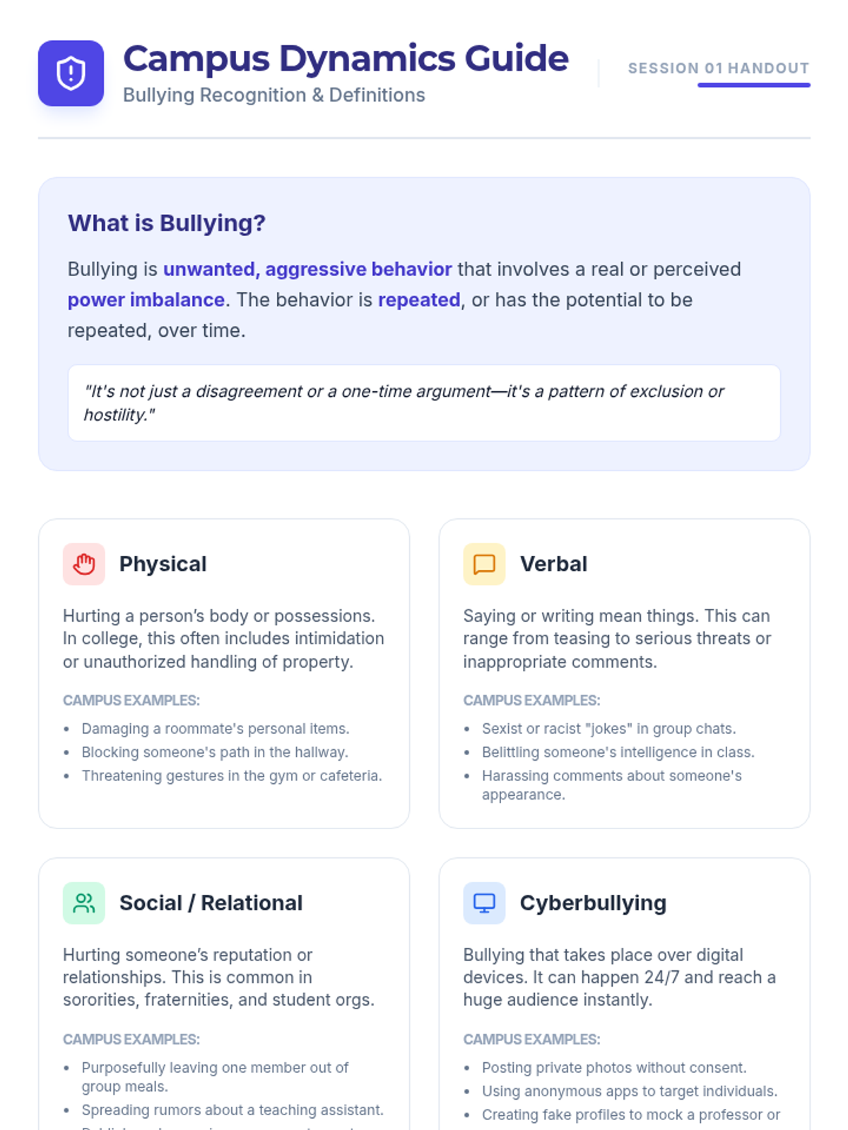 A two-session sequence designed for college students to recognize bullying behaviors and practice effective intervention strategies to foster a safer campus culture.