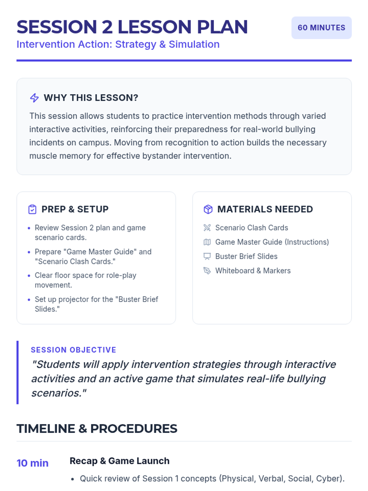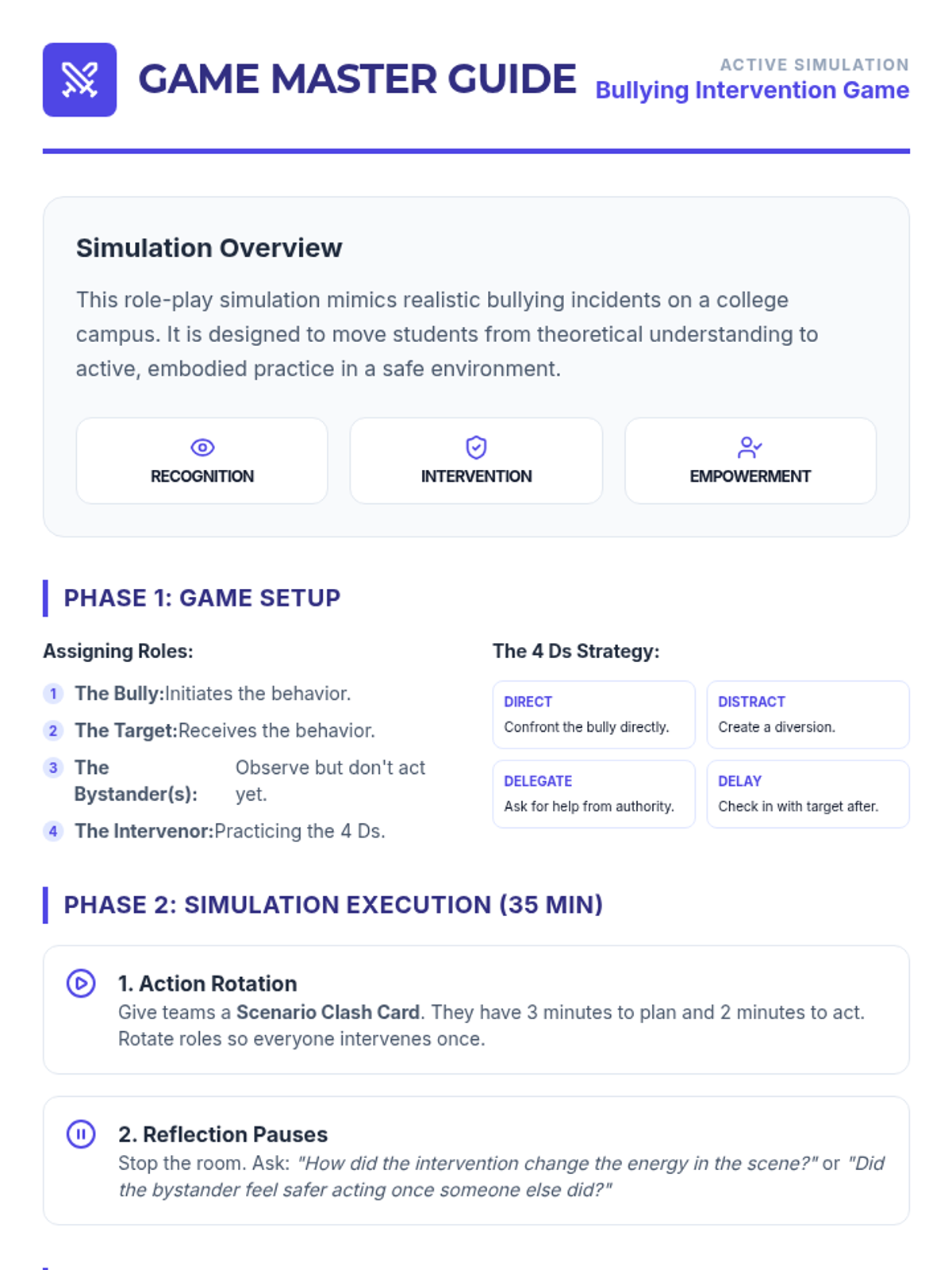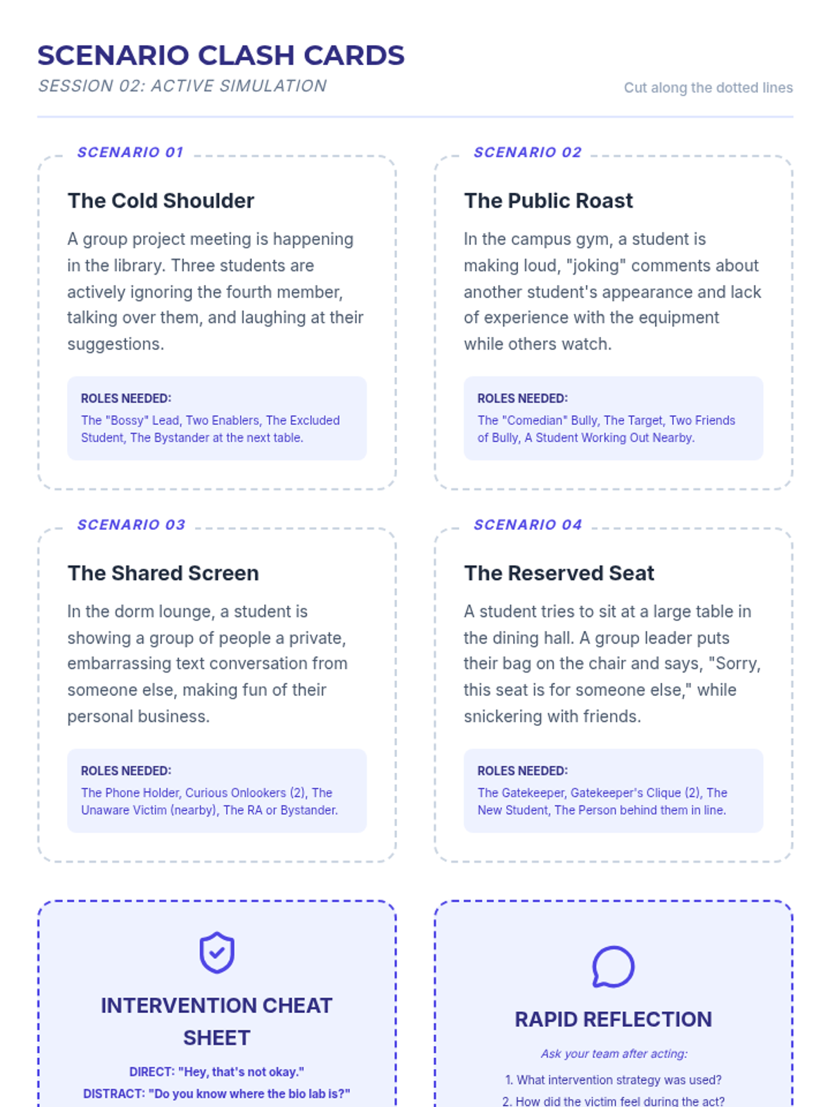 A two-session sequence designed for college students to recognize bullying behaviors and practice effective intervention strategies to foster a safer campus culture.
