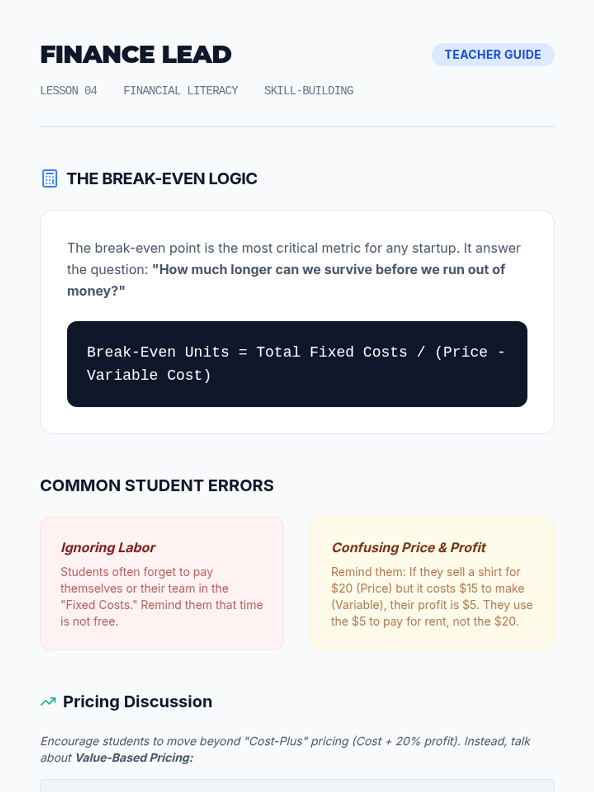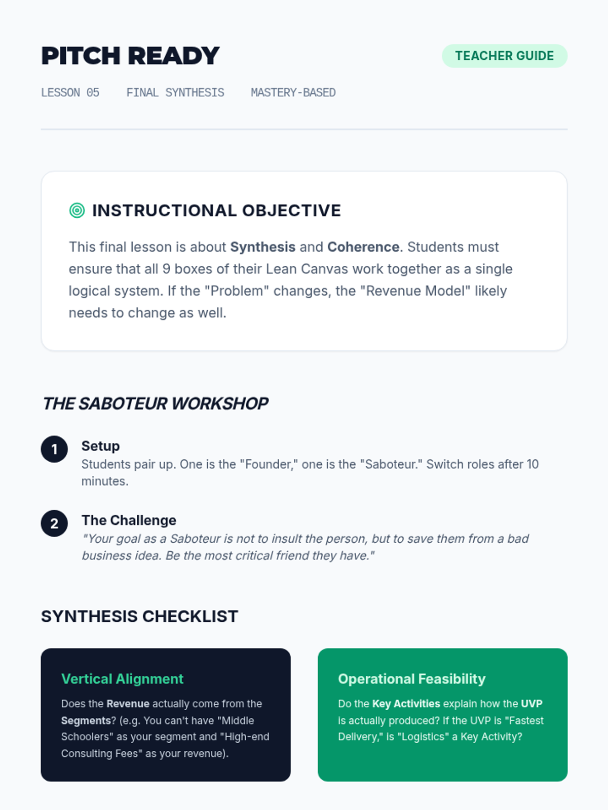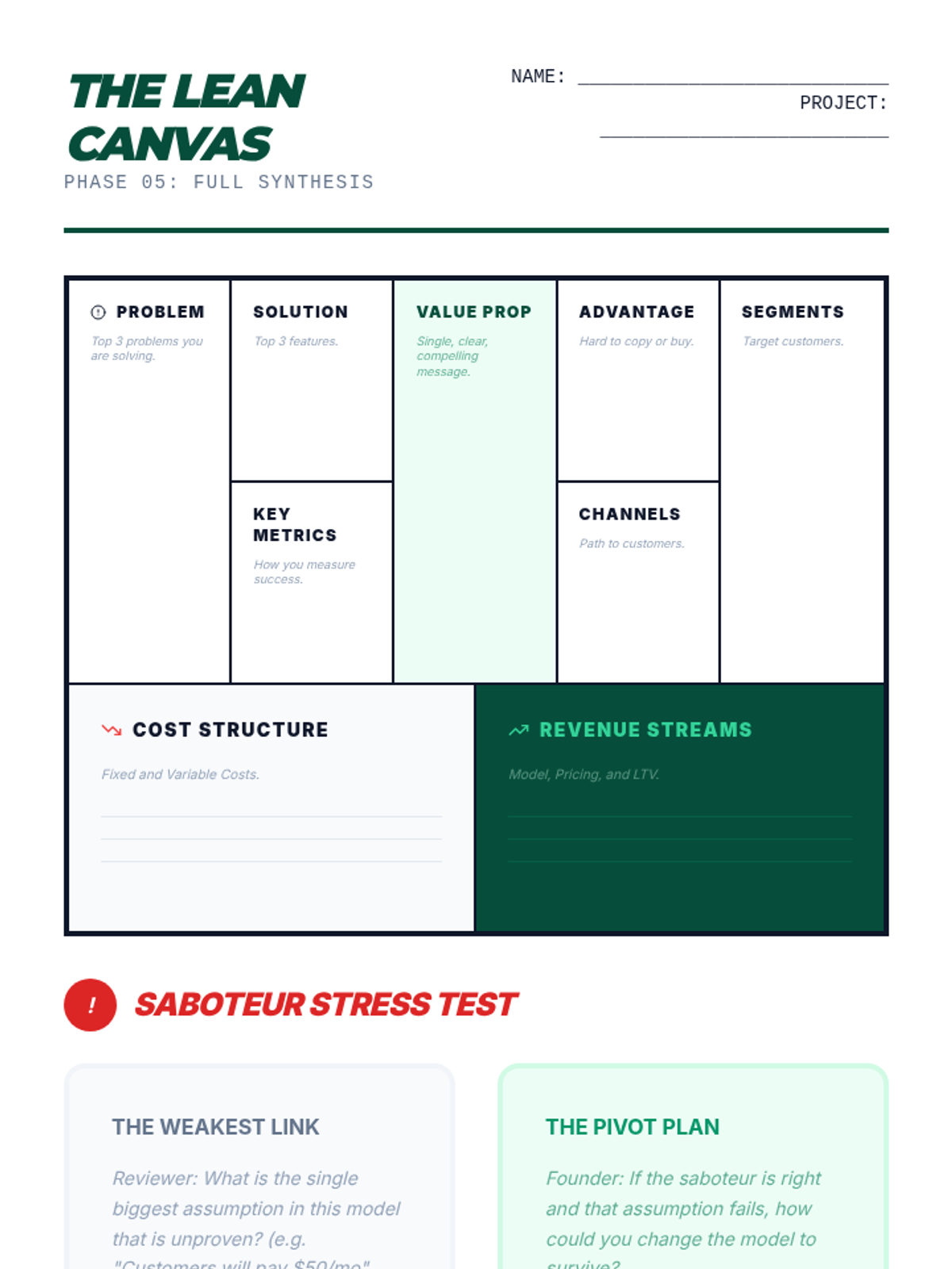 A comprehensive 12th-grade sequence focused on building business models using the Lean Canvas framework. Students move from value proposition design through front-stage customer acquisition and back-stage operations to financial modeling and final model synthesis.