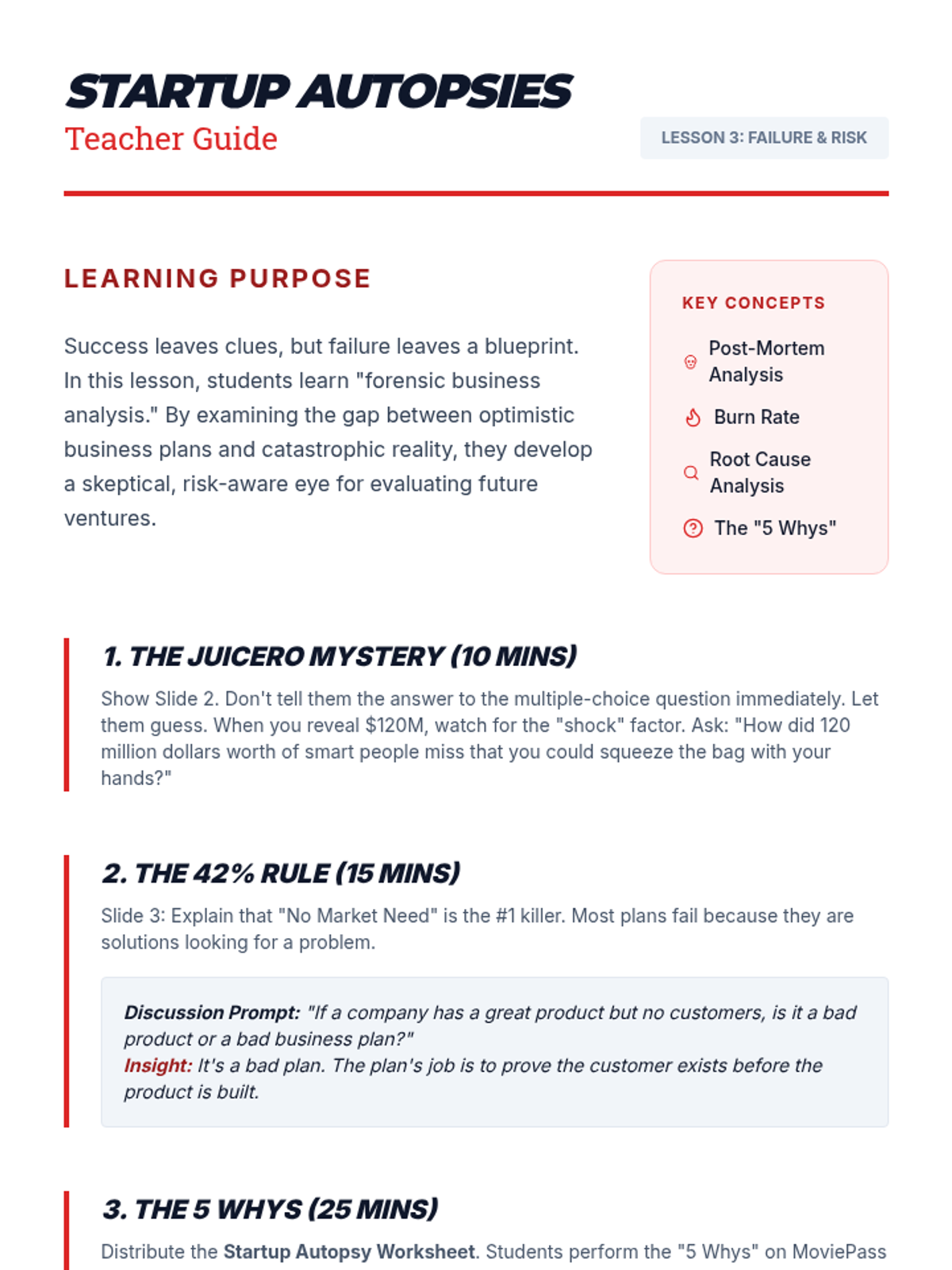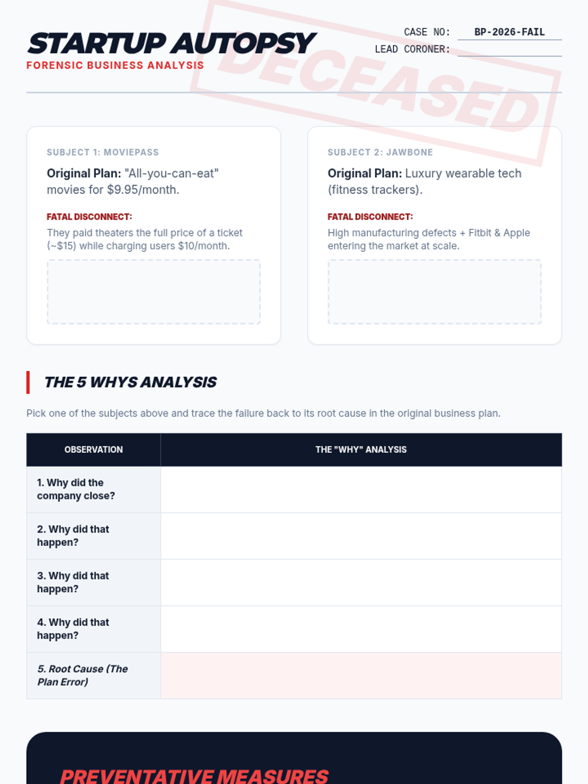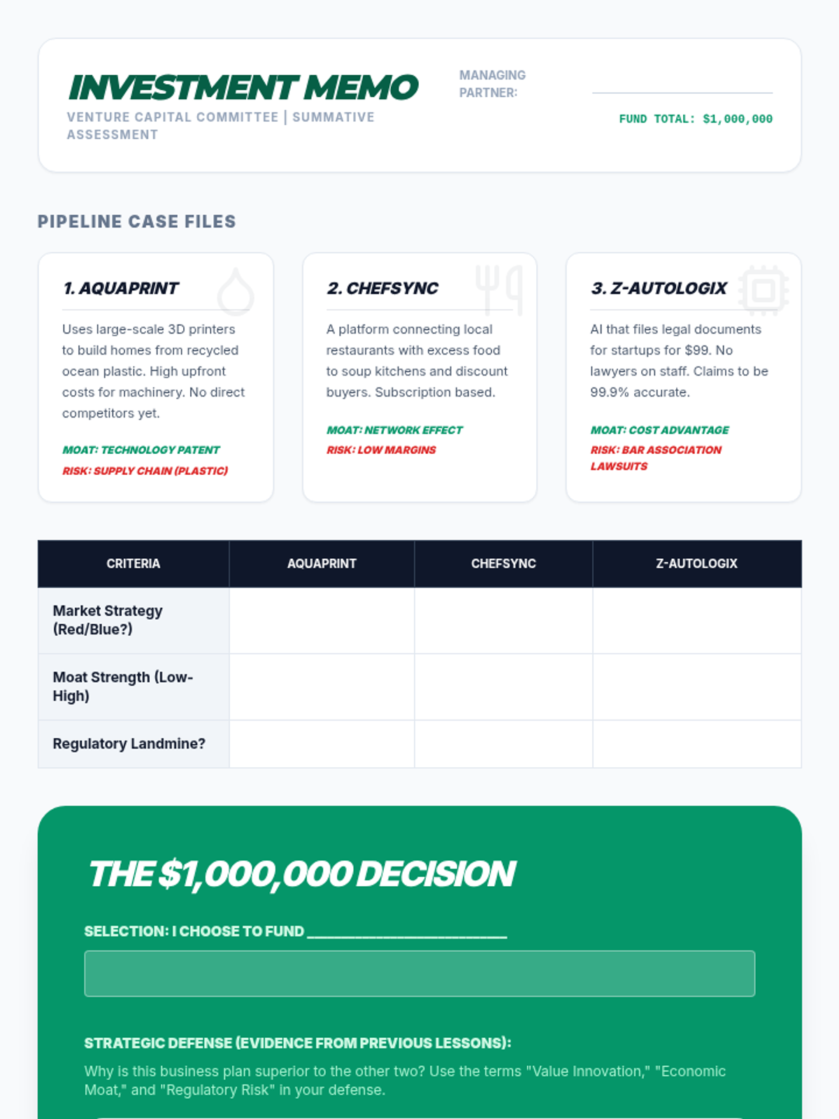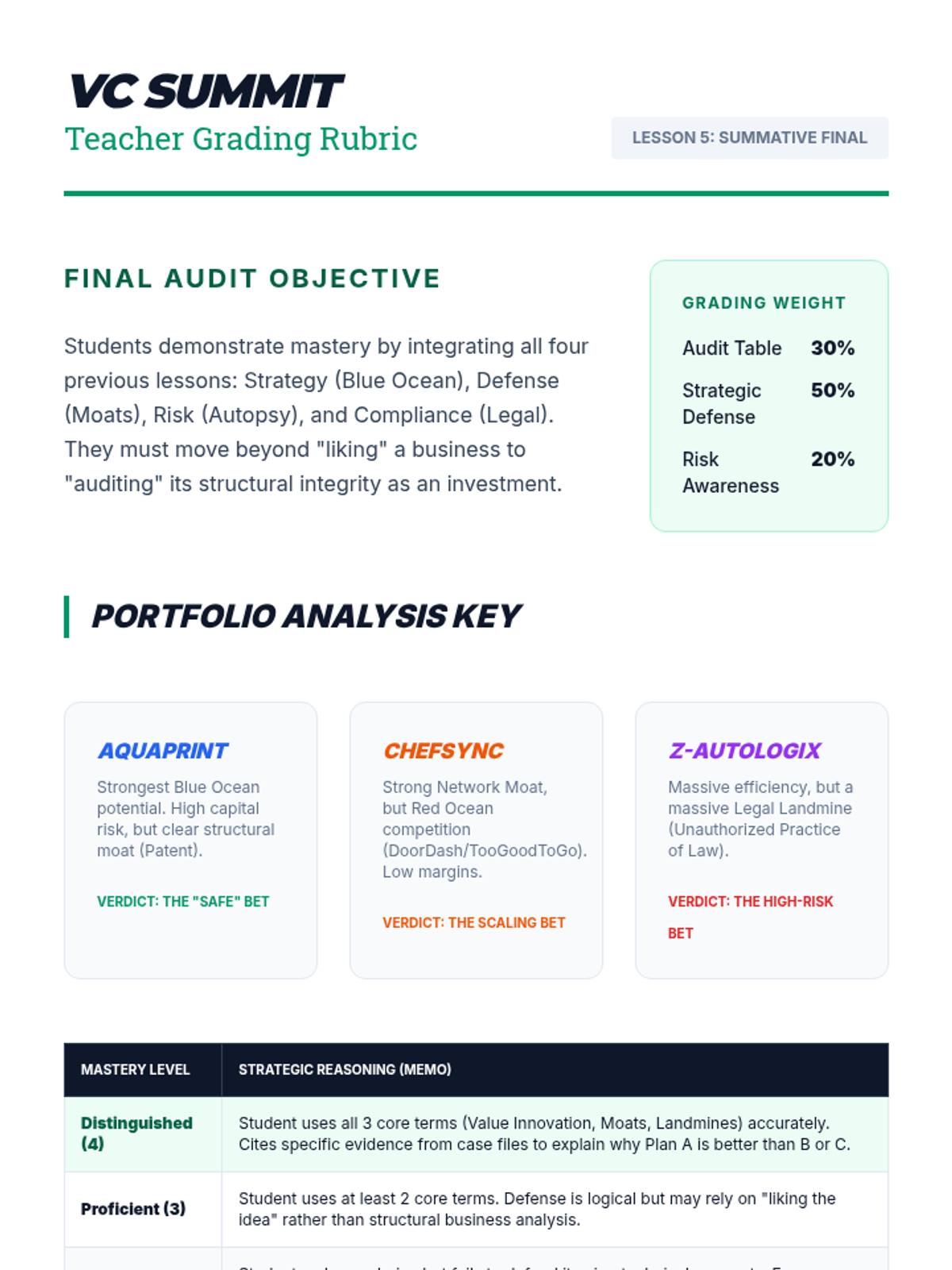 A 12th-grade sequence that uses the Case Study method to analyze business models. Students transition from evaluating successful market-creating strategies to performing 'autopsies' on failed ventures, culminating in a simulation where they act as venture capitalists auditing business plans.