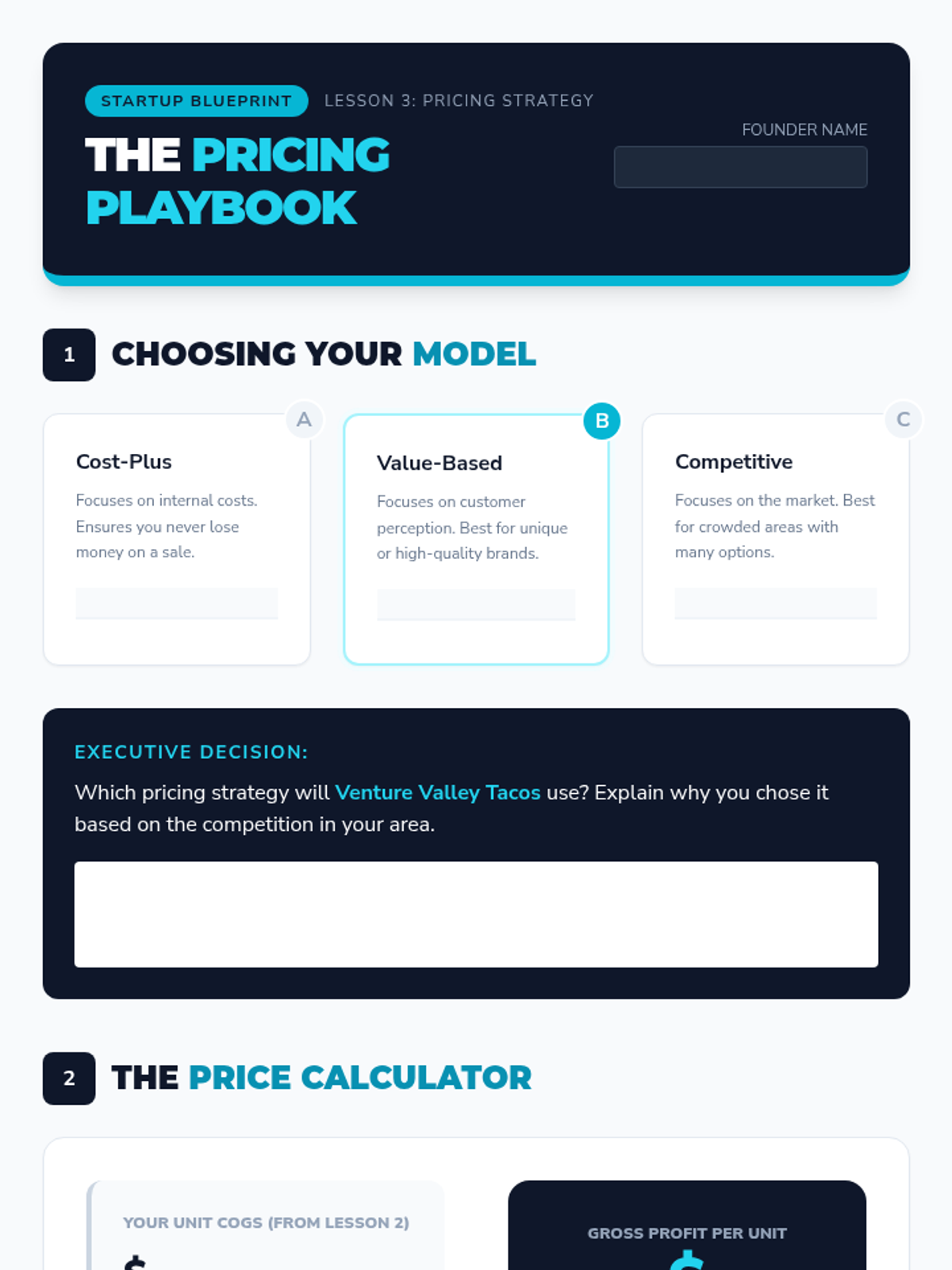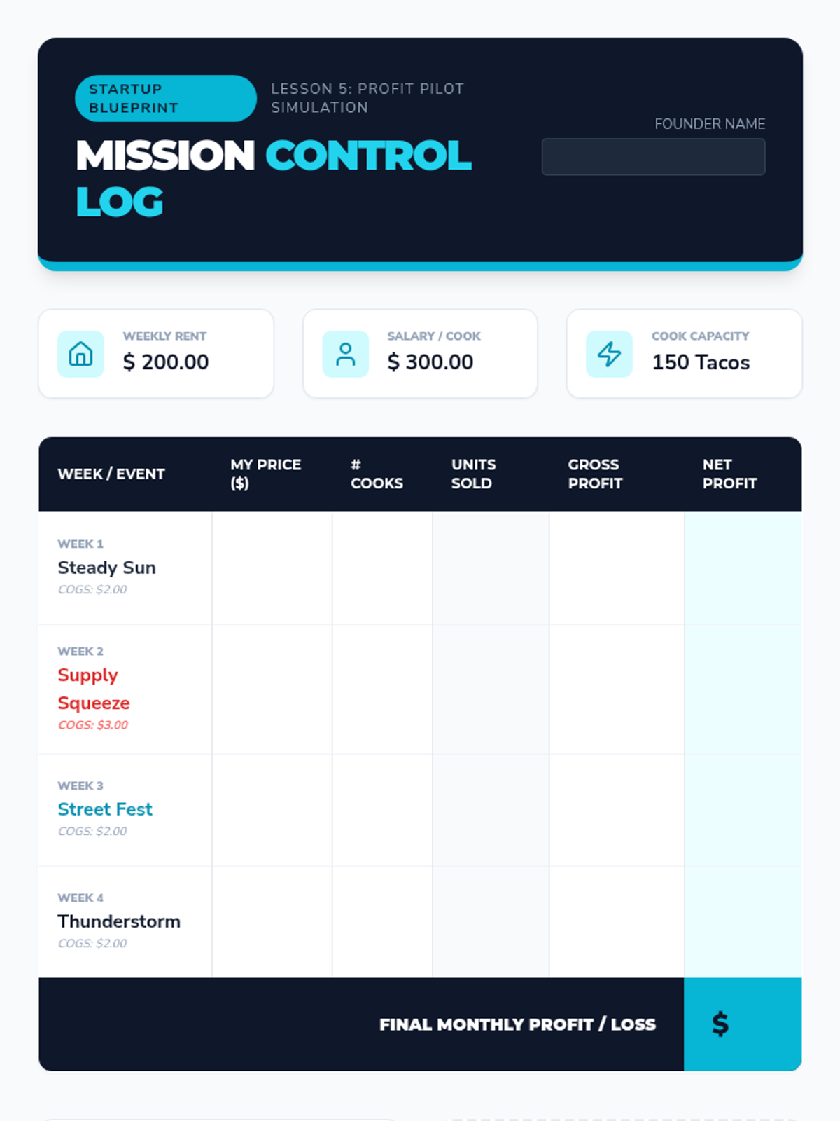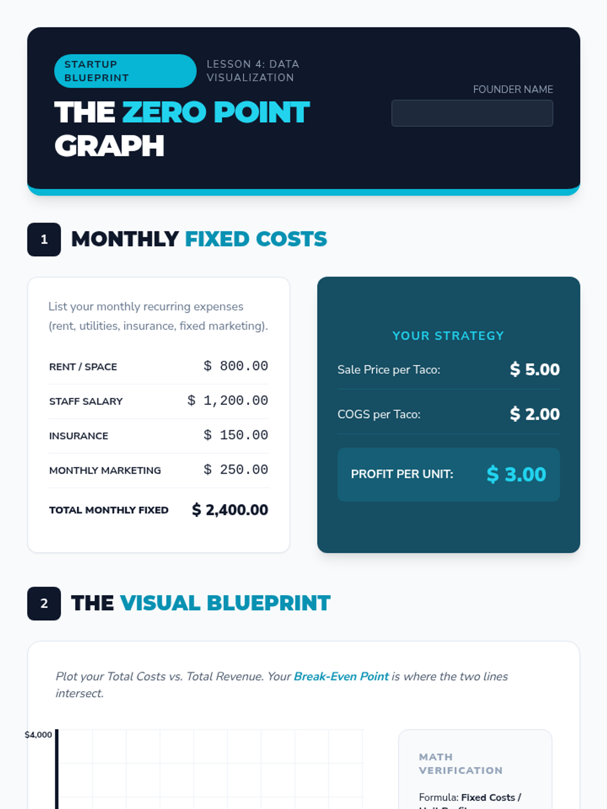 A 7th-grade entrepreneurship sequence focused on the financial math and operational logic behind a business plan. Students progress from estimating startup costs to conducting break-even analysis and managing a simulated month of profitability.