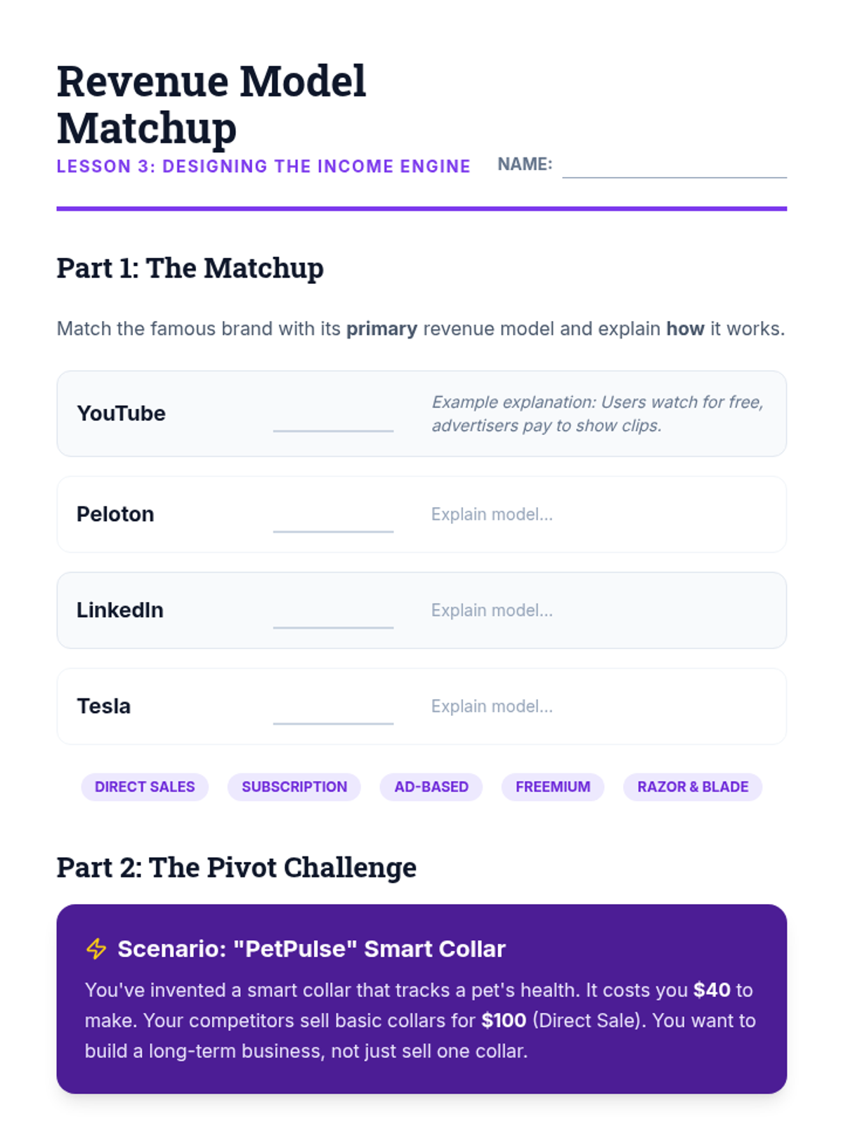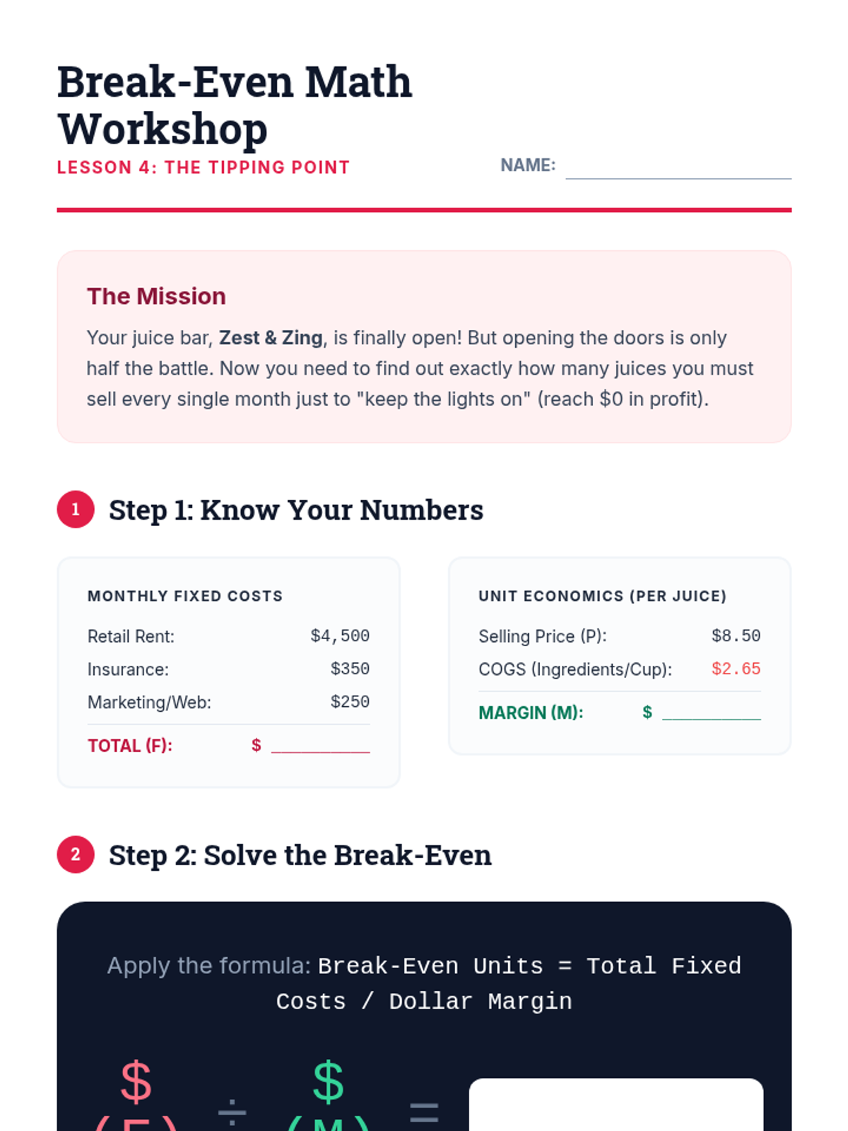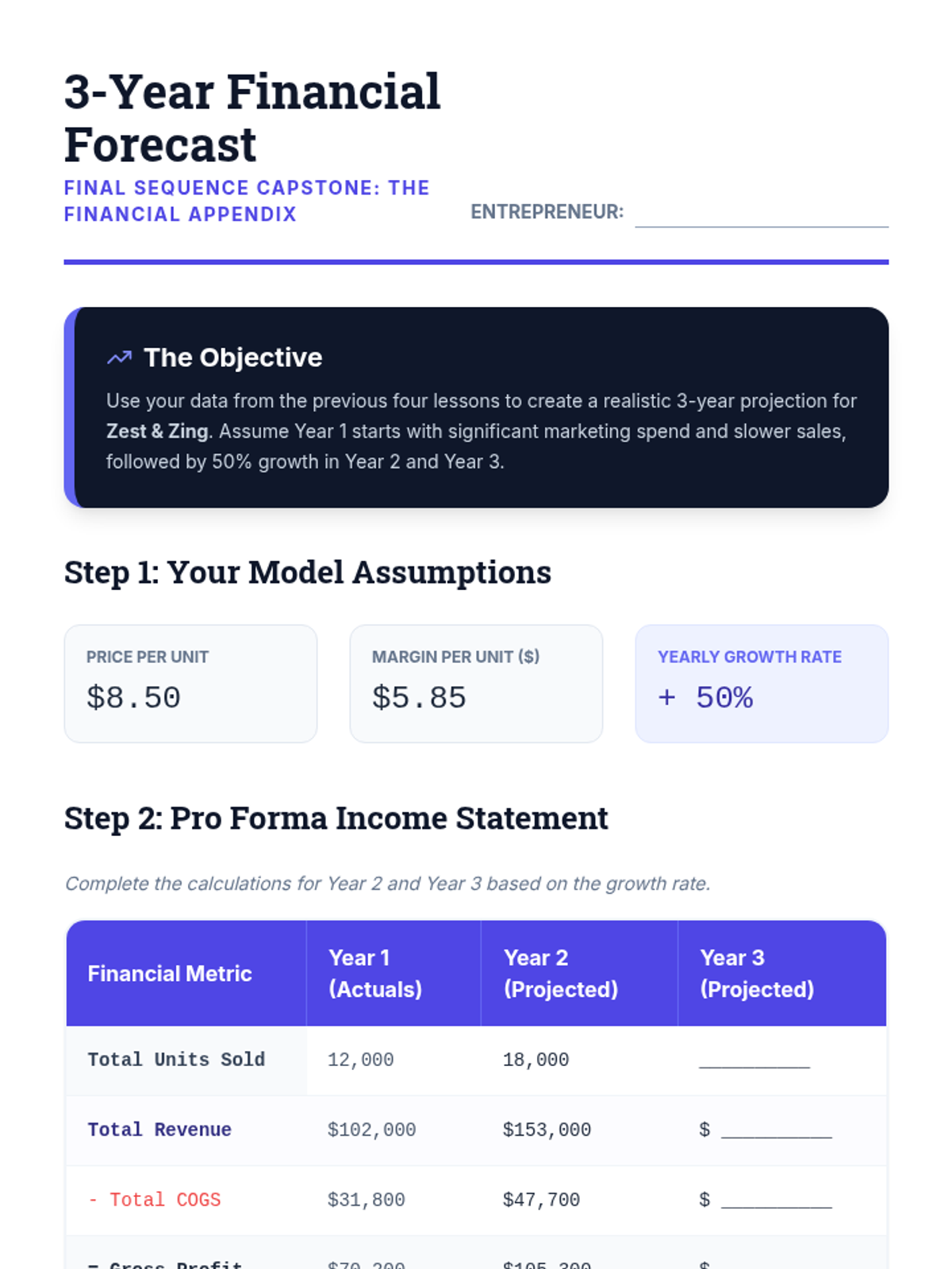 A comprehensive sequence for 10th-grade students focusing on the financial foundations of a business plan, covering startup costs, unit economics, revenue models, break-even analysis, and financial forecasting.