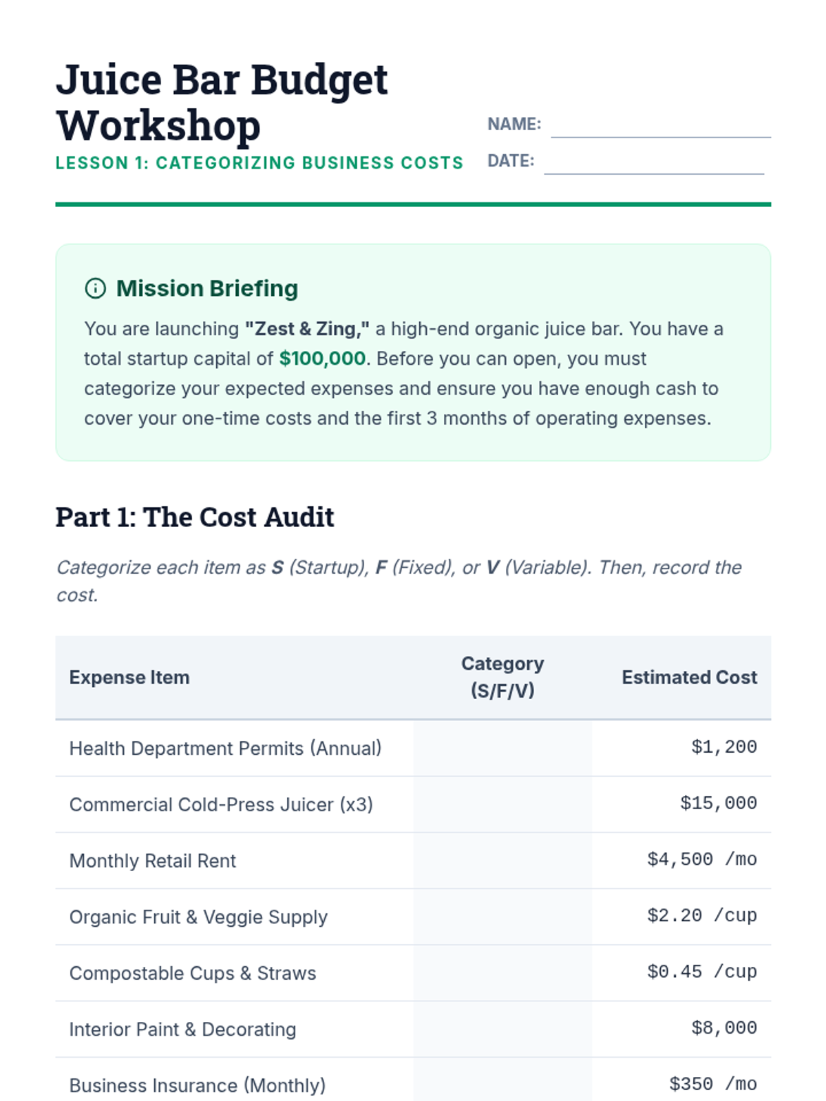 A comprehensive 8-day business math unit focused on personal budgeting, expenditure analysis, and career-based financial planning. Students learn to track spending, build budgets, and analyze variances before applying these skills to a career research project.