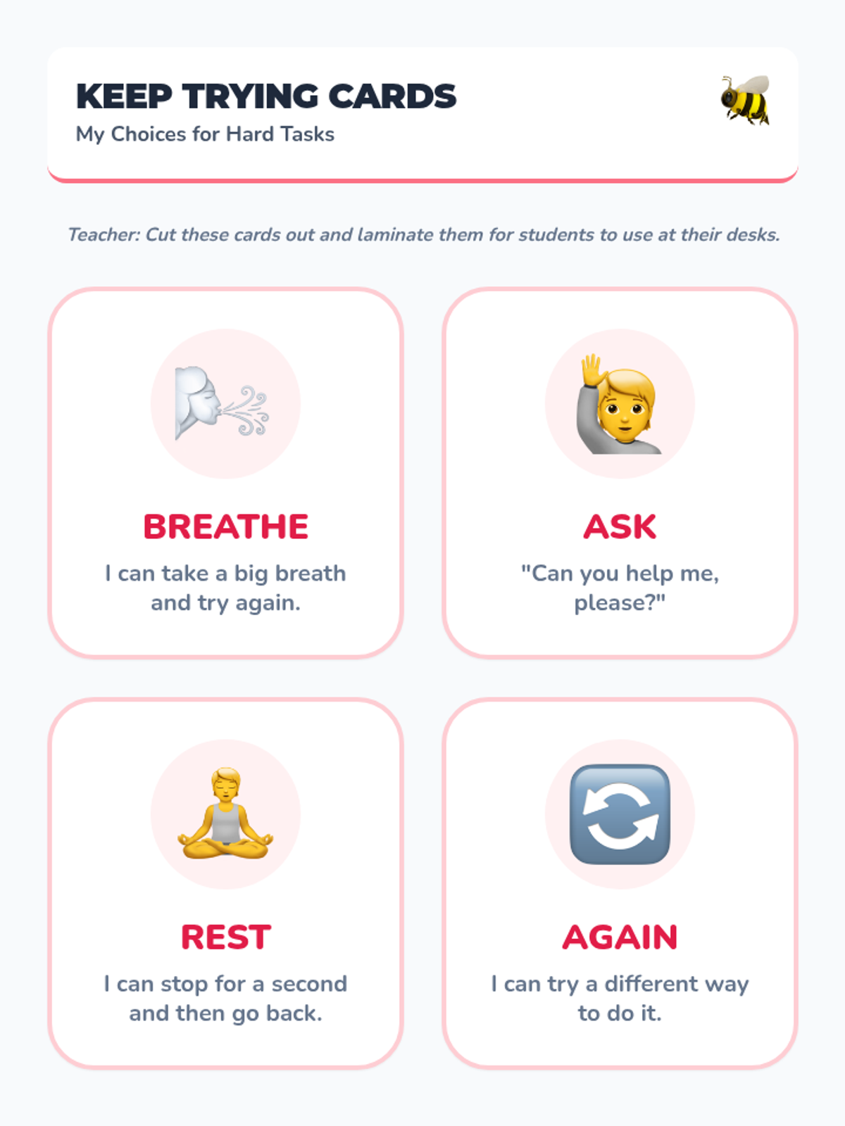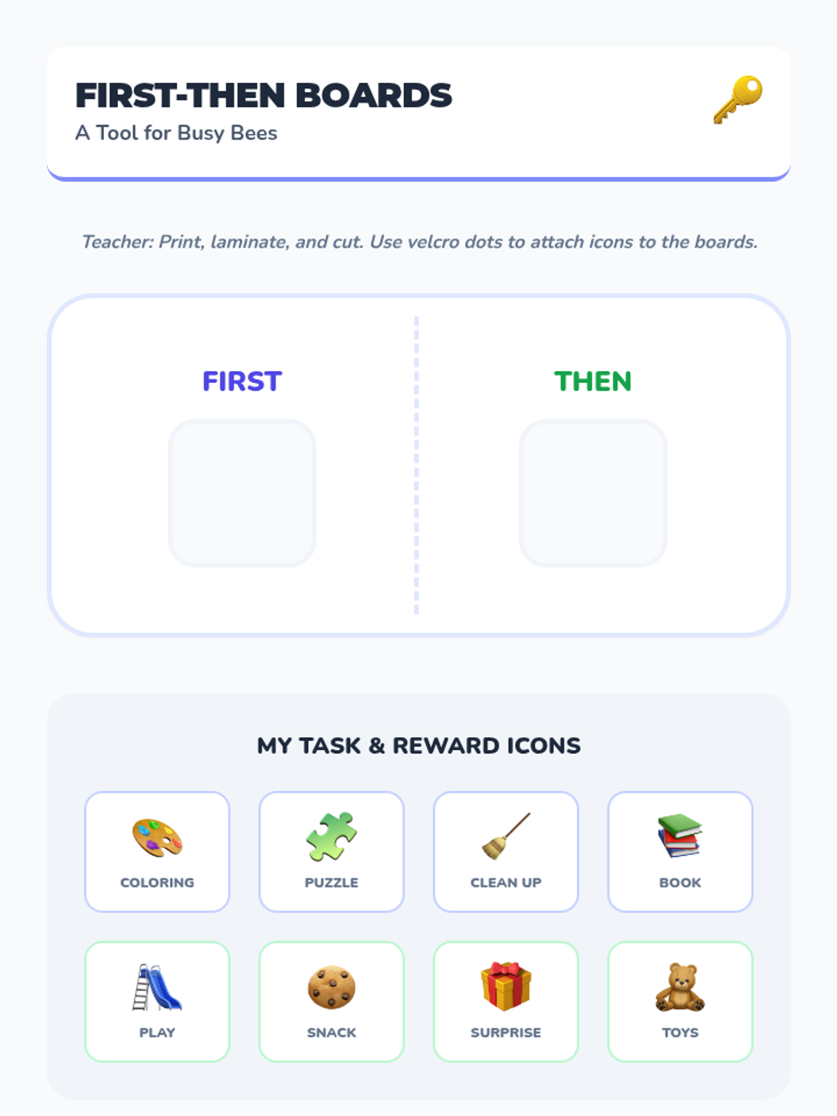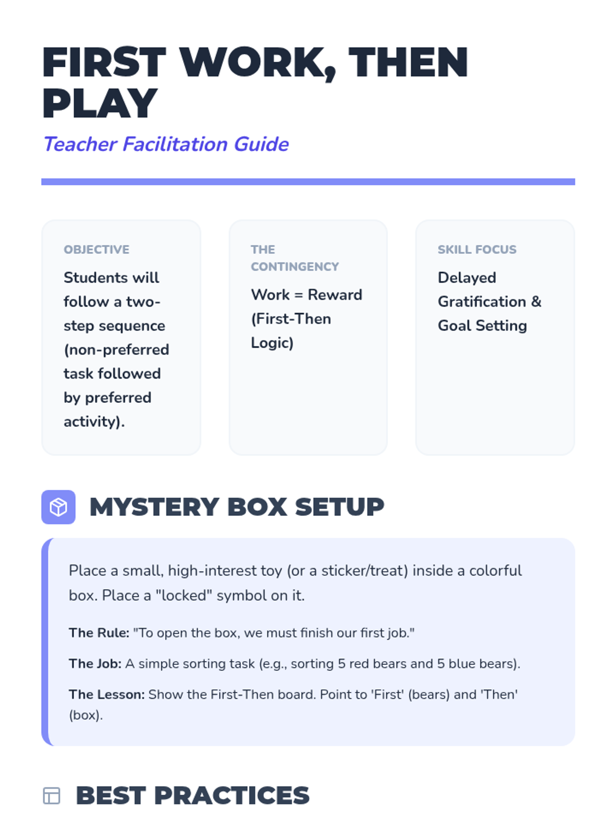 This sequence introduces Pre-K students to the foundational concepts of task persistence, utilizing visual supports and structured reinforcement to build attention stamina. Students learn to identify 'finished', use timers, manage frustration, follow 'First-Then' logic, and self-monitor their work.