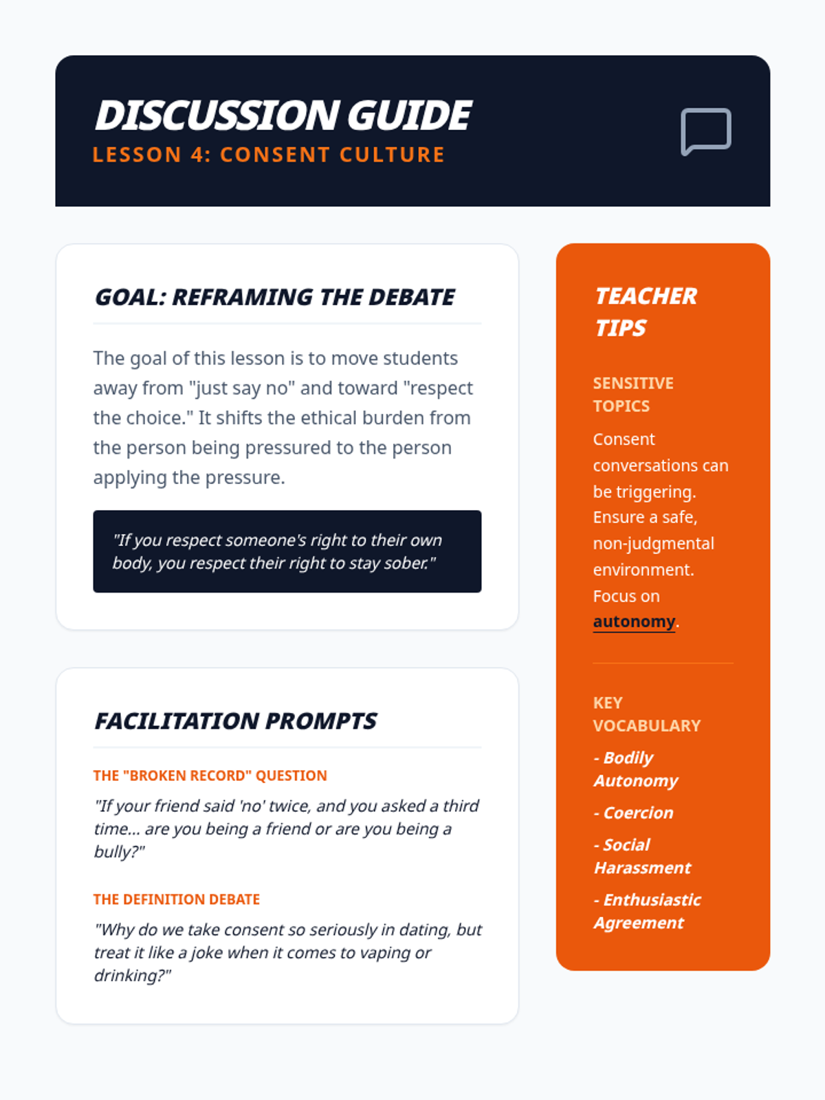 A comprehensive unit for 10th-grade students on bystander intervention, social support, and ethical responsibility in the context of substance use and peer pressure. Students transition from passive observers to active allies by mastering intervention techniques and building a culture of mutual respect.