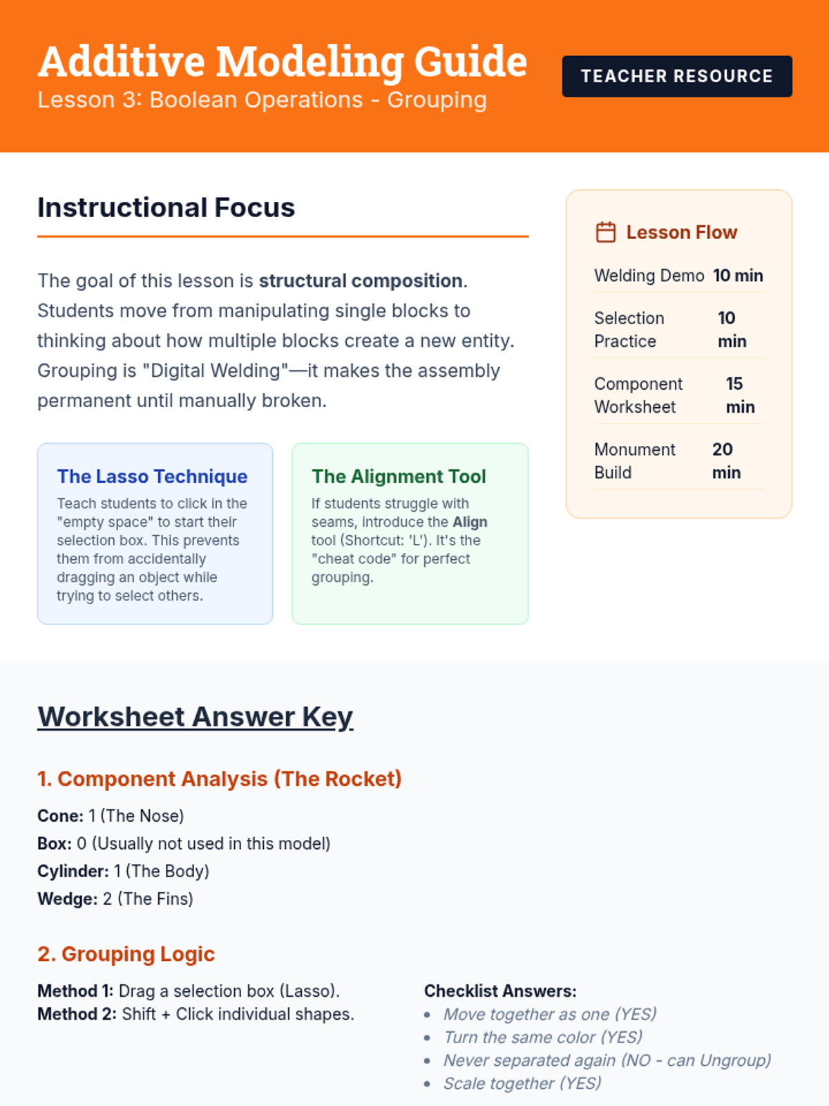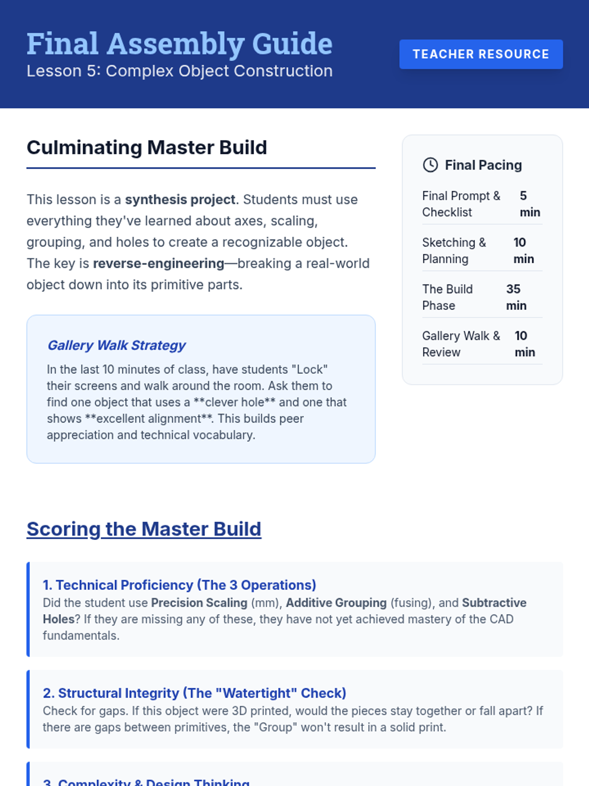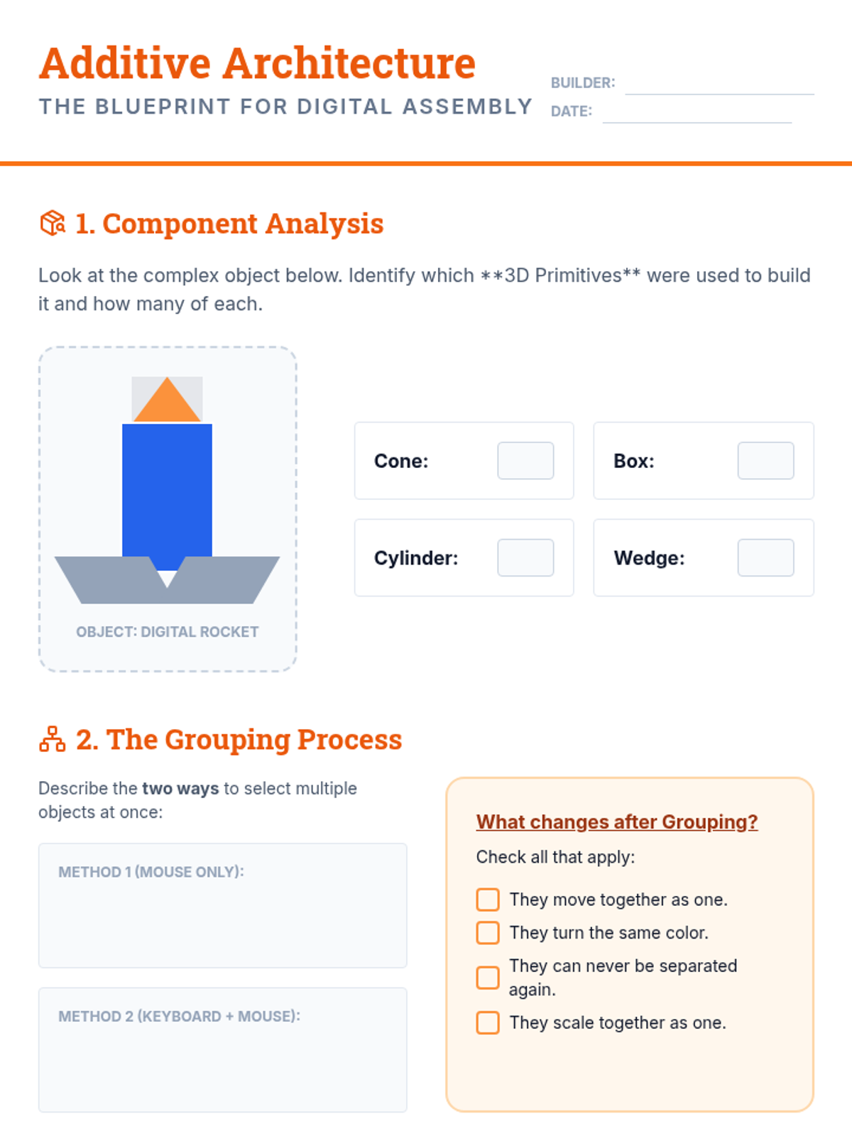A comprehensive introduction to 3D modeling for 6th graders, covering spatial navigation, precision scaling, and boolean operations to build complex digital objects.