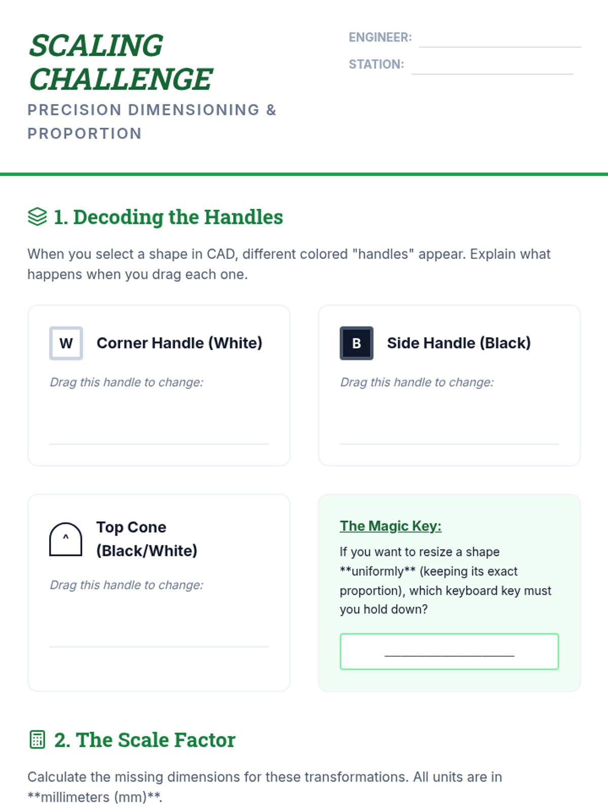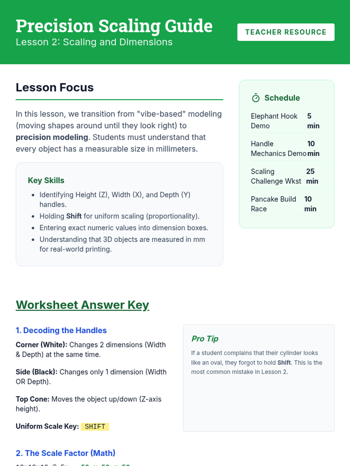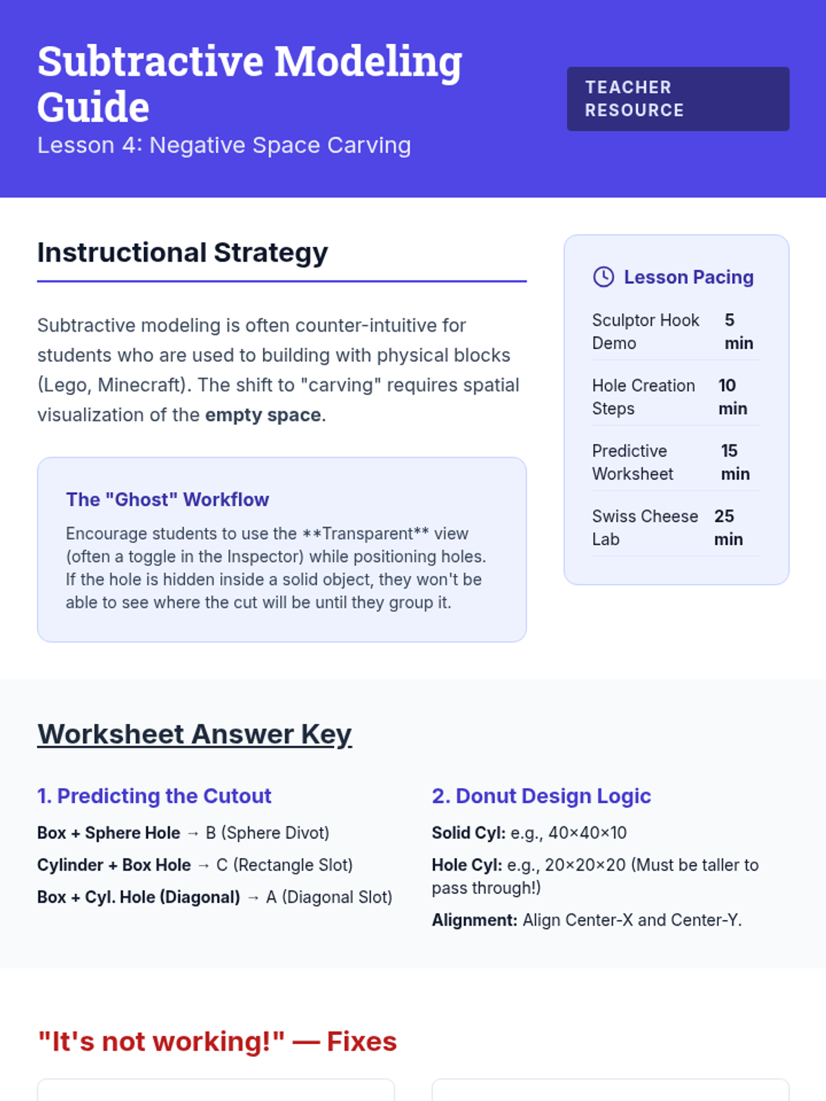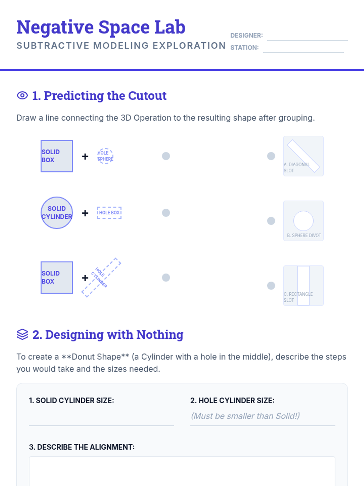 A comprehensive introduction to 3D modeling for 6th graders, covering spatial navigation, precision scaling, and boolean operations to build complex digital objects.