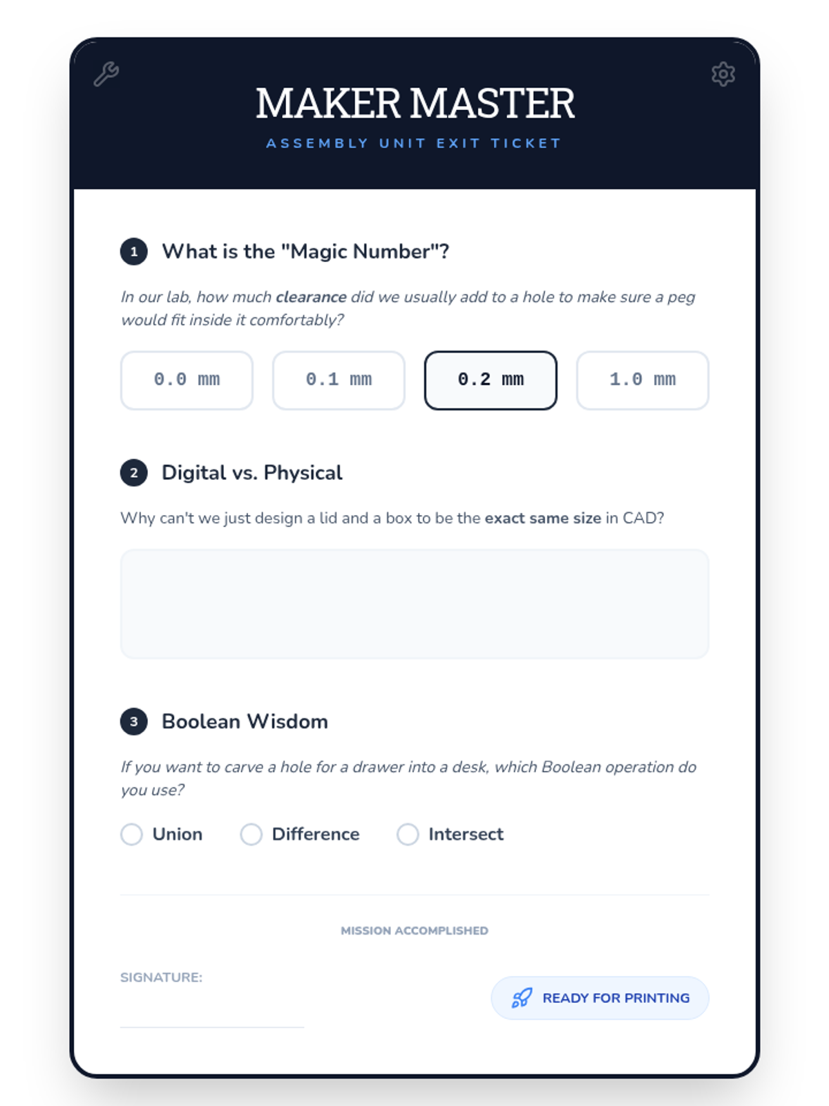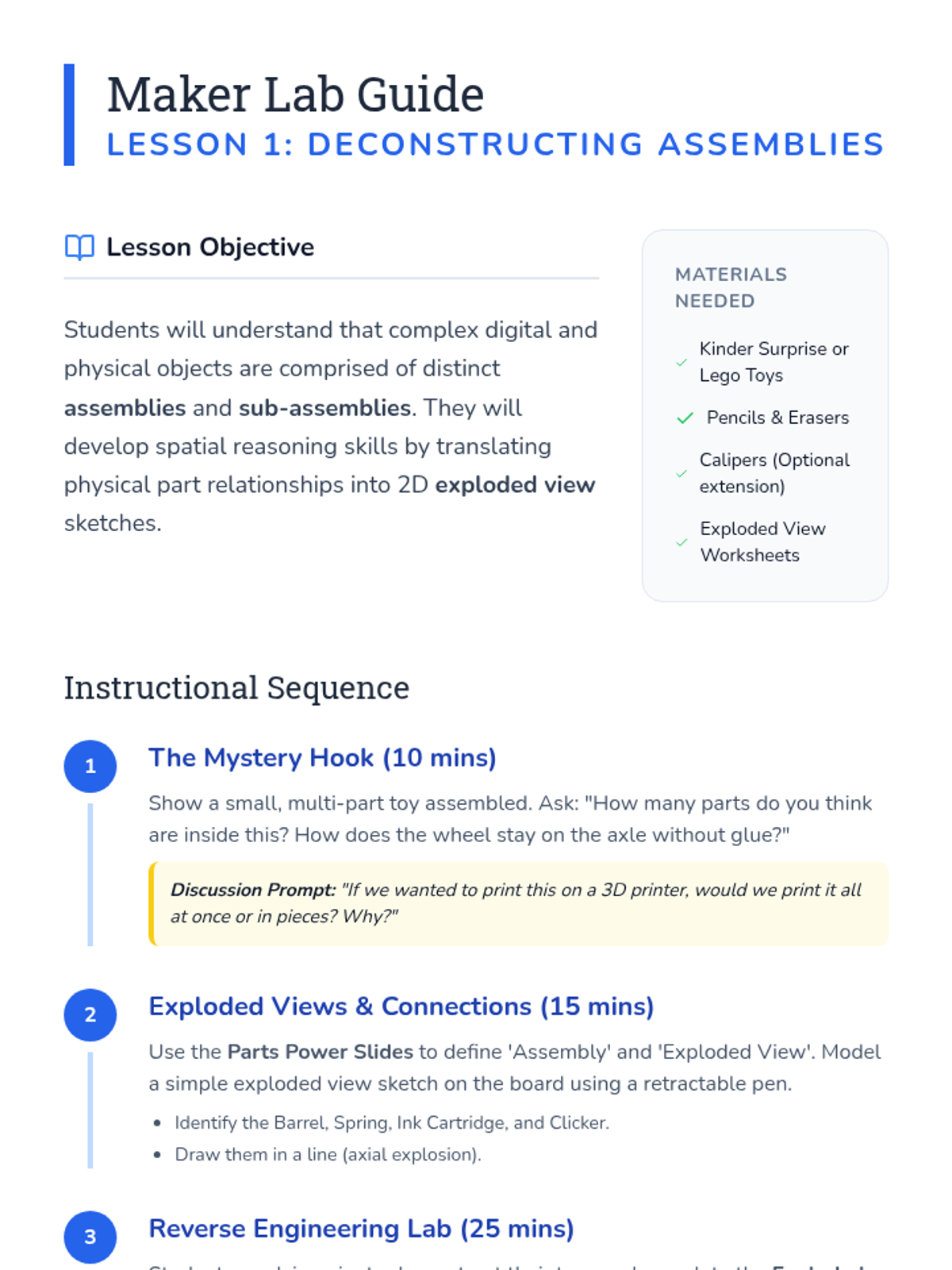 A comprehensive 4th-grade engineering sequence where students learn the fundamentals of multi-part CAD design, focusing on tolerance, clearance, and how digital models translate to physical objects. Learners move from deconstructing toys to designing functional interlocking boxes.